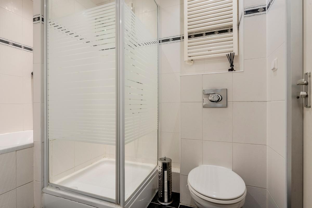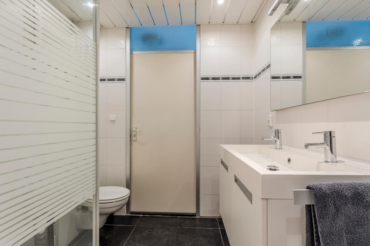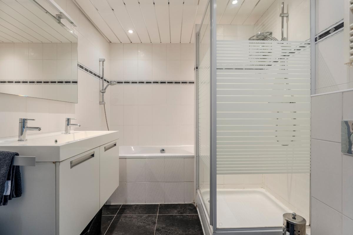 Ruime, moderne badkamer, voorzien van een ligbad, douchecabine, modern badmeubel met 2x vaste wastafel en een "zwevend" 2e toilet. Geheel betegeld met een zwarte vloertegel en een lichte wandtegel.