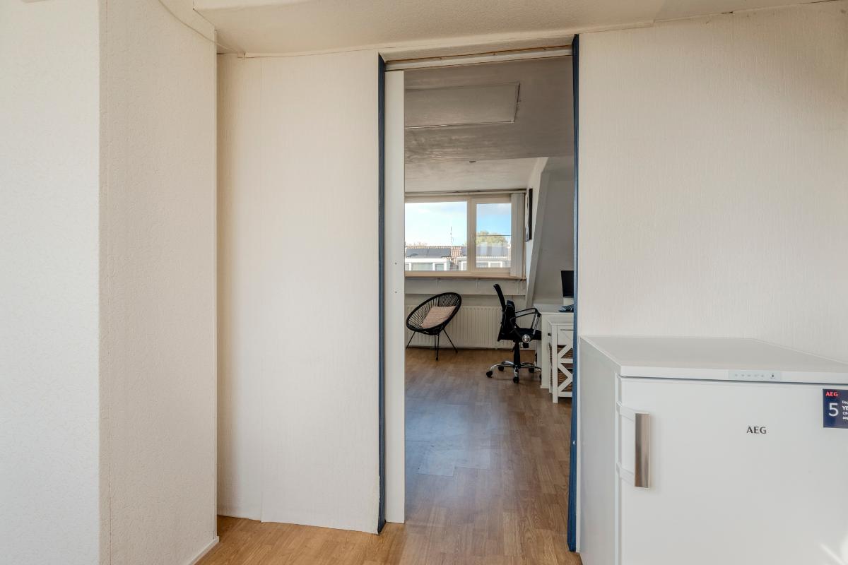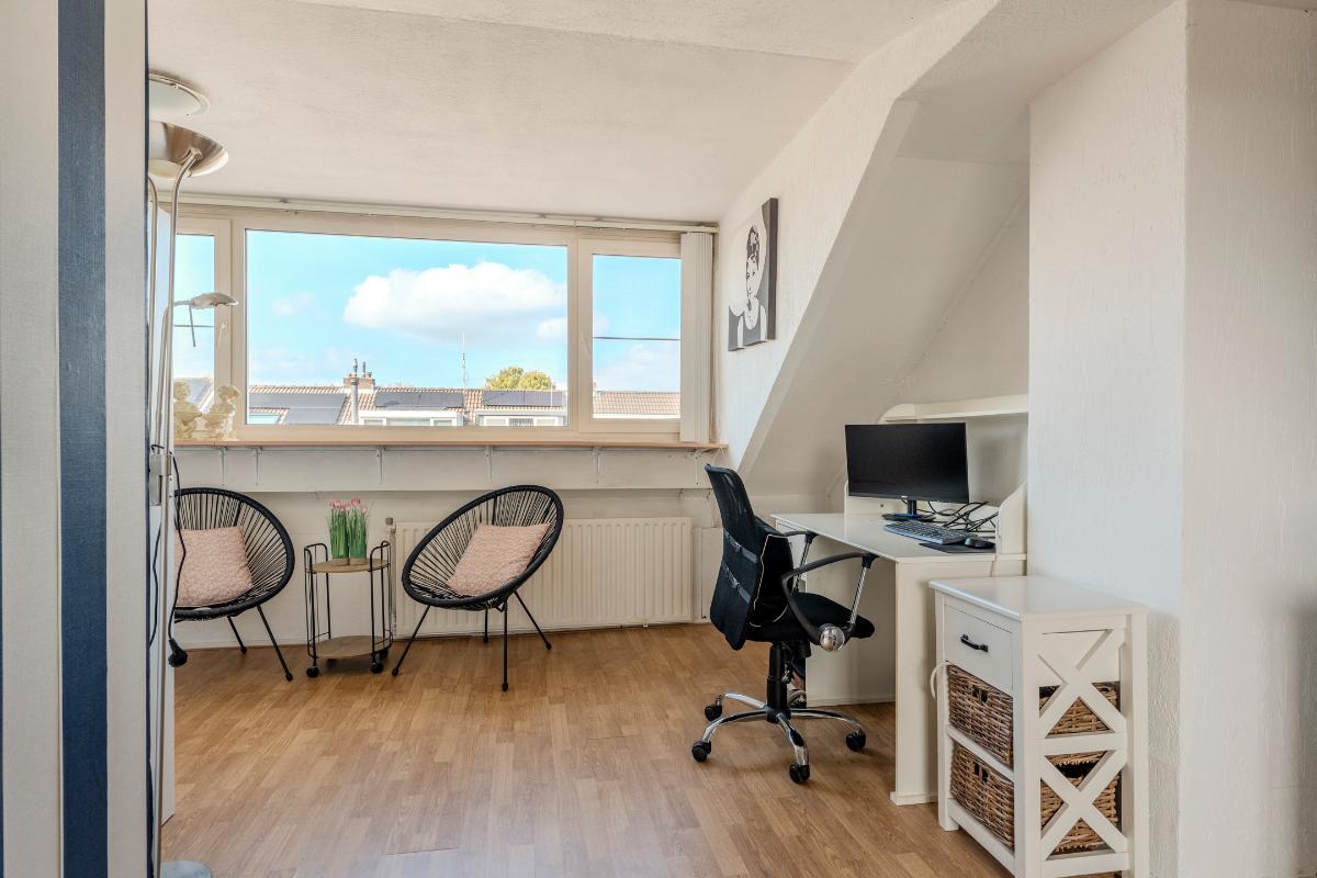 Aan de achterzijde is een mooie, ruime zolderkamer, welke is voorzien van een kunststof dakkapel, granol wandafwerking en een laminaatvloer.