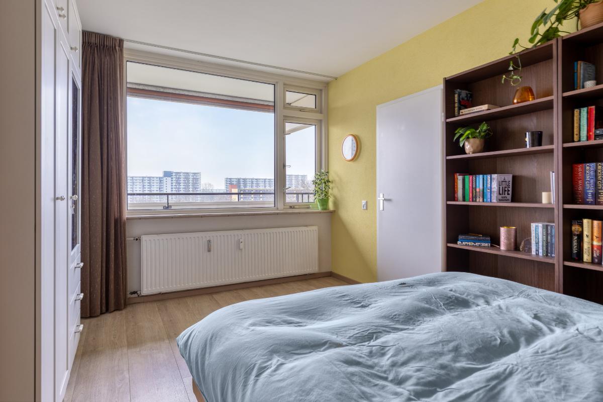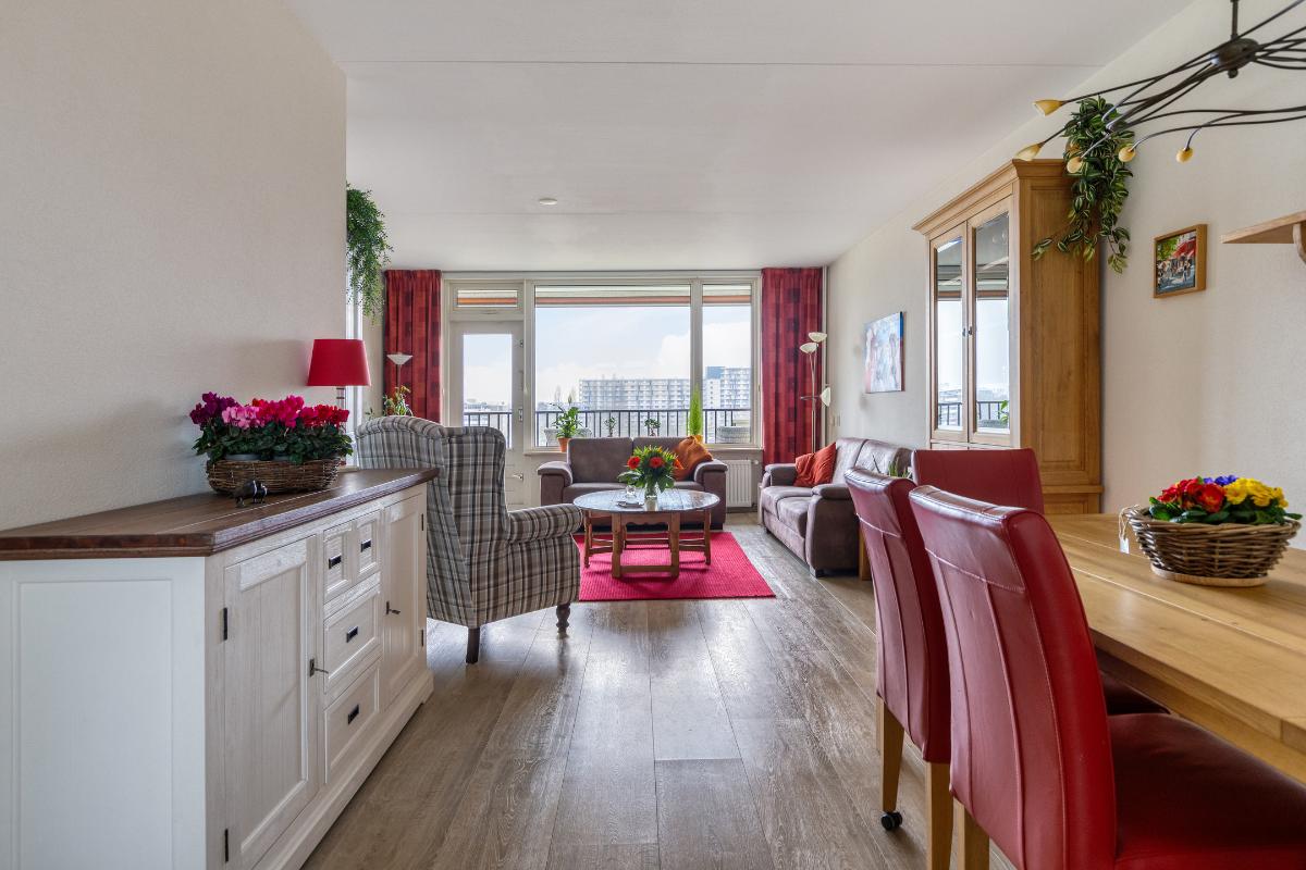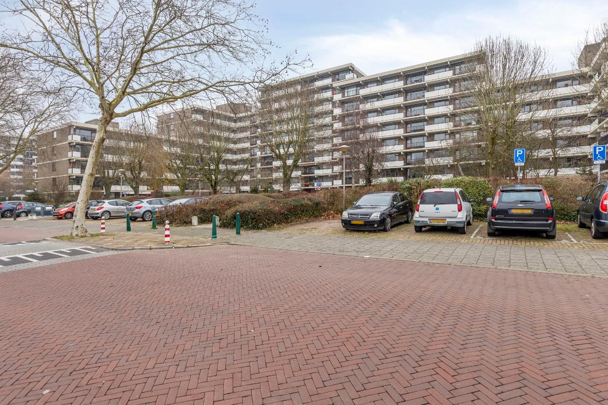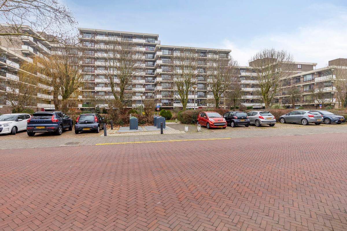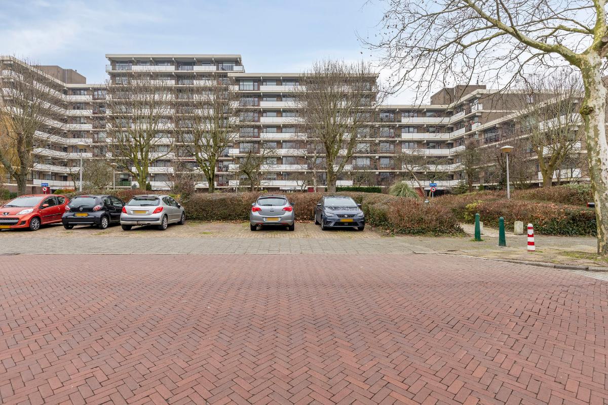 Indeling: Gesloten centrale entree/hal met lift en trappenhuis. Entree/hal van het appartement in het portiek op de zesde verdieping. In de hal bevinden zich een ruime berging en garderobekast en de toiletruimte. Royale L-vormige woonkamer met een deur naar aangrenzende werk- of slaapkamer, een screen en een deur naar het balkon op het zuidwesten. De keuken is voorzien van een moderne inrichting met inbouwapparatuur waaronder een gaskookplaat, afzuigkap, koelkast, vriezer en combioven. Vanuit de keuken is het (zeem)balkon aan de achterzijde te bereiken. Aan de voorzijde is de hoofdslaapkamer gelegen met toegang tot de badkamer welke is voorzien van een nette inrichting met onder meer douchecabine, wastafelmeubel en aansluitingen voor wasmachine en droger. Aan de achterzijde is nog een derde slaapkamer. Tevens beschikt het appartement over een eigen berging in de onderbouw en een parkeerplaats.