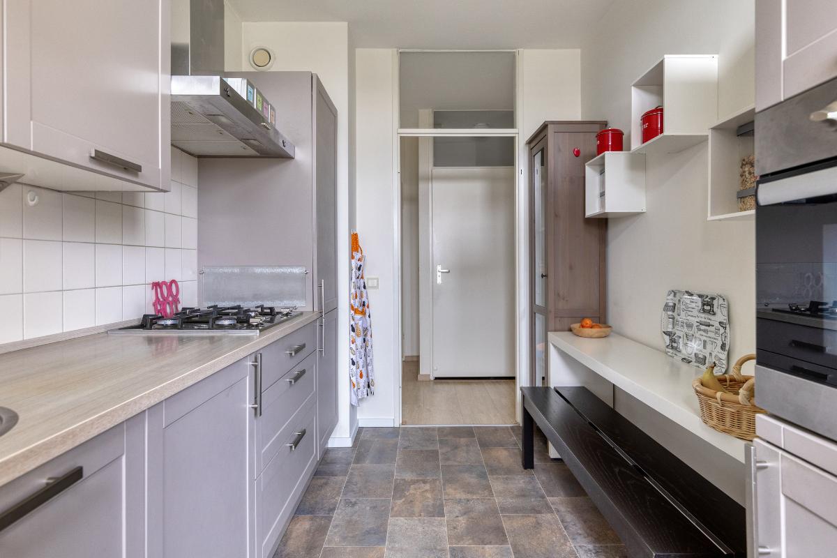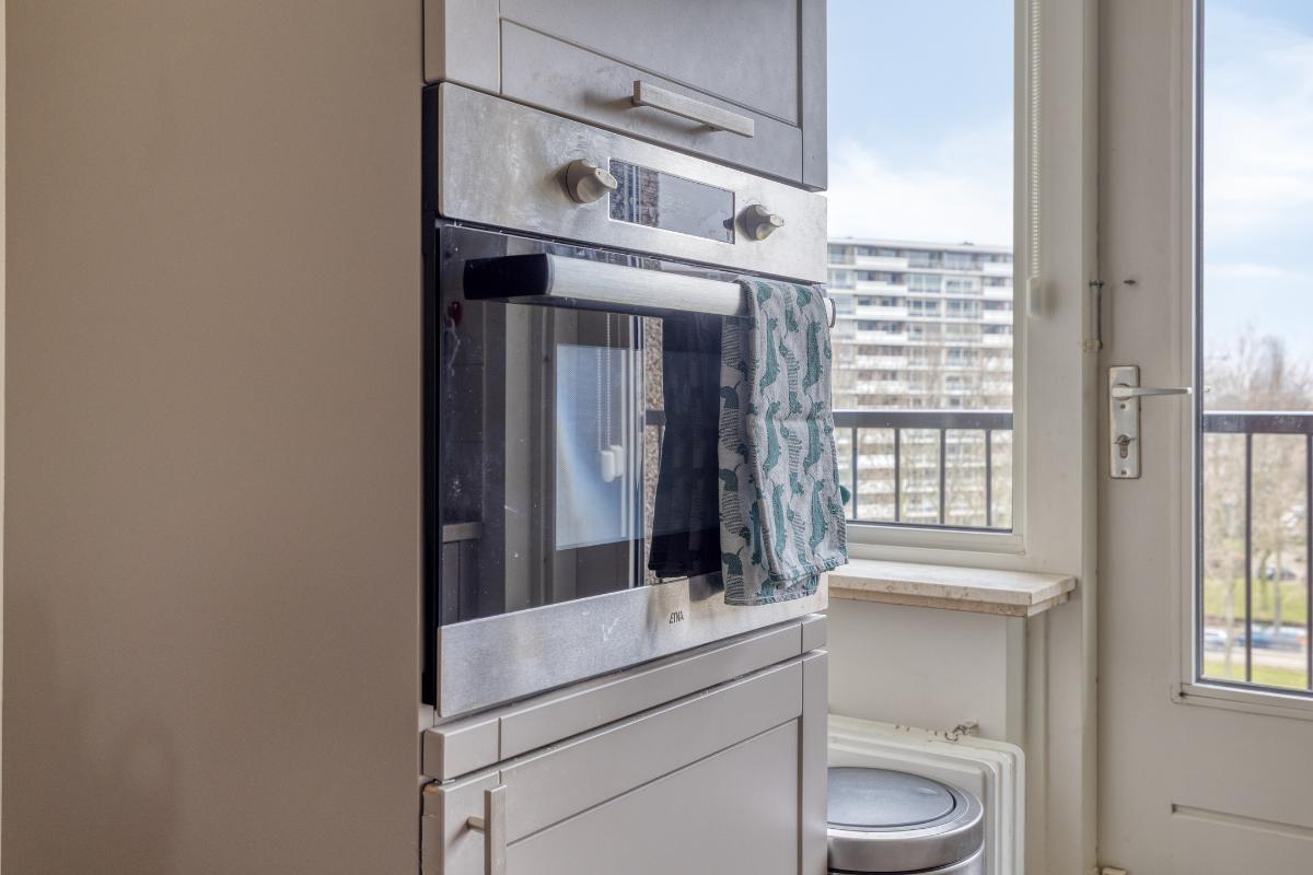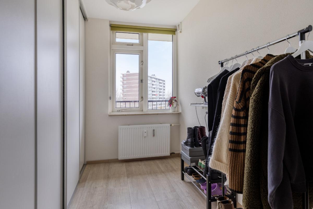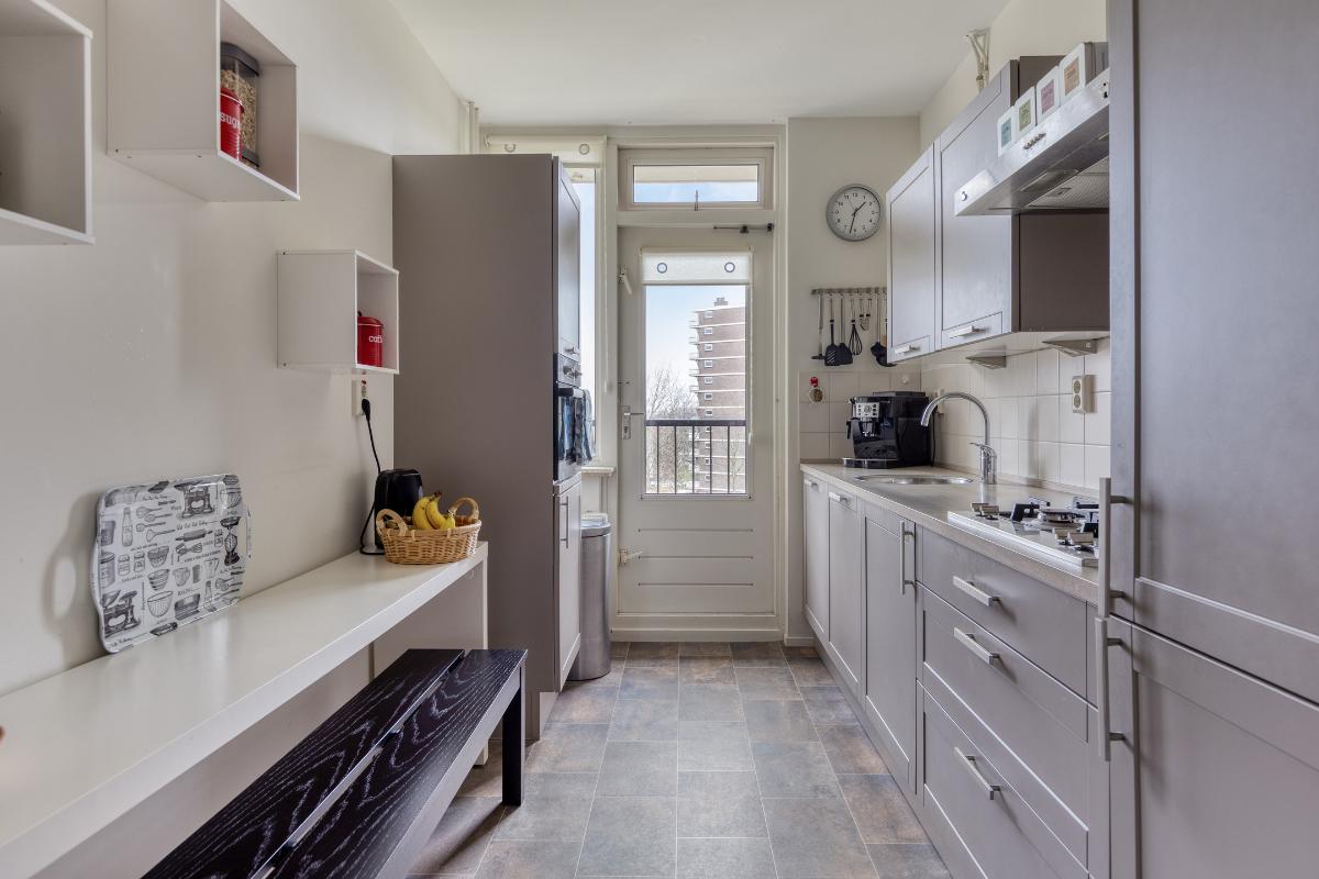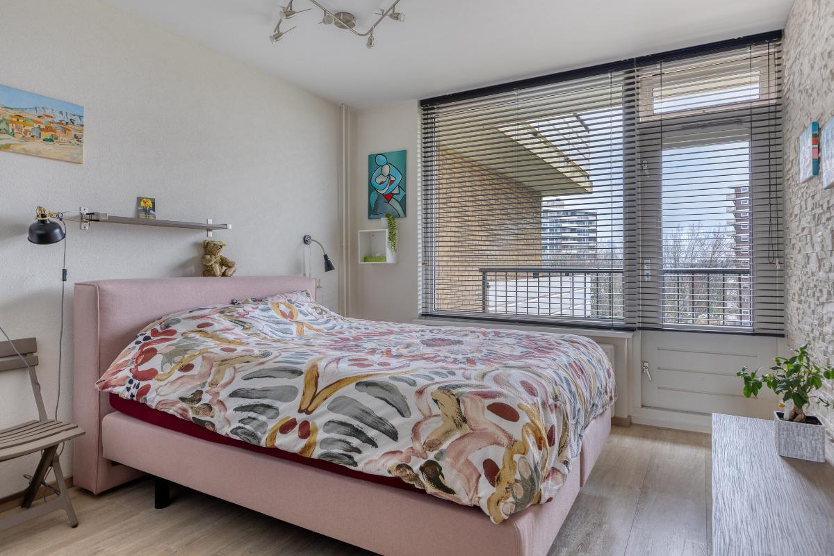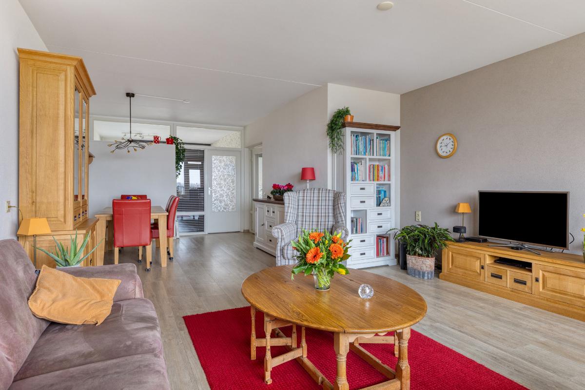 Indeling: Gesloten centrale entree/hal met lift en trappenhuis. Entree/hal van het appartement in het portiek op de zesde verdieping. In de hal bevinden zich een ruime berging en garderobekast en de toiletruimte. Royale L-vormige woonkamer met een deur naar aangrenzende werk- of slaapkamer, een screen en een deur naar het balkon op het zuidwesten. De keuken is voorzien van een moderne inrichting met inbouwapparatuur waaronder een gaskookplaat, afzuigkap, koelkast, vriezer en combioven. Vanuit de keuken is het (zeem)balkon aan de achterzijde te bereiken. Aan de voorzijde is de hoofdslaapkamer gelegen met toegang tot de badkamer welke is voorzien van een nette inrichting met onder meer douchecabine, wastafelmeubel en aansluitingen voor wasmachine en droger. Aan de achterzijde is nog een derde slaapkamer. Tevens beschikt het appartement over een eigen berging in de onderbouw en een parkeerplaats.