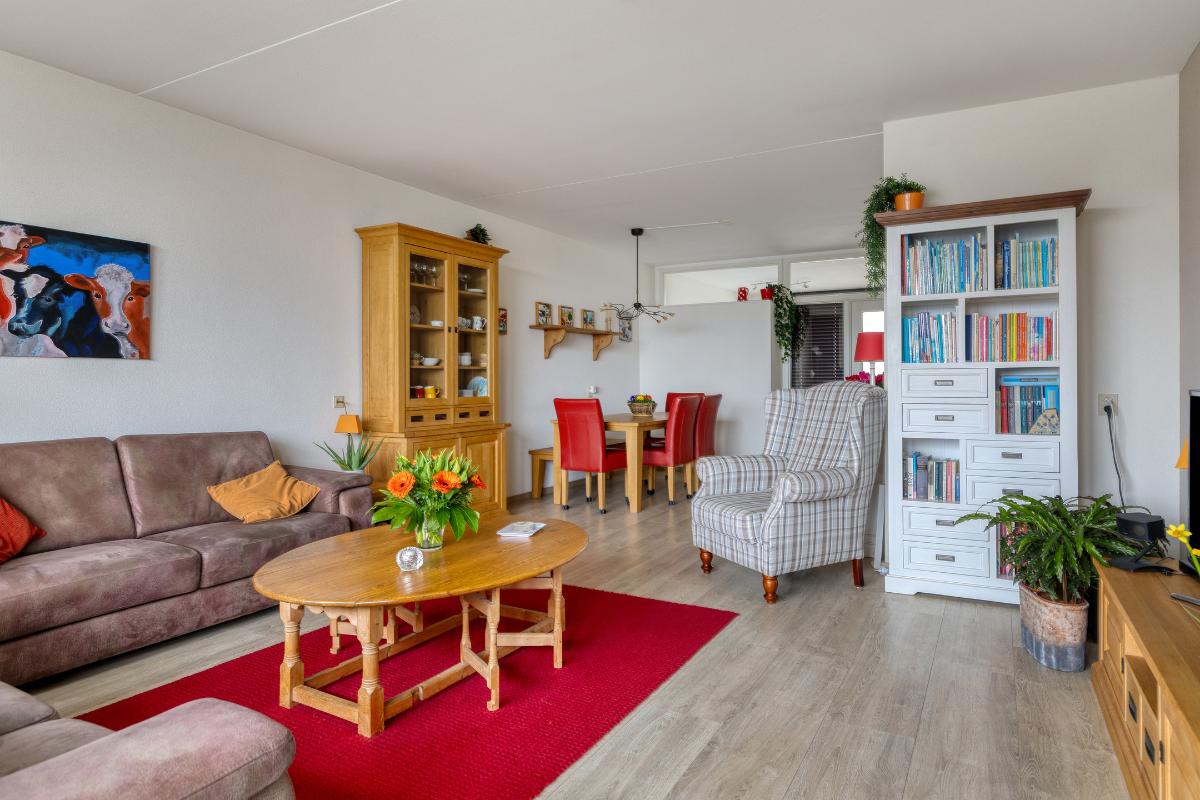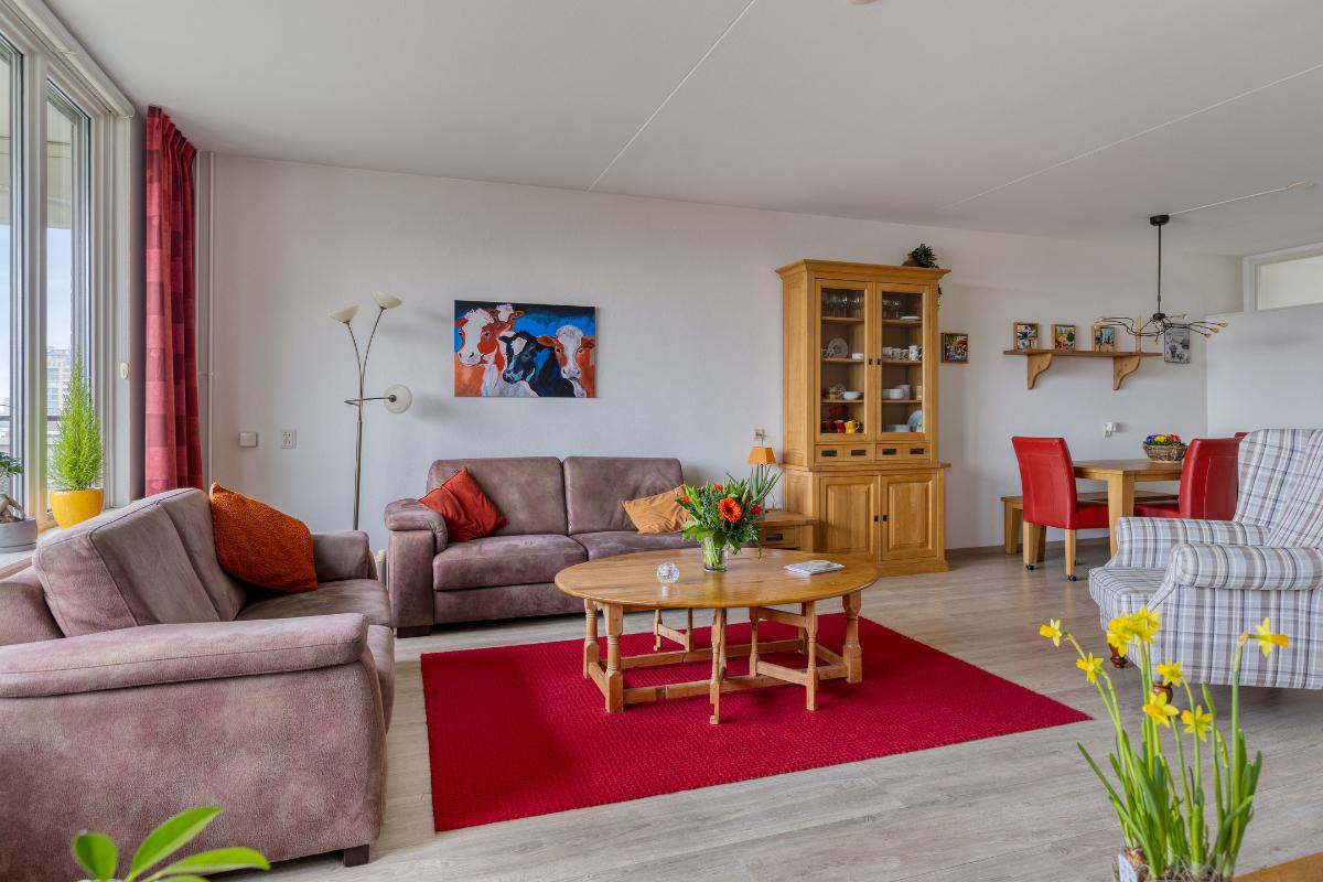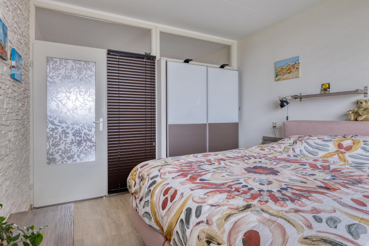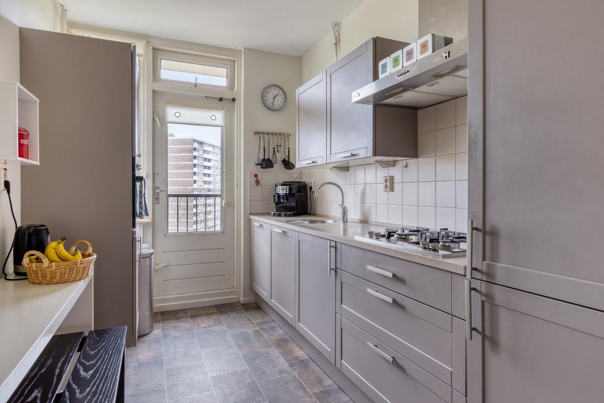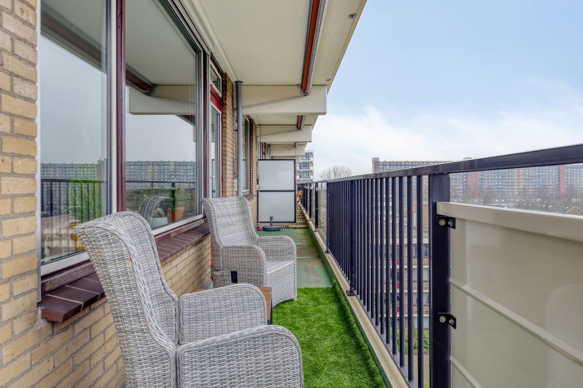 Indeling: Gesloten centrale entree/hal met lift en trappenhuis. Entree/hal van het appartement in het portiek op de zesde verdieping. In de hal bevinden zich een ruime berging en garderobekast en de toiletruimte. Royale L-vormige woonkamer met een deur naar aangrenzende werk- of slaapkamer, een screen en een deur naar het balkon op het zuidwesten. De keuken is voorzien van een moderne inrichting met inbouwapparatuur waaronder een gaskookplaat, afzuigkap, koelkast, vriezer en combioven. Vanuit de keuken is het (zeem)balkon aan de achterzijde te bereiken. Aan de voorzijde is de hoofdslaapkamer gelegen met toegang tot de badkamer welke is voorzien van een nette inrichting met onder meer douchecabine, wastafelmeubel en aansluitingen voor wasmachine en droger. Aan de achterzijde is nog een derde slaapkamer. Tevens beschikt het appartement over een eigen berging in de onderbouw en een parkeerplaats.