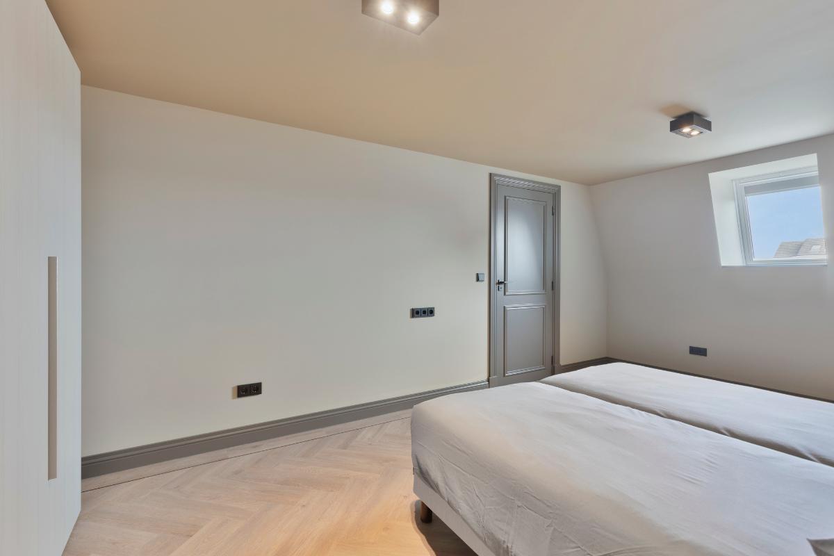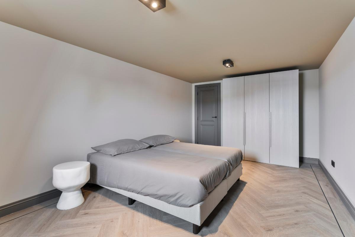 De grootte slaapkamer heeft een maatvoering van 16,5 m2 en is voorzien van een 2-persoonsbed, hoge linnenkast, een lage extra kast en twee nachtkastjes.