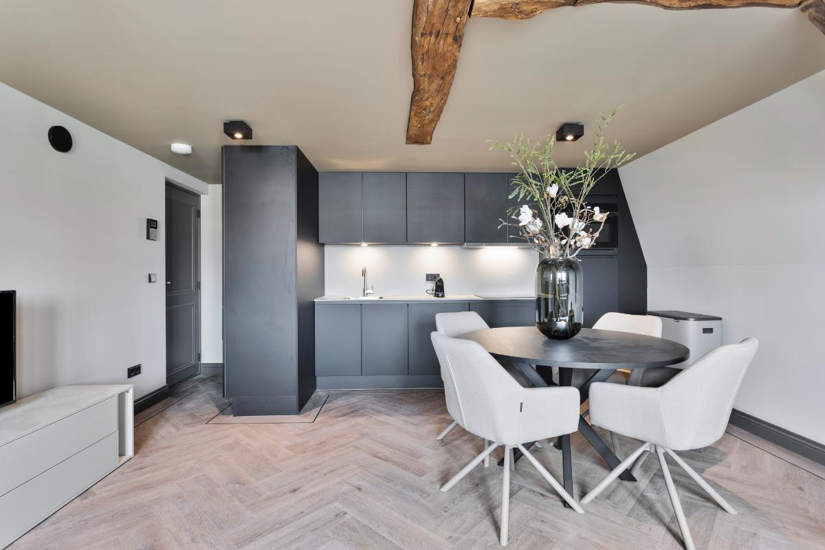 Het appartement is volledig gemeubileerd, inclusief linnengoed, en uitgerust met een moderne luxe keuken en een hoogwaardige, complete badkamer. De renovatie is uitgevoerd met veel aandacht voor stijl en afwerking, waardoor historische charme en hedendaags comfort perfect samenkomen.