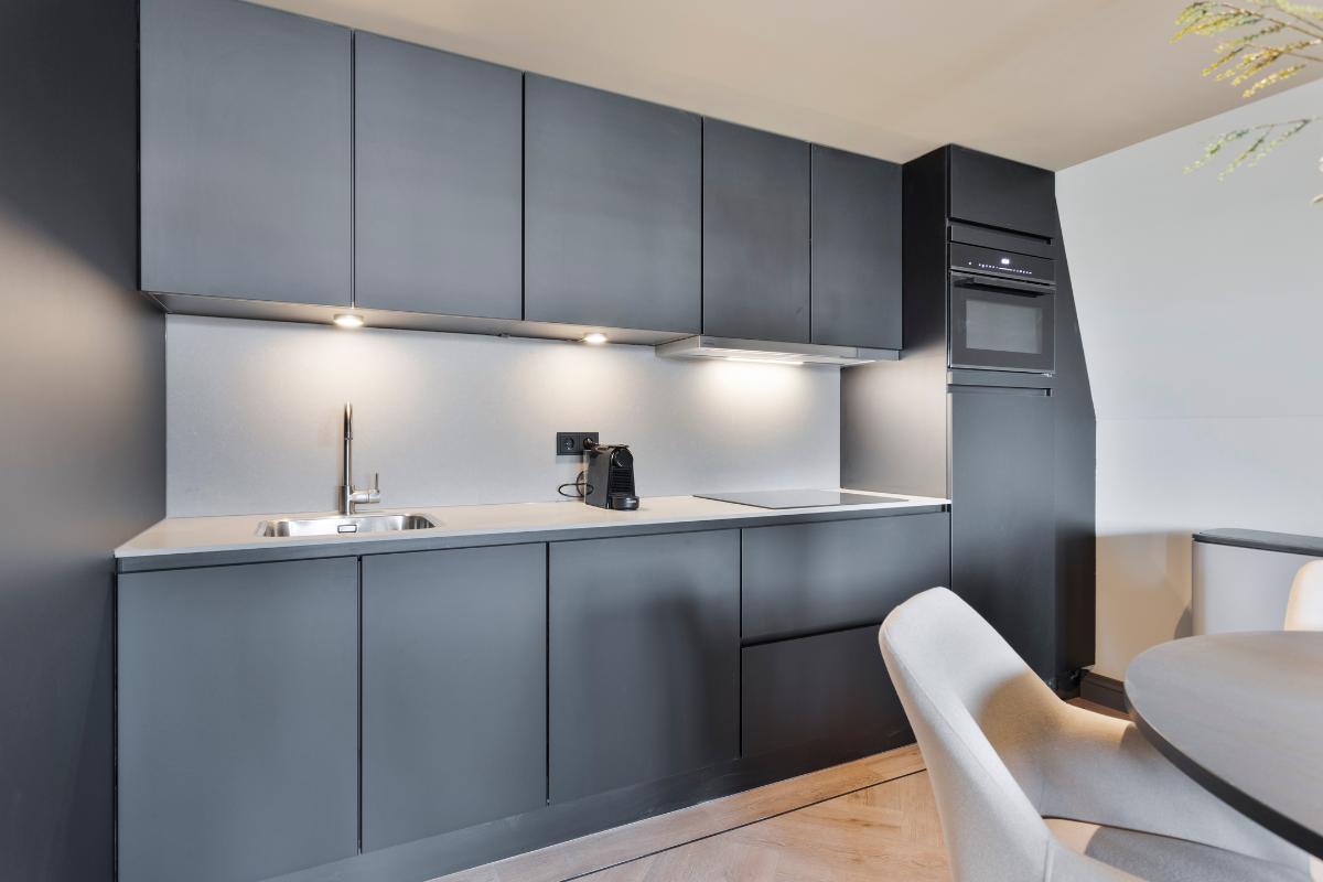 Via de eigen voordeur kom je in de woonkamer van 27 m2 waar je de volwaardige luxe afgewerkte keuken aantreft welke een breedte kent van maar liefst 4,00. De keuken is voorzien van alle inbouwapparatuur zoals een combi-oven, vaatwasser, inductiekookplaat, koelkast met vriesvak en een composieten werkblad. Voor uw gemak is tevens al het bestek, servies en overige benodigdheden al voorzien zoals een Nespresso koffieapparaat etc.