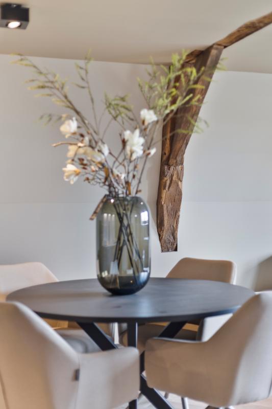 De woonkamer is verder voorzien van een 3-zits bank, een eettafel met 4 stoelen, een tv-meubel met flatscreen en diverse afwerking zoals een vloerkleed, bijzettafels en beplanting.