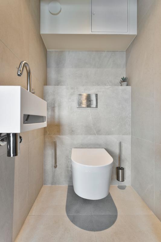De toiletruimte bevindt zich in een separaat naast de doucheruimte en is voorzien van ingebouwd toilet en een losse wastafel met mengkraan.
