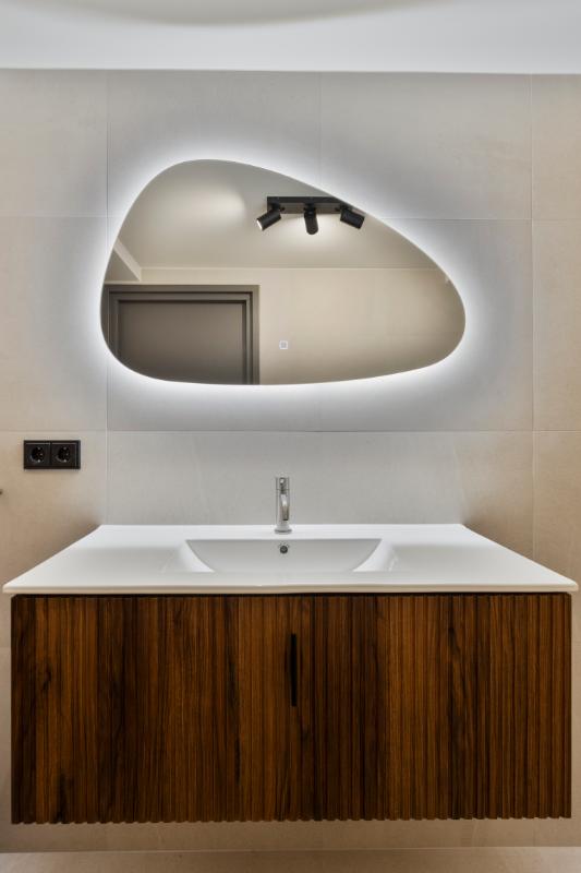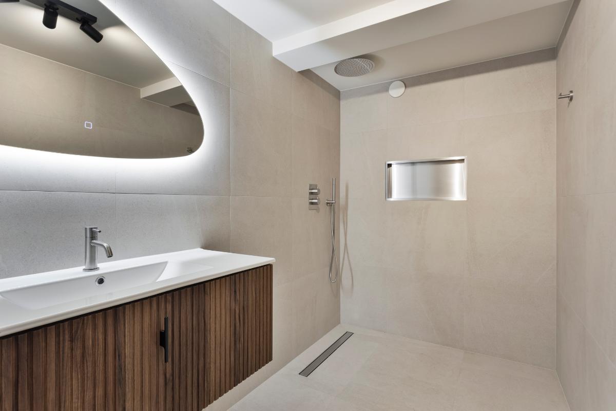De luxe badkamer is voorzien van een inloopdouche met inbouwkranen en een separaat wastafel met wasmeubel. Verder zijn hier stopcontacten aanwezig en heeft de spiegel ingebouwde verlichting met verwarming. De ruimte wordt vochtvrij gehouden middels ingebouwde ventilatiesysteem.