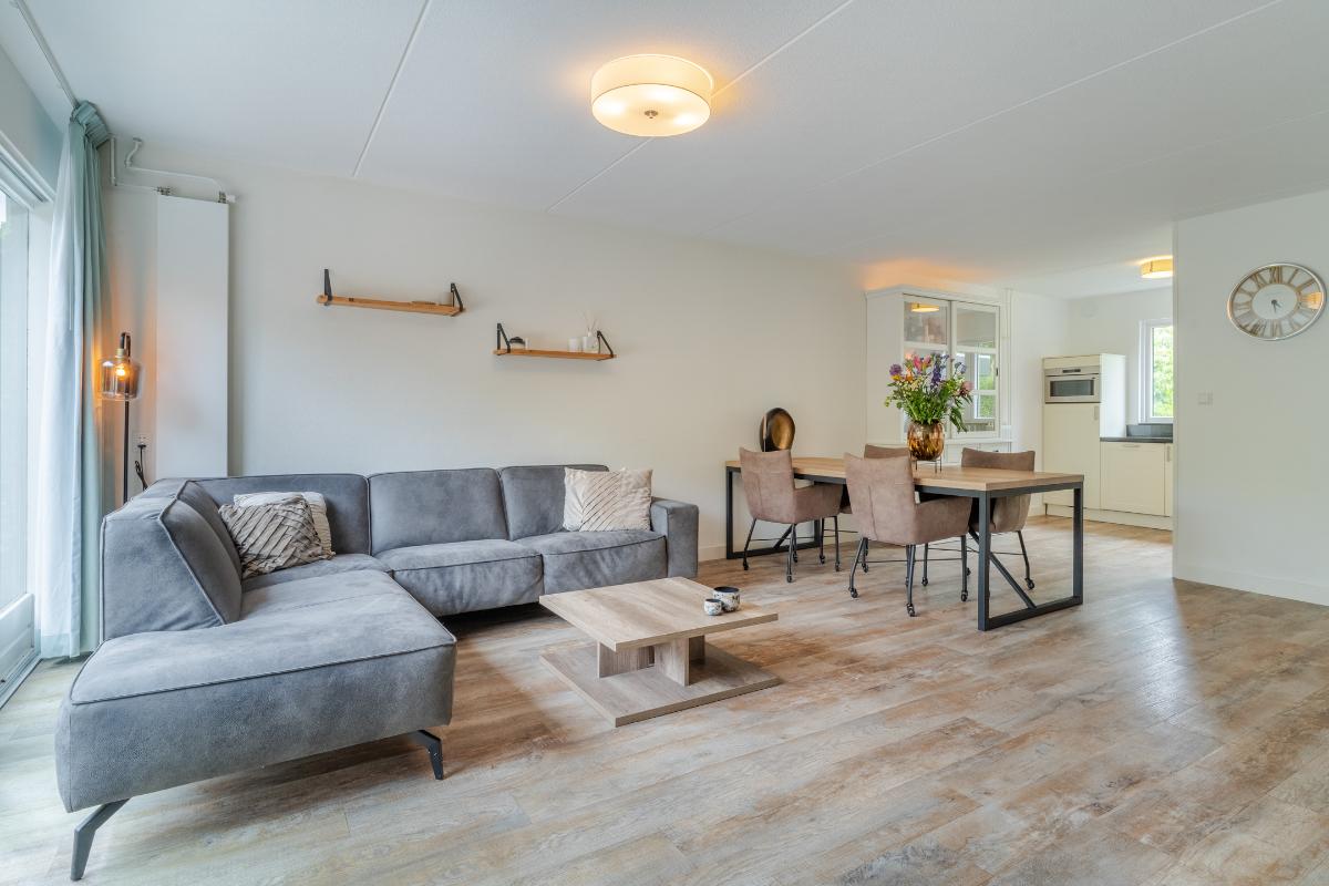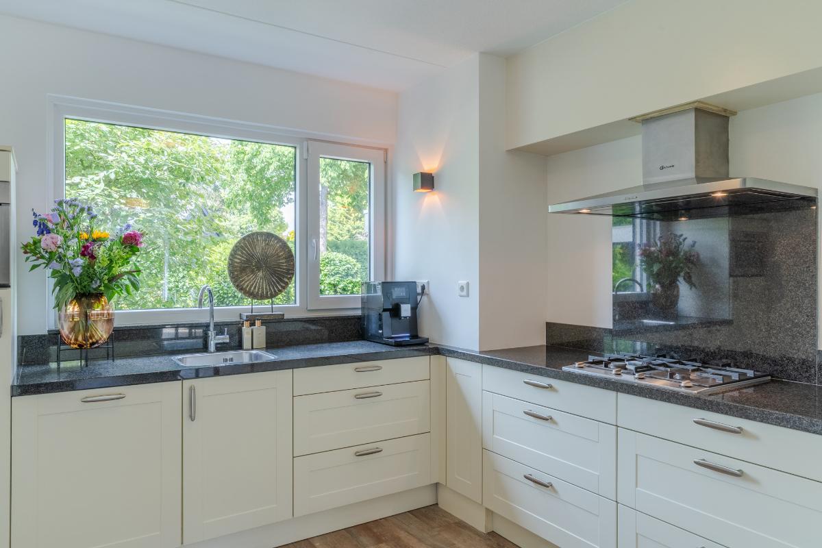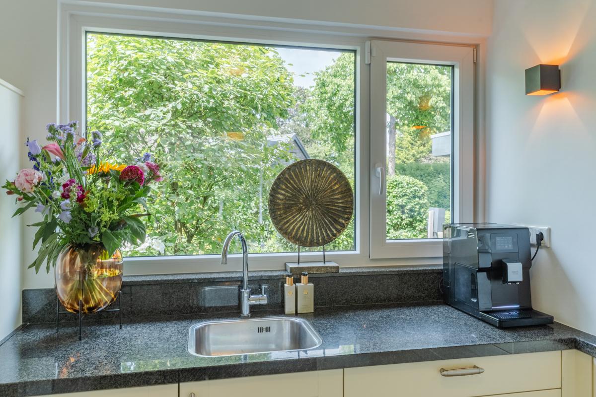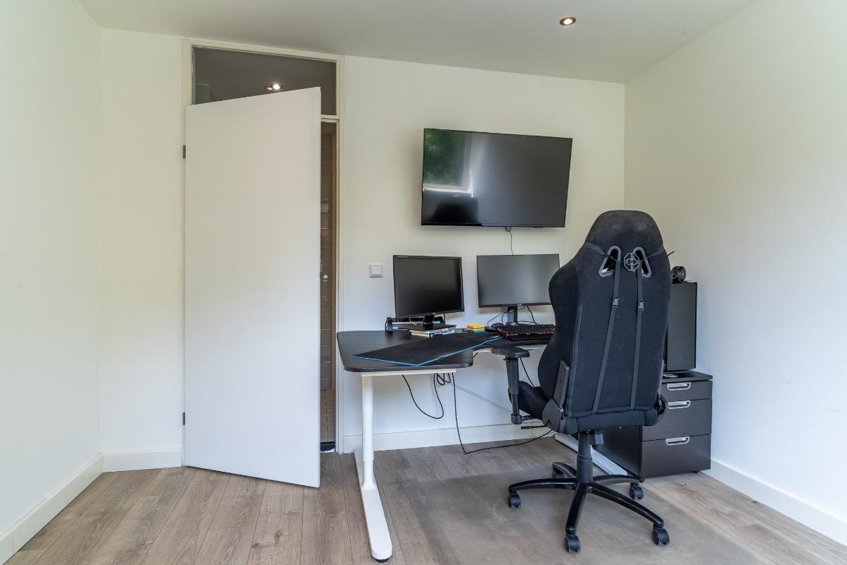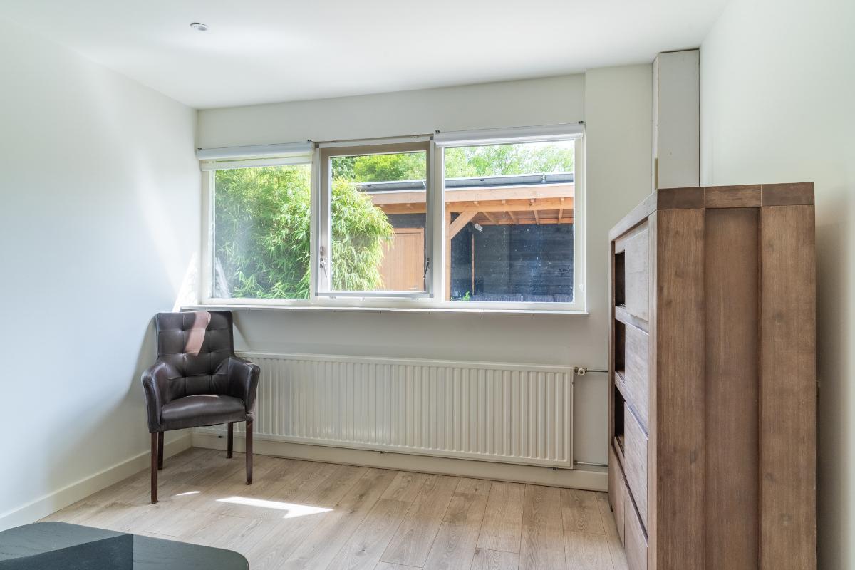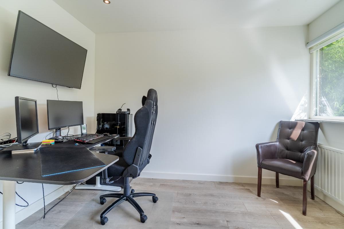 De begane grond: De begane grond is voorzien van een pvc vloer met comfortabele vloerverwarming en de wanden zijn strak gestuced. De entree, keuken en woonkamer zijn voorzien van vloerverwarming. In de entree zijn de meterkast, een modern toilet, een garderobe, de toegangsdeur naar de berging en de woonkamer en de trapopgang naar de 1e verdieping. In de woonkamer is een trapkast welke voorziet in de nodige bergruimte. De woonkamer is tuingericht en geeft via een schuifpui toegang tot de fraai aangelegde achtertuin, waar je onder de overkapping heerlijk kunt genieten van veel rust en privacy. De woonkamer wordt verwarmd door radiatoren, vloerverwarming, houtkachel en of de airco welke is gesitueerd in de trapopgang naar de 1e verdieping. De open keuken is aan de voorzijde van de woning. De keuken is voorzien van de volgende inbouwapparatuur; een 4 pits gaskookplaat, een combi-oven, een koelkast, een afzuigkap en een vaatwasser. Het keukenraam is voorzien van een rolluik. Via de inpandige berging heb je toegang tot een royale wasruimte. Deze extra ruimte is ideaal als was-/strijkkamer en/ of praktische bergruimte. Er is ook een loopdeur richting de carport. Verder is er een toegangsdeur naar de 1e badkamer welke beschikt over een douche en een 2e wasmachine aansluiting. Vanuit deze 1e badkamer heeft u toegang tot de ruimte hierachter. Deze ruimte is nu in gebruik als kantoor maar is zeker ook in gebruik te nemen als slaapkamer. Deze kamer is voorzien van een rolluik. Doordat er een badkamer beneden is en deze kamer, spreken we bij deze woning over levensloopbestendig.