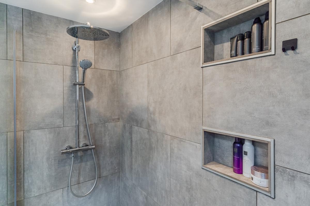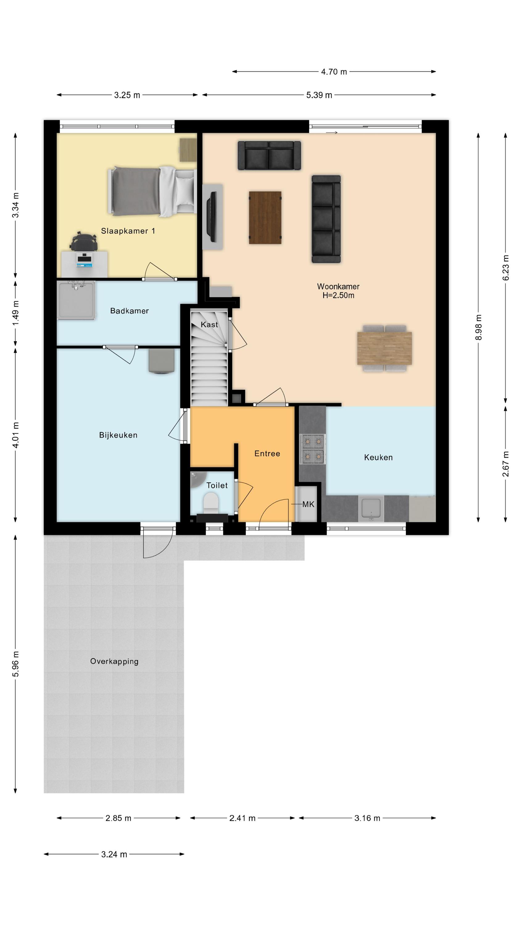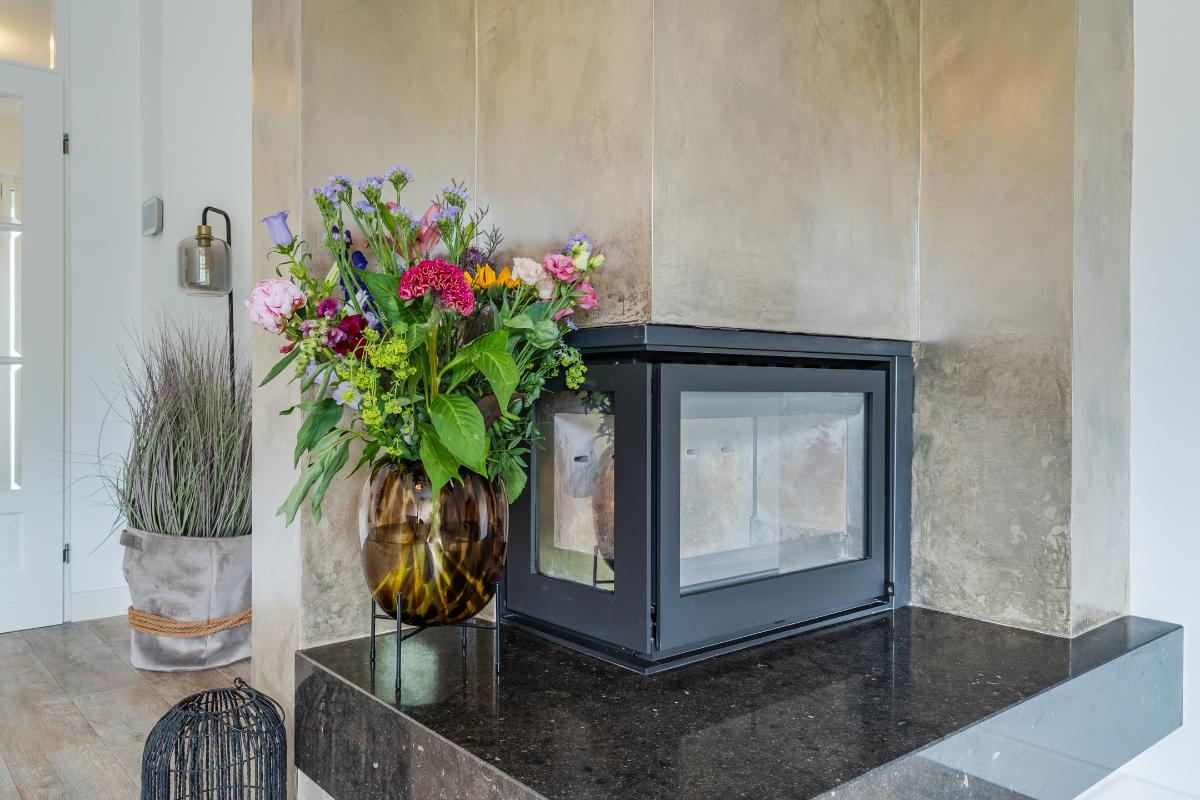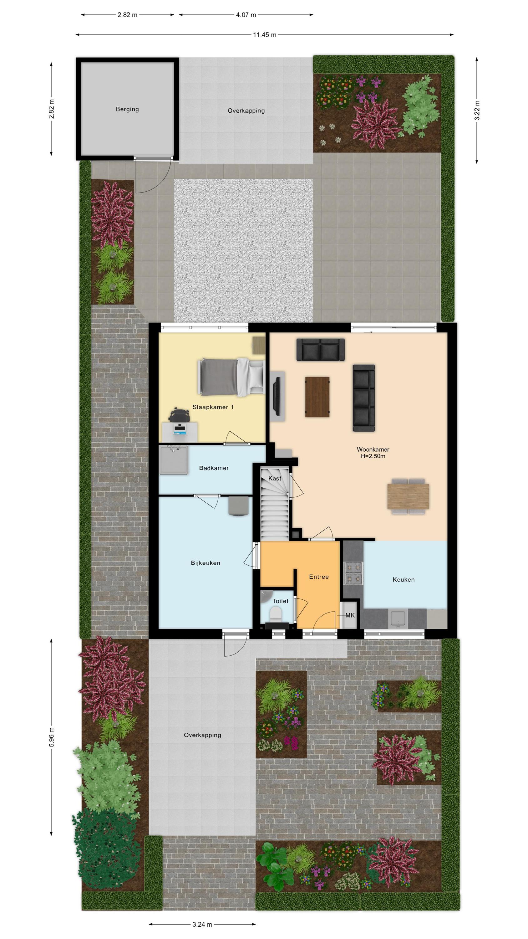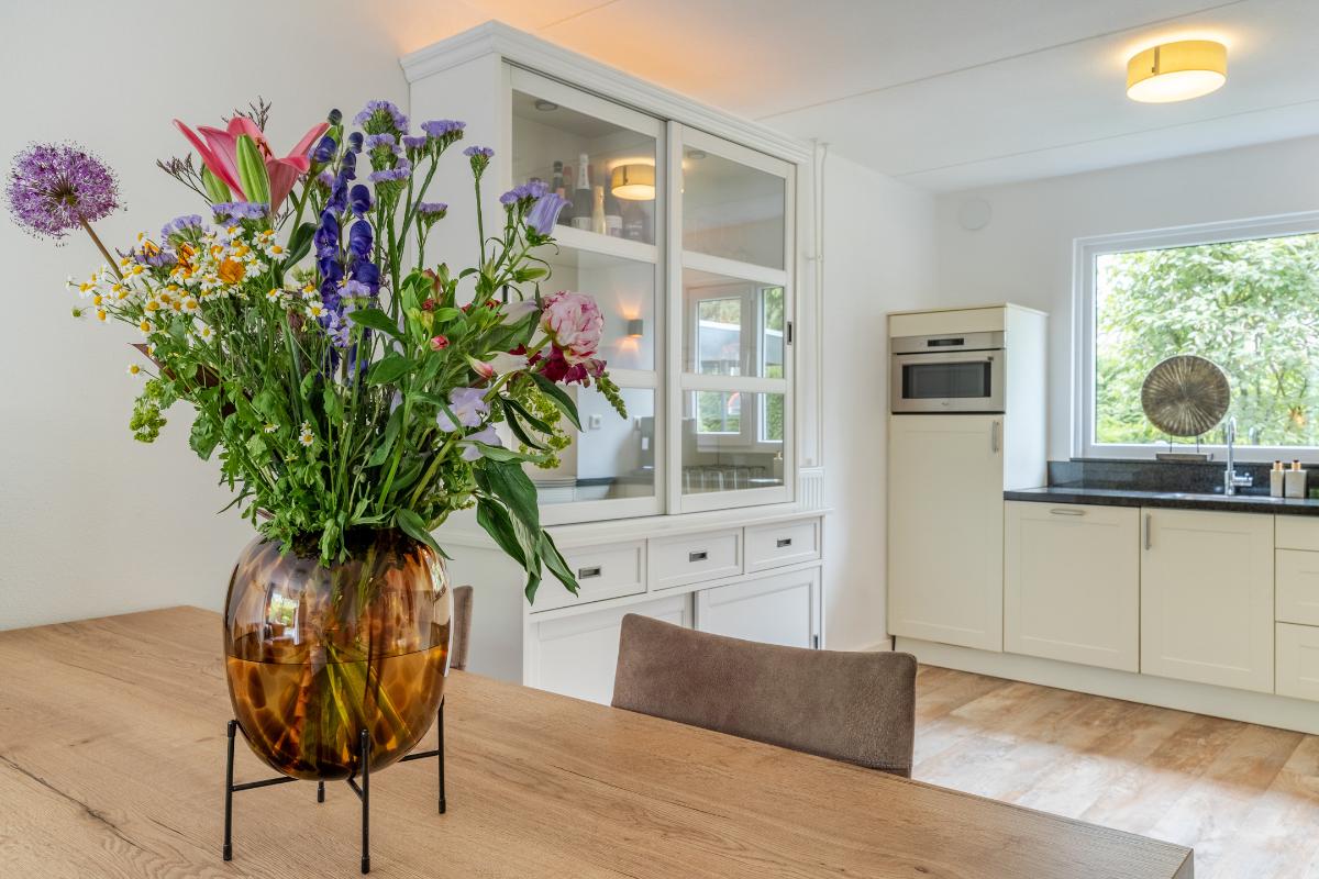 De begane grond: De begane grond is voorzien van een pvc vloer met comfortabele vloerverwarming en de wanden zijn strak gestuced. De entree, keuken en woonkamer zijn voorzien van vloerverwarming. In de entree zijn de meterkast, een modern toilet, een garderobe, de toegangsdeur naar de berging en de woonkamer en de trapopgang naar de 1e verdieping. In de woonkamer is een trapkast welke voorziet in de nodige bergruimte. De woonkamer is tuingericht en geeft via een schuifpui toegang tot de fraai aangelegde achtertuin, waar je onder de overkapping heerlijk kunt genieten van veel rust en privacy. De woonkamer wordt verwarmd door radiatoren, vloerverwarming, houtkachel en of de airco welke is gesitueerd in de trapopgang naar de 1e verdieping. De open keuken is aan de voorzijde van de woning. De keuken is voorzien van de volgende inbouwapparatuur; een 4 pits gaskookplaat, een combi-oven, een koelkast, een afzuigkap en een vaatwasser. Het keukenraam is voorzien van een rolluik. Via de inpandige berging heb je toegang tot een royale wasruimte. Deze extra ruimte is ideaal als was-/strijkkamer en/ of praktische bergruimte. Er is ook een loopdeur richting de carport. Verder is er een toegangsdeur naar de 1e badkamer welke beschikt over een douche en een 2e wasmachine aansluiting. Vanuit deze 1e badkamer heeft u toegang tot de ruimte hierachter. Deze ruimte is nu in gebruik als kantoor maar is zeker ook in gebruik te nemen als slaapkamer. Deze kamer is voorzien van een rolluik. Doordat er een badkamer beneden is en deze kamer, spreken we bij deze woning over levensloopbestendig.