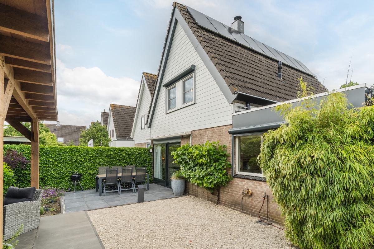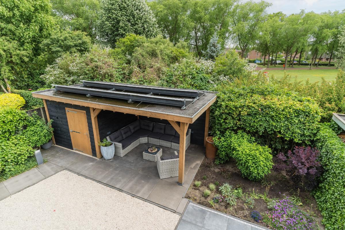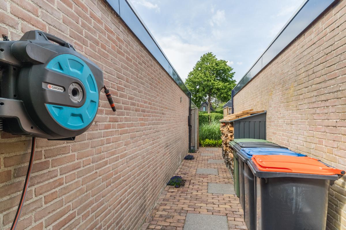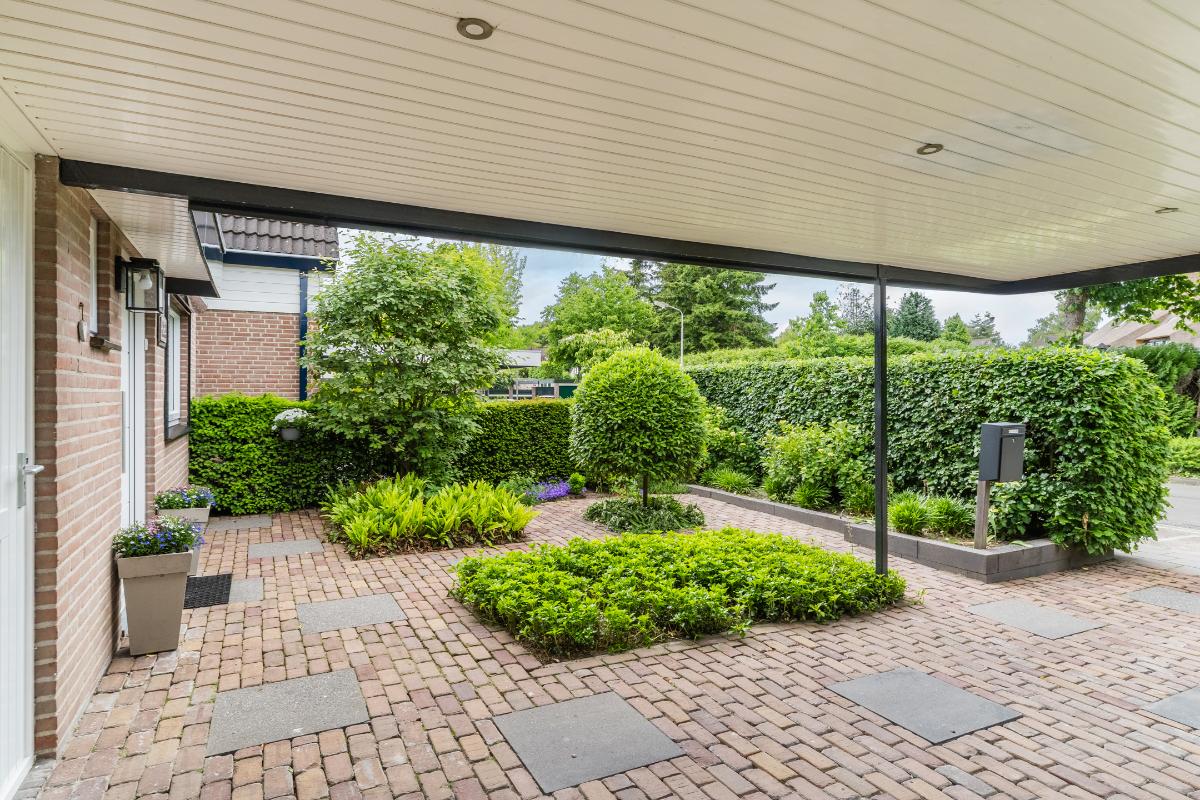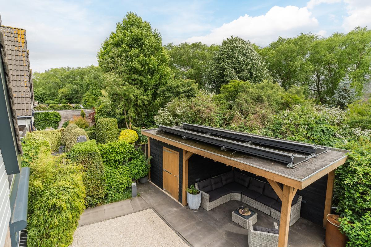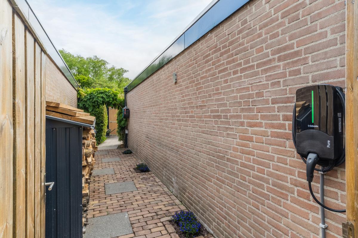 Exterieur: De groene tuin is erg sfeervol en verzorgd. Naast de overkapping is een extra berging voor opbergruimte en of fietsen etc. Tevens is er een buitenkraan. Aan de achtergevel hangt een royaal zonnescherm. Aan de zijkant van de woning loopt een pad met en eigenpoort wat zorgt voor de zogenaamde “achterom”. Hier is ook de opslag voor het haardhout en de elektrische laadpaal voor de auto.