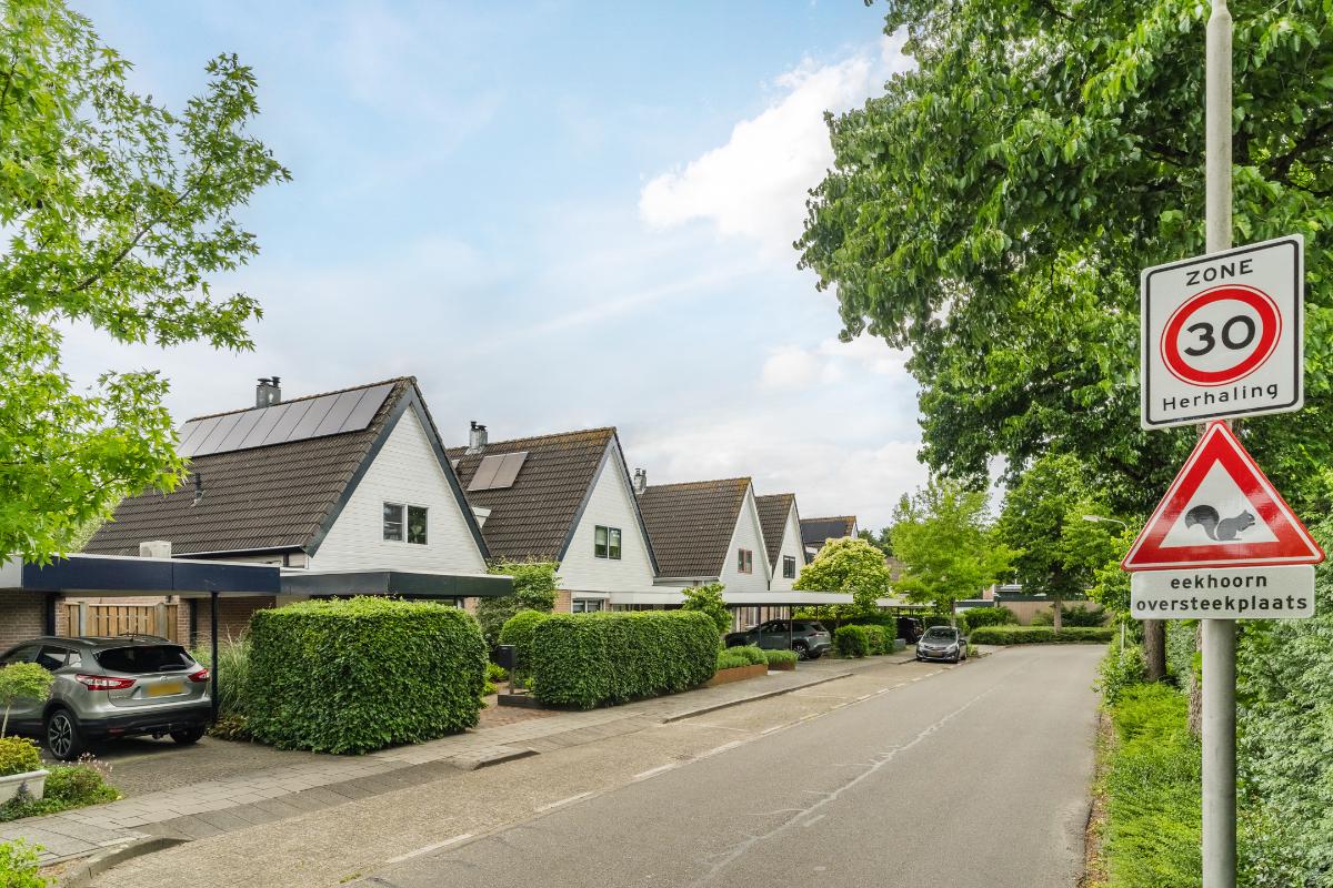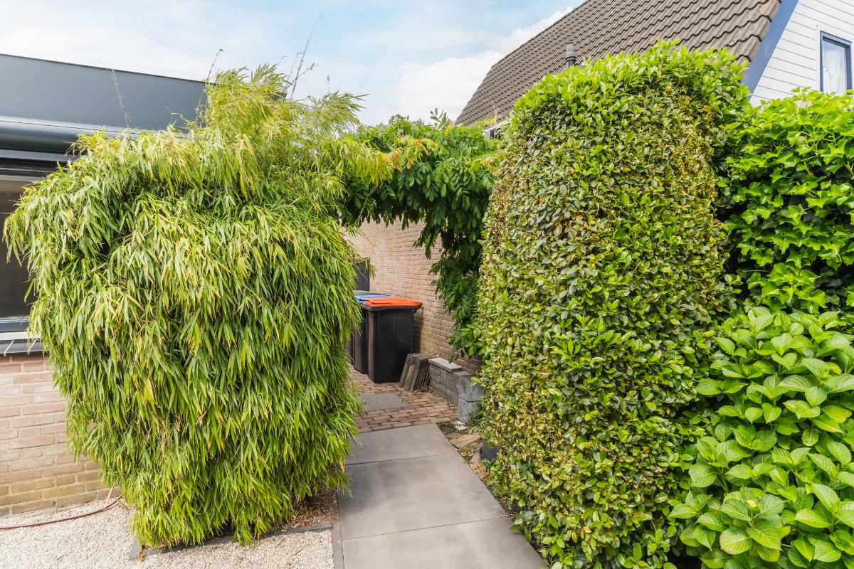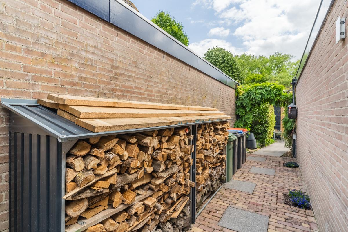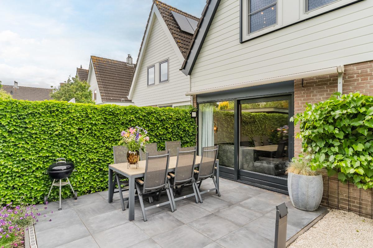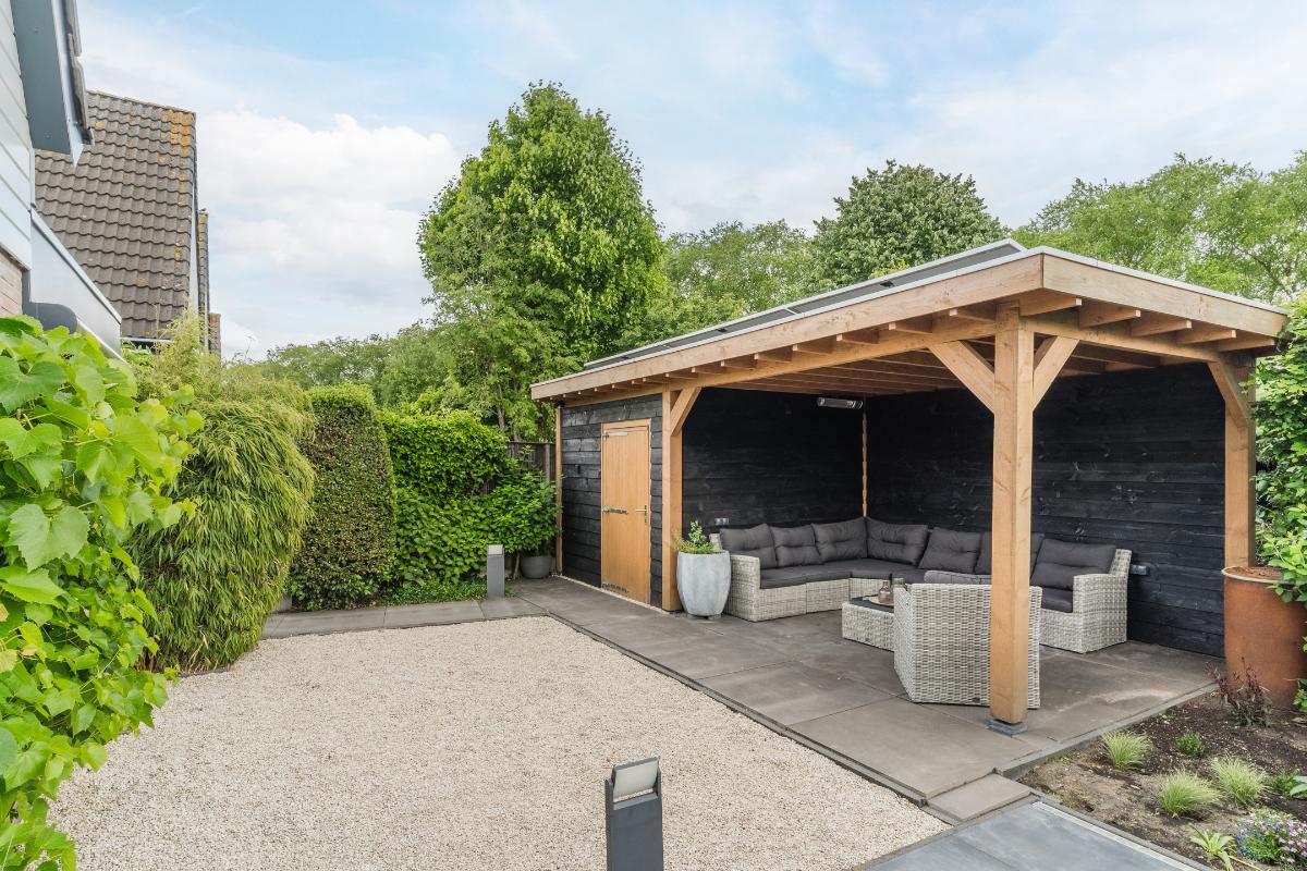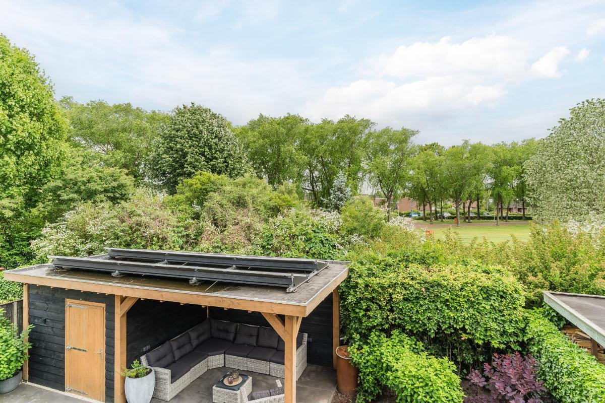 Exterieur: De groene tuin is erg sfeervol en verzorgd. Naast de overkapping is een extra berging voor opbergruimte en of fietsen etc. Tevens is er een buitenkraan. Aan de achtergevel hangt een royaal zonnescherm. Aan de zijkant van de woning loopt een pad met en eigenpoort wat zorgt voor de zogenaamde “achterom”. Hier is ook de opslag voor het haardhout en de elektrische laadpaal voor de auto.