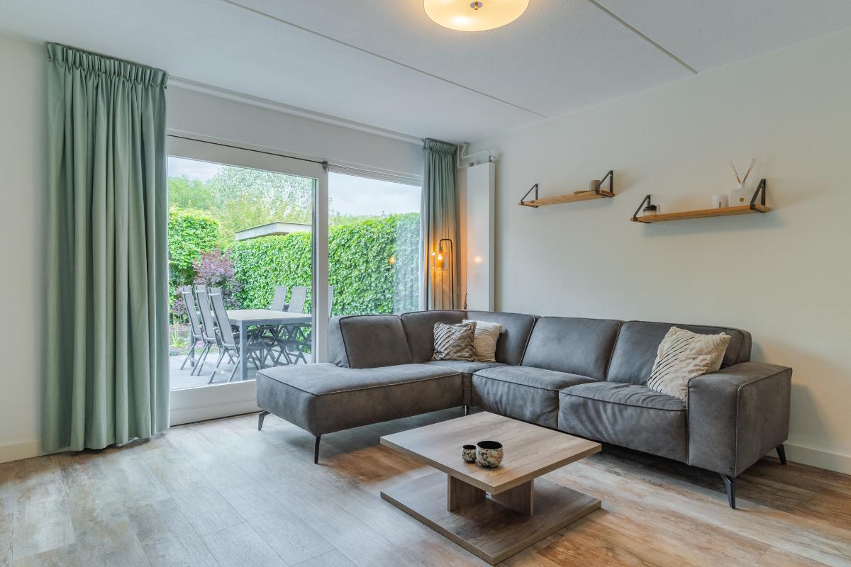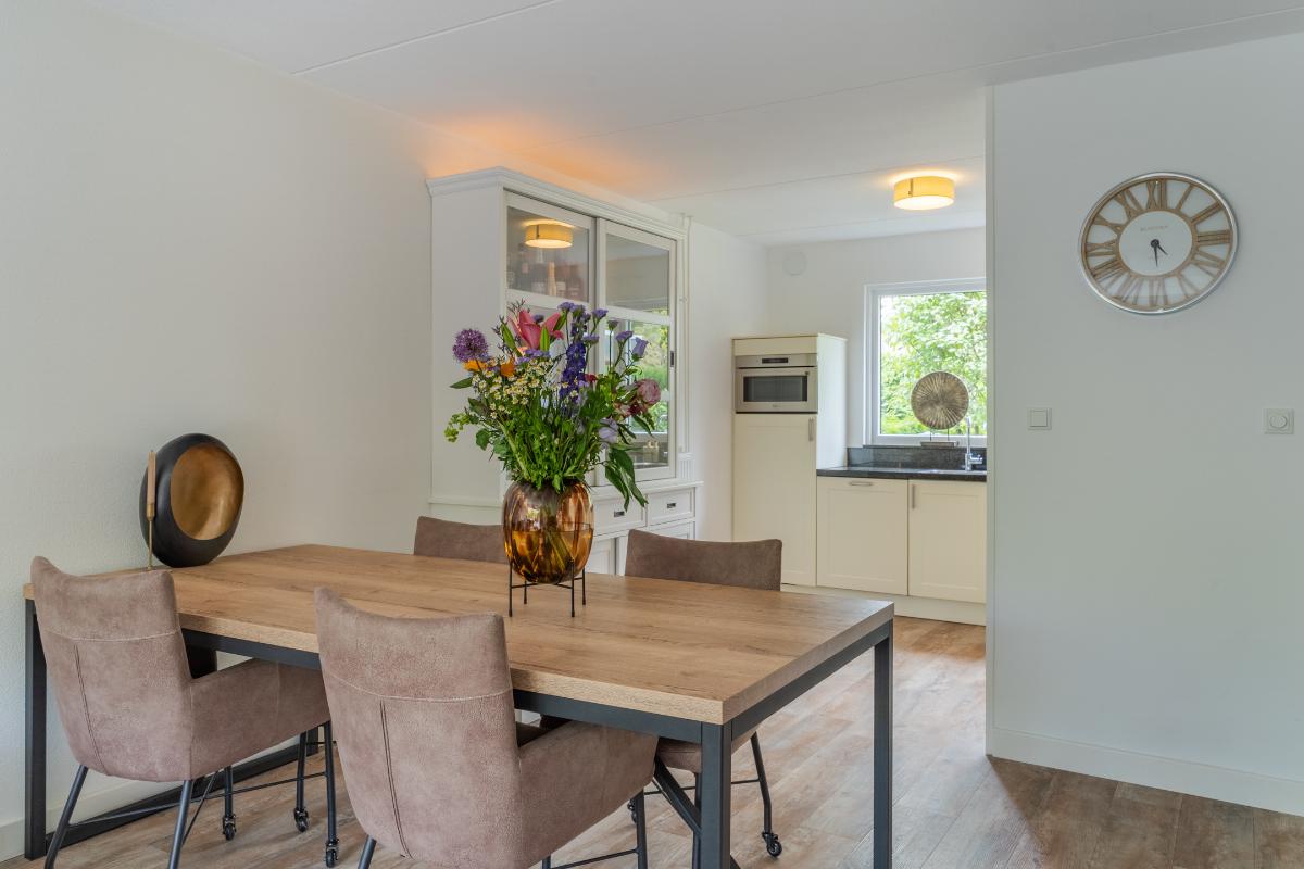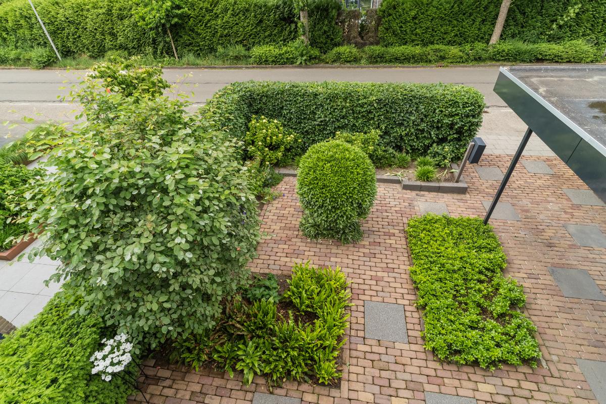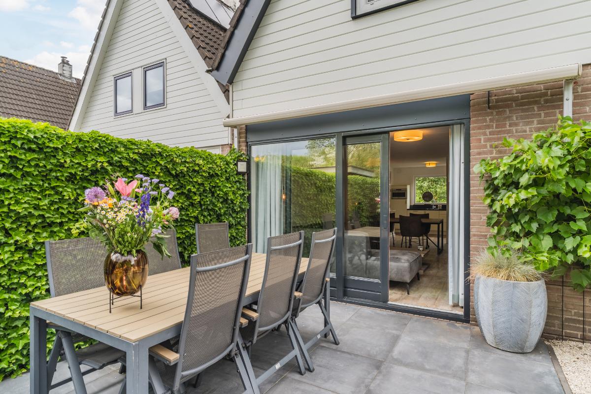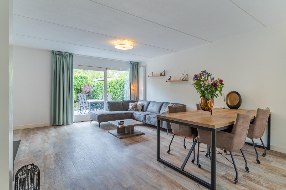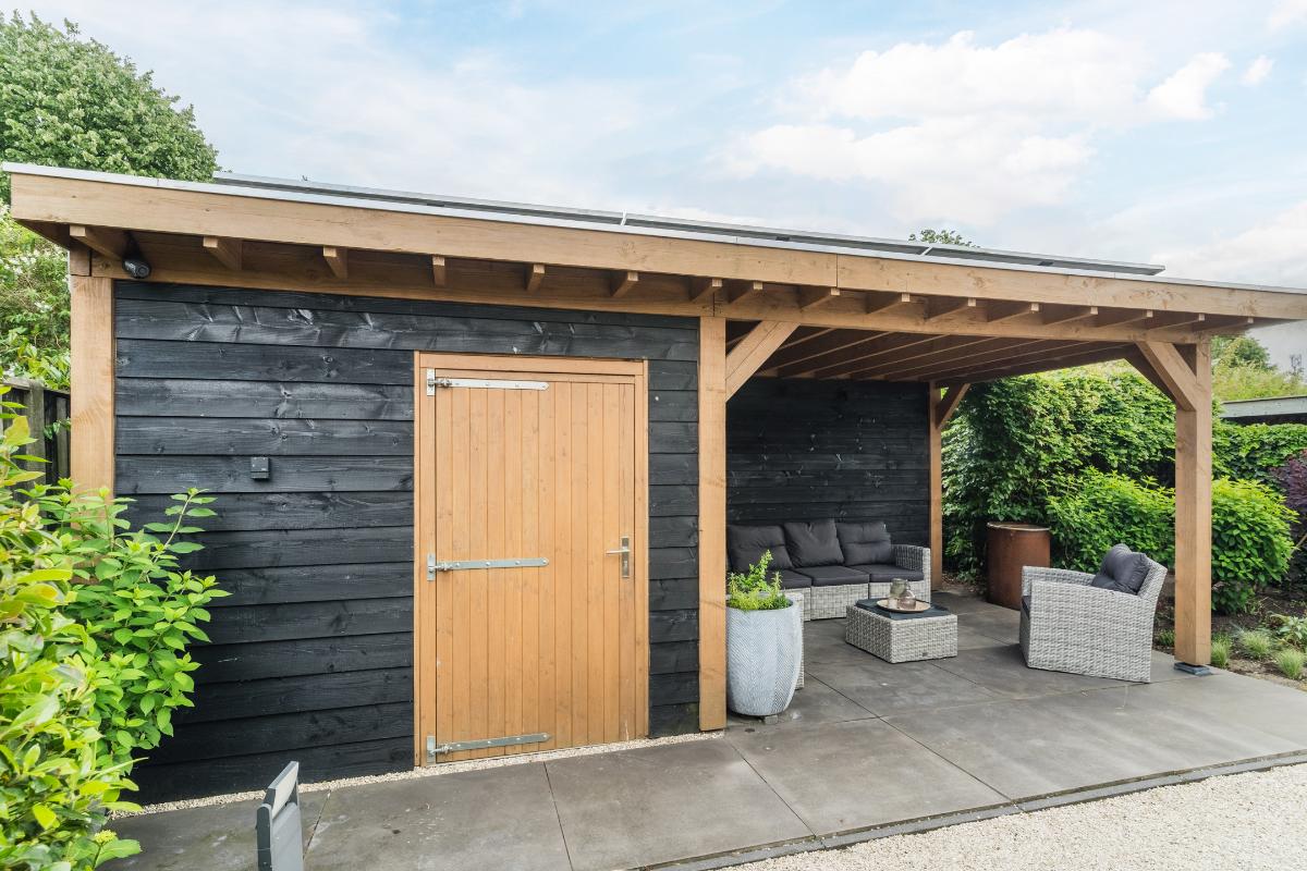 Exterieur: De groene tuin is erg sfeervol en verzorgd. Naast de overkapping is een extra berging voor opbergruimte en of fietsen etc. Tevens is er een buitenkraan. Aan de achtergevel hangt een royaal zonnescherm. Aan de zijkant van de woning loopt een pad met en eigenpoort wat zorgt voor de zogenaamde “achterom”. Hier is ook de opslag voor het haardhout en de elektrische laadpaal voor de auto.