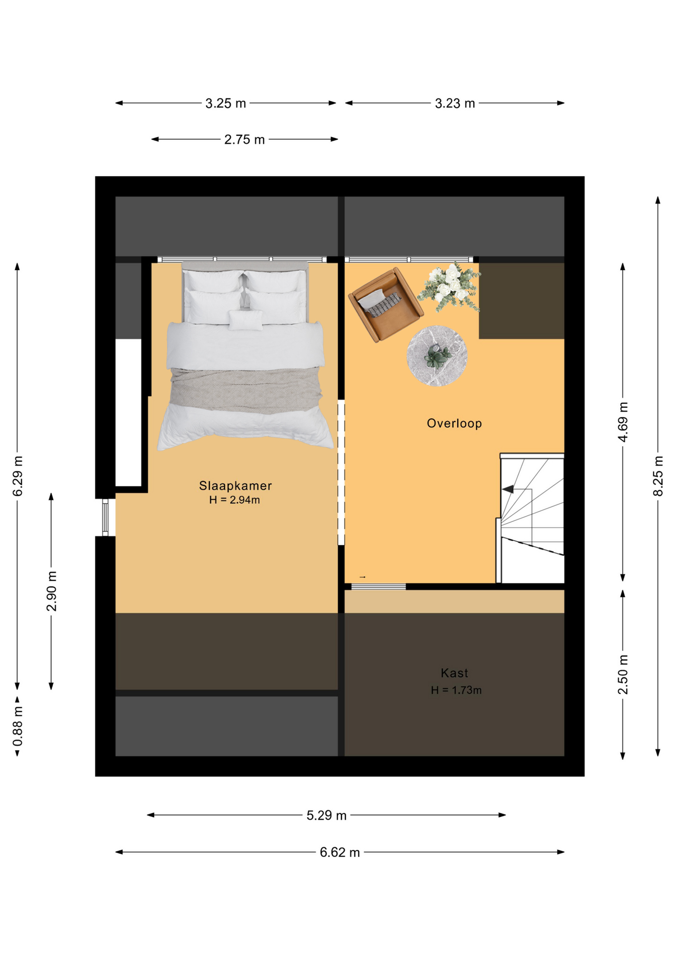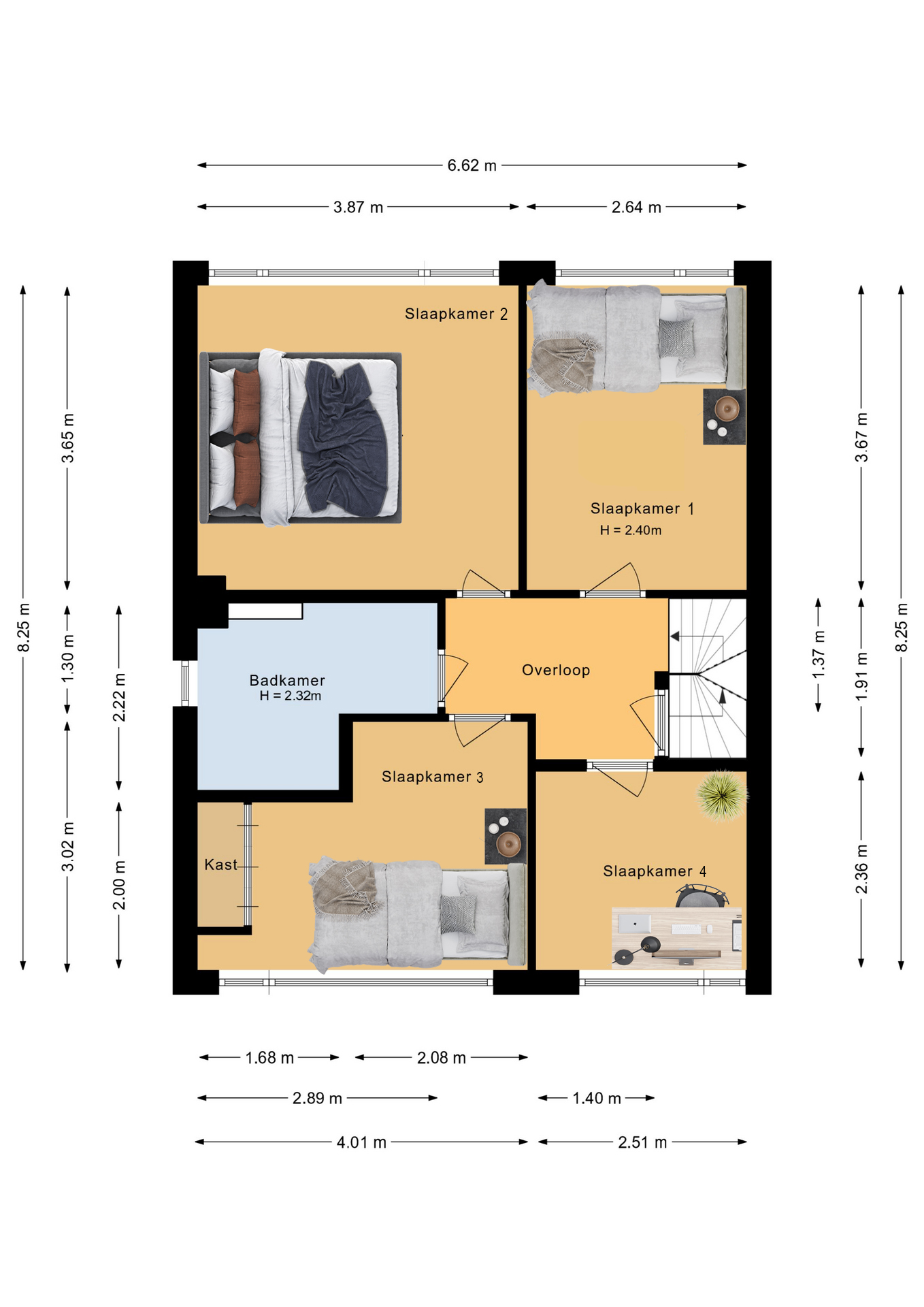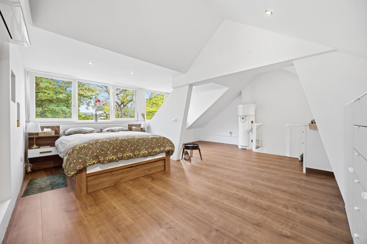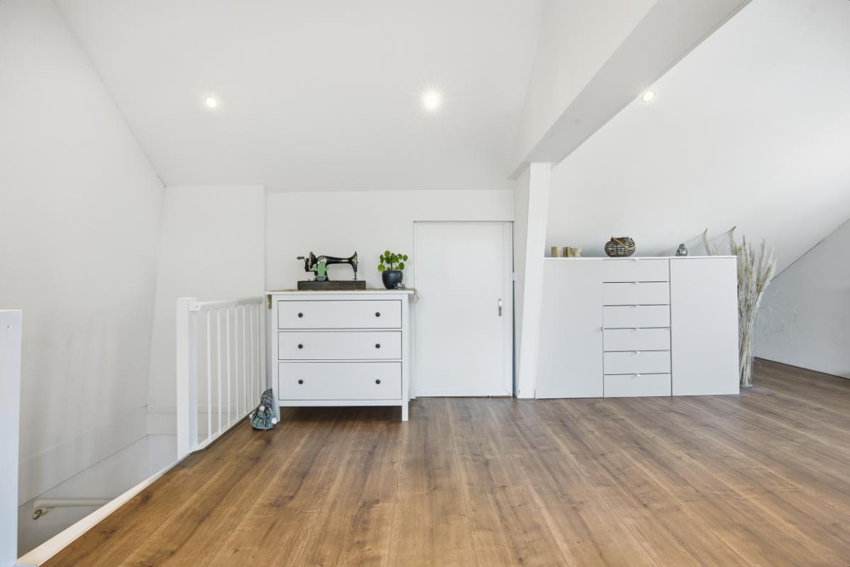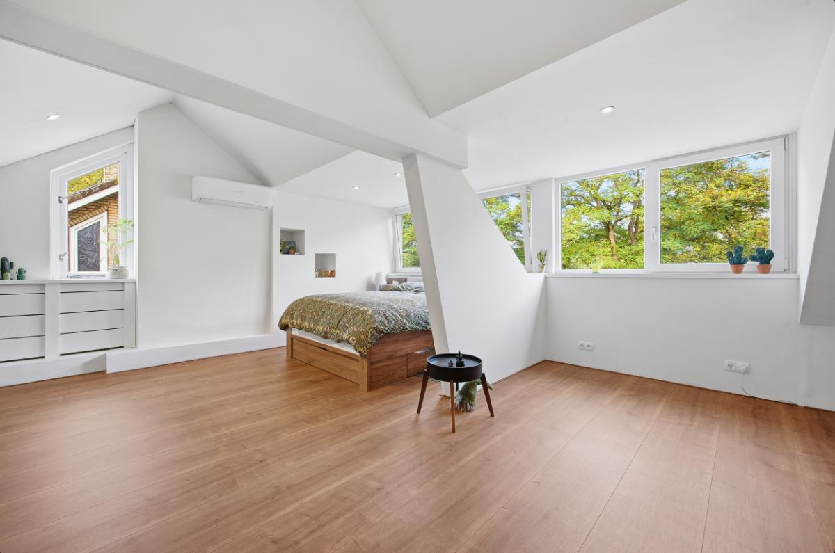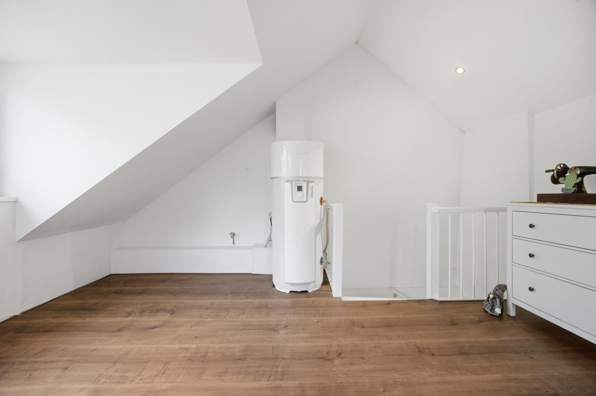 Tweede verdieping: Via de vaste met een deur afgesloten trap kom je op de bovenste verdieping die u aangenaam doet verrassen; zoveel ruimte die u voor diverse doeleinden kunt gebruiken. In het dakvlak aan de achterzijde is een dakkapel wat voor nog meer ruimte zorgt. Op deze verdieping is de 5e slaapkamer met airco (2020). Deze verdieping is voorzien van een laminaatvloer en is netjes afgewerkt en voorzien van inbouw spots. De warmtepomp is ook op deze verdieping te vinden.