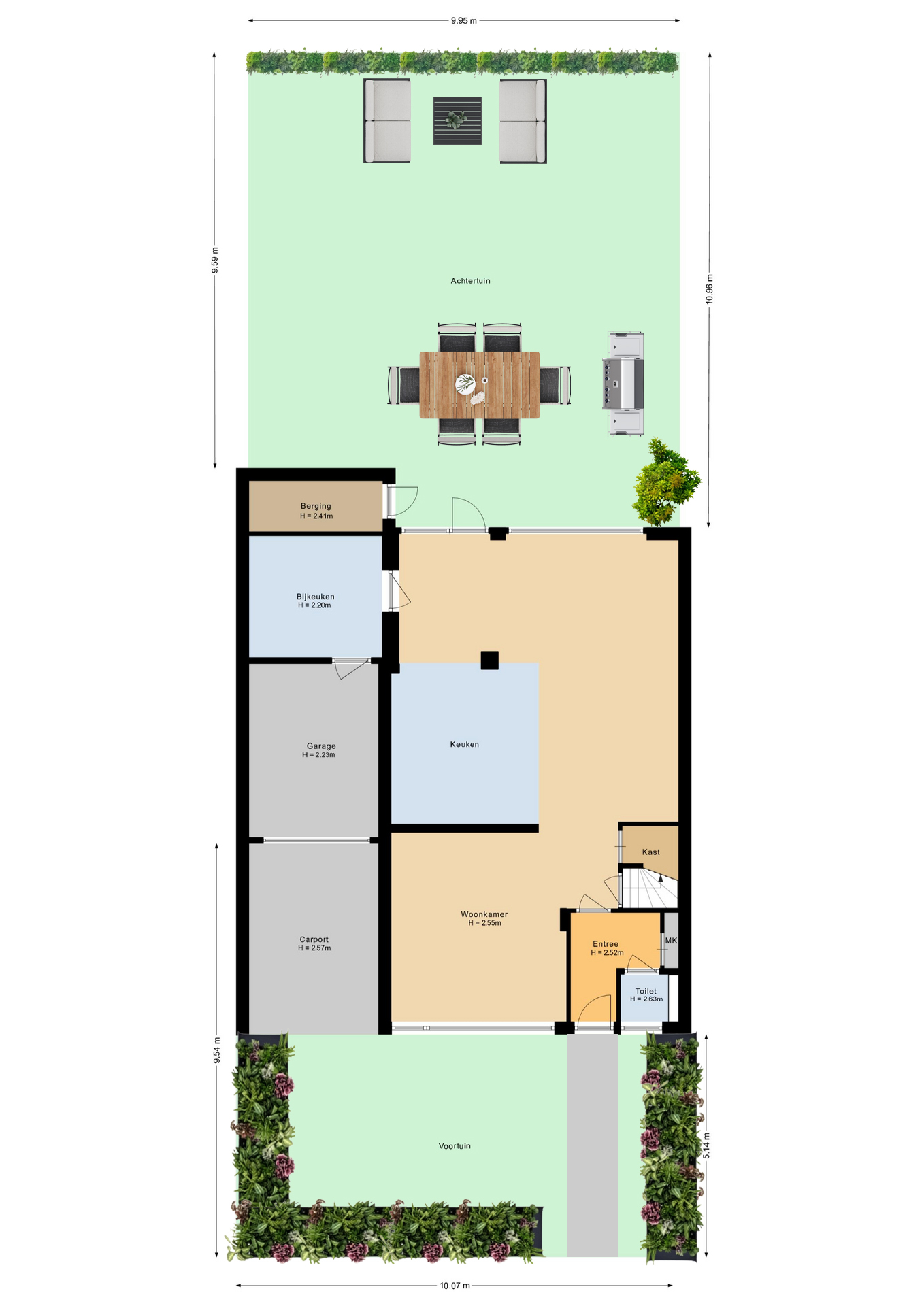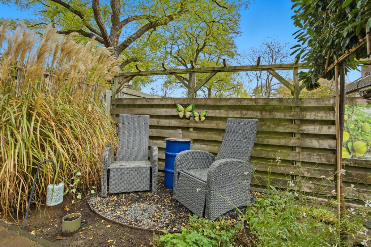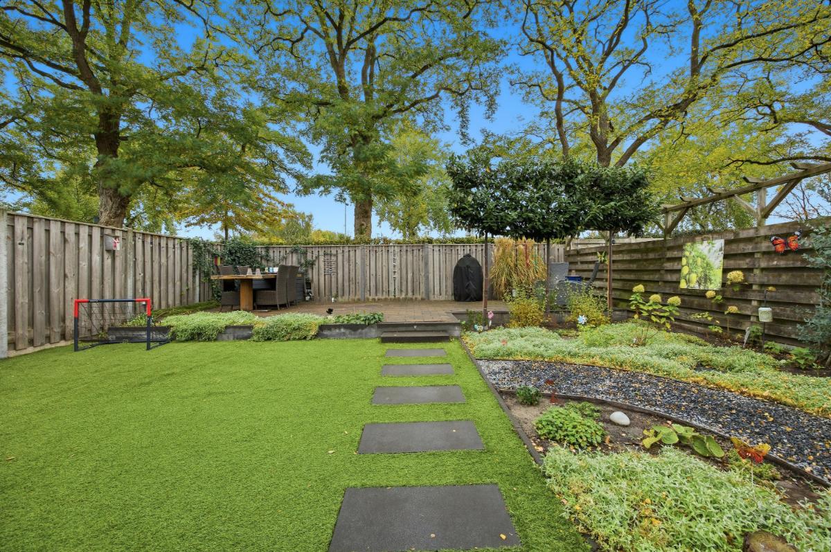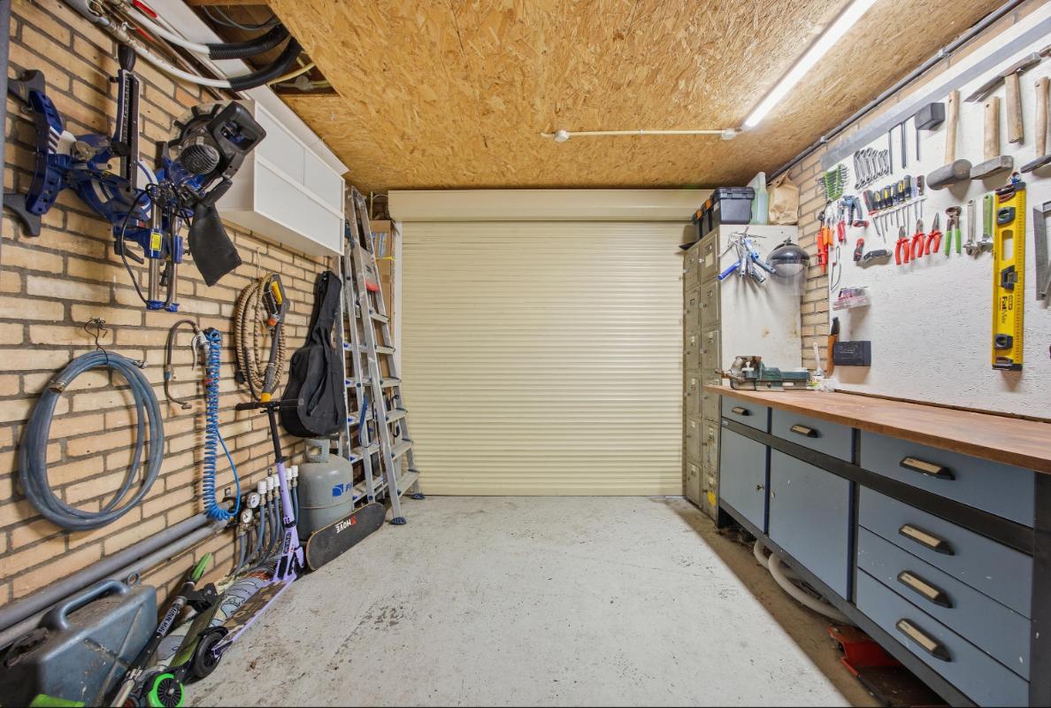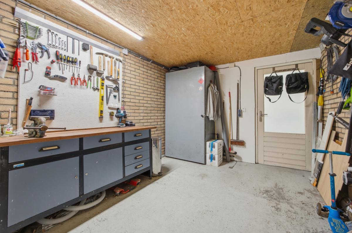 Exterieur: De onderhoudsarme tuin is ingericht met houten schuttingen, een terras, borders diverse beplanting en kunstgras. In de tuin zijn verschillende stroompunten aangebracht. De garage met elektrische deur is aansluitend aan de bijkeuken met werkblad, wasmachine aansluiting en afvoerputje. Deze ruimte is ook ideaal voor een 2e vriezer en of koelkast en wasdroger. De extra berging is apart te bereiken vanuit de tuin en is voorzien van elektra. Voor de garage is de diepe oprit en carport welke ruimte bieden aan verschillende auto’s.