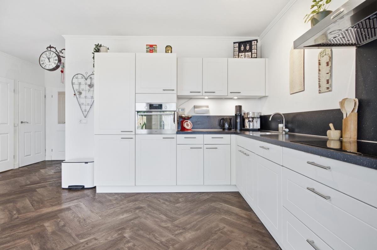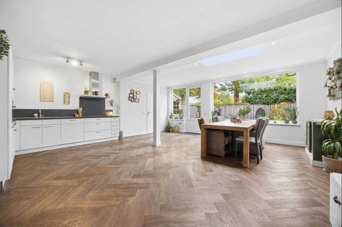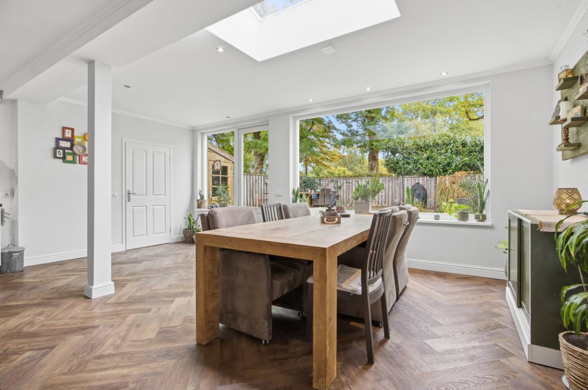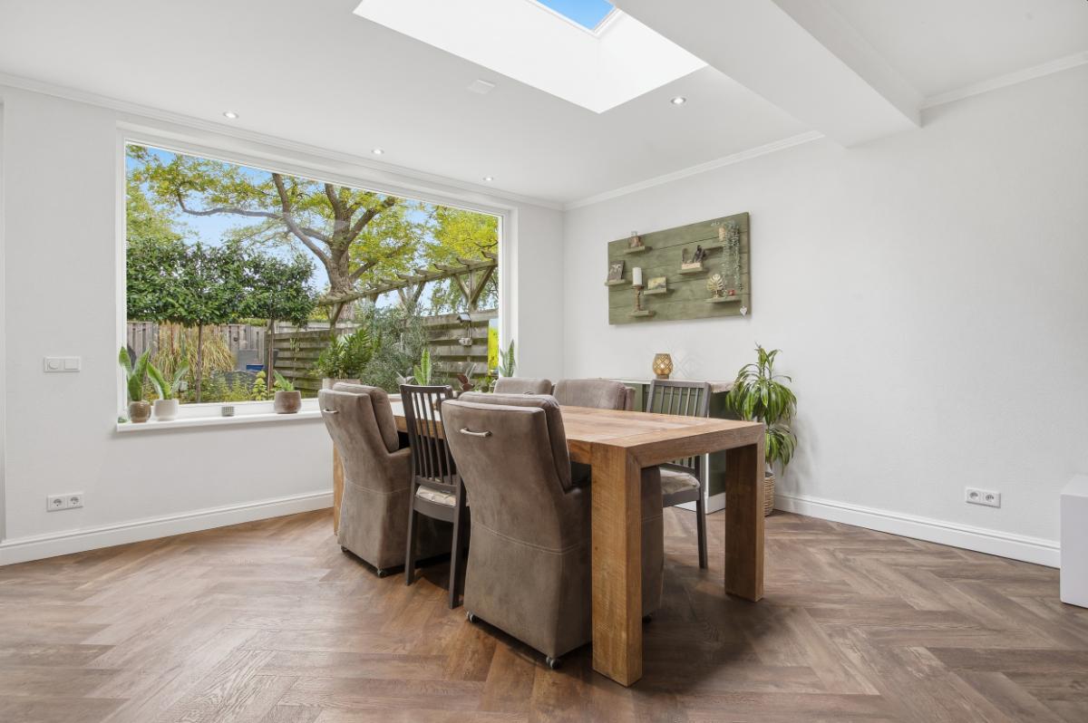 De ruime woonkamer heeft een groot raam aan de voorzijde waardoor u volop kunt genieten van het uitzicht op de voortuin en de rustige straat. Boven het raam hangt een zonnescherm. Aan de achterzijde bevindt zich de eetkamer, in de uitbouw (2020) met zicht op de keuken en de tuin. Vanuit deze ruimte heeft u ook toegang naar de achtertuin. De keuken (2014), met een neutrale uitstraling, is voorzien van veel bergruimte, soft close laden, voldoende stroompunten en diverse inbouwapparatuur: een inductie kookplaat met afzuigkap, vaatwasser, combi oven en een koel- vriescombinatie.