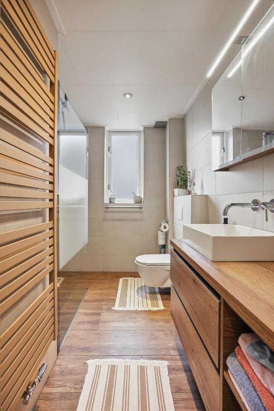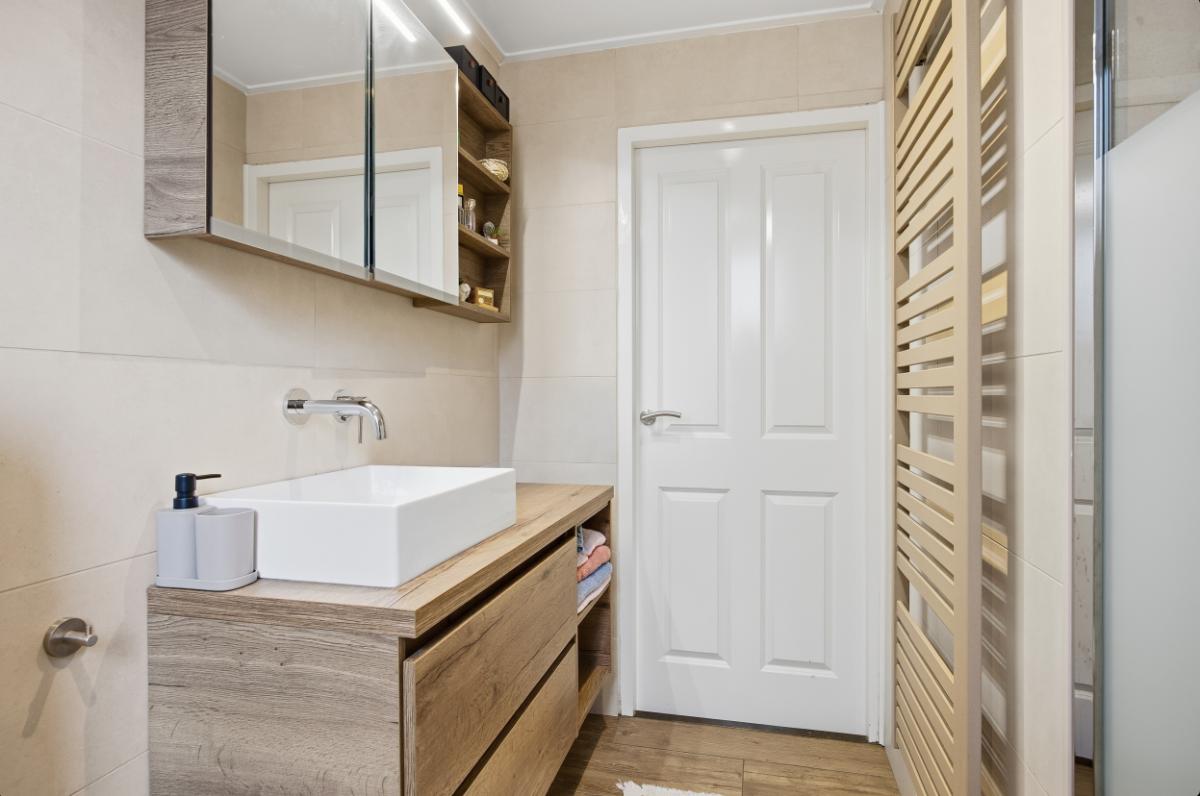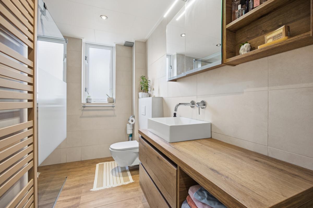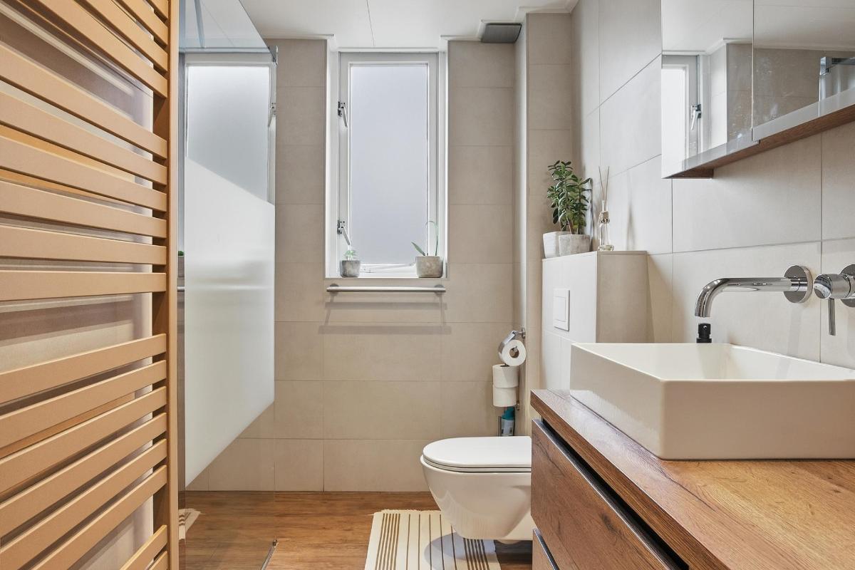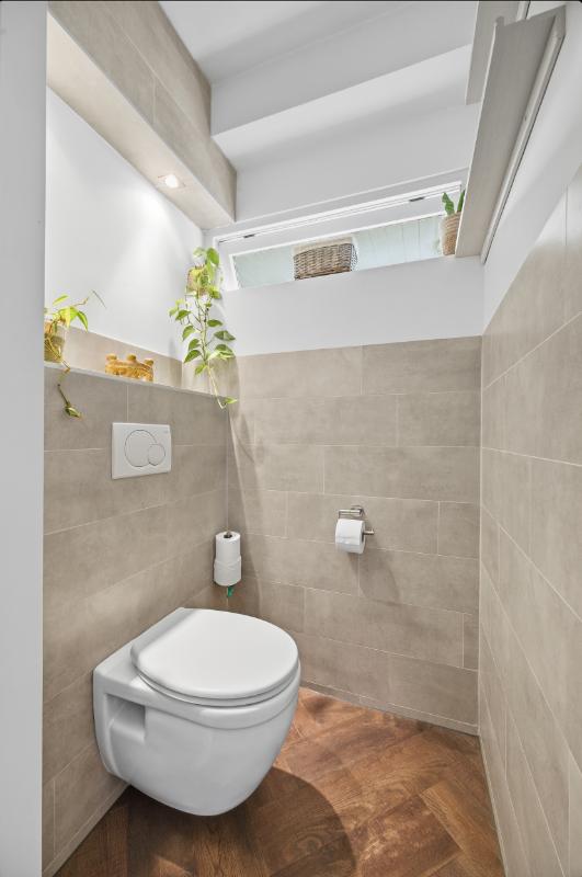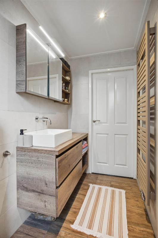 De badkamer (2020) heeft een inloop (regen) douche, een 2e toilet, een wastafelmeubel en de wanden zijn geheel betegeld. Verder is er nog een raam voor de natuurlijke ventilatie en een mechanische ventilatie.