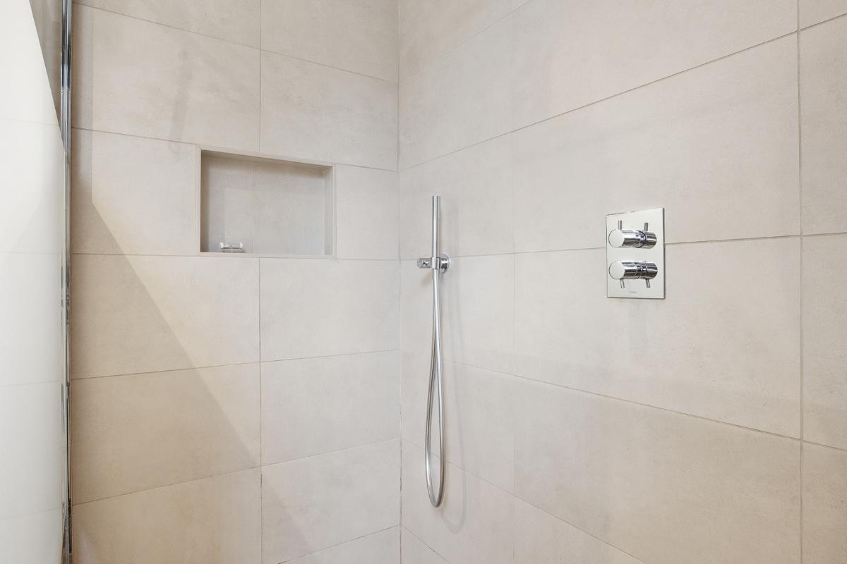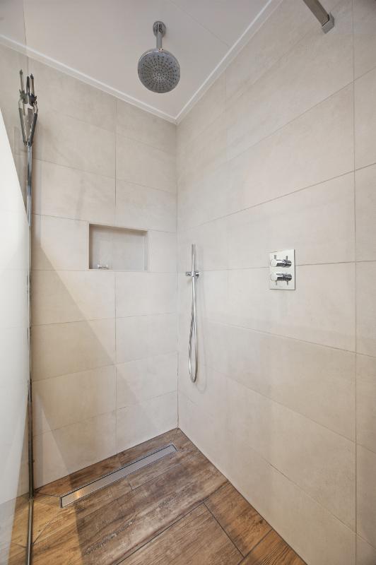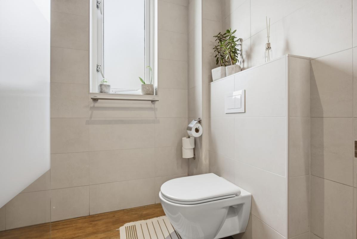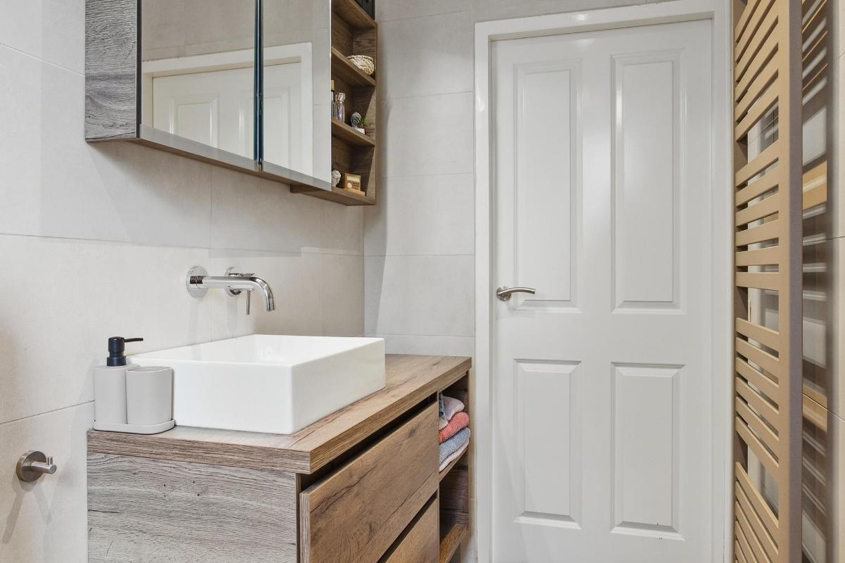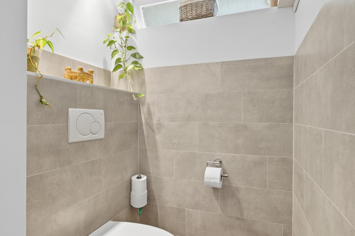 De badkamer (2020) heeft een inloop (regen) douche, een 2e toilet, een wastafelmeubel en de wanden zijn geheel betegeld. Verder is er nog een raam voor de natuurlijke ventilatie en een mechanische ventilatie.