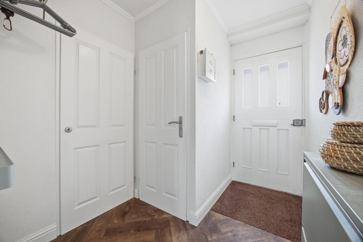 Begane grond: Een uitnodigende entree met overkapping. Vanuit de hal zijn de meterkast, een modern toiletruimte, de woonkamer en de eetkamer/ keuken te bereiken. Onder de trap is een praktische bergkast. De visgraat pvc- vloer, met vloerverwarming, ligt op nagenoeg de hele begane grond.