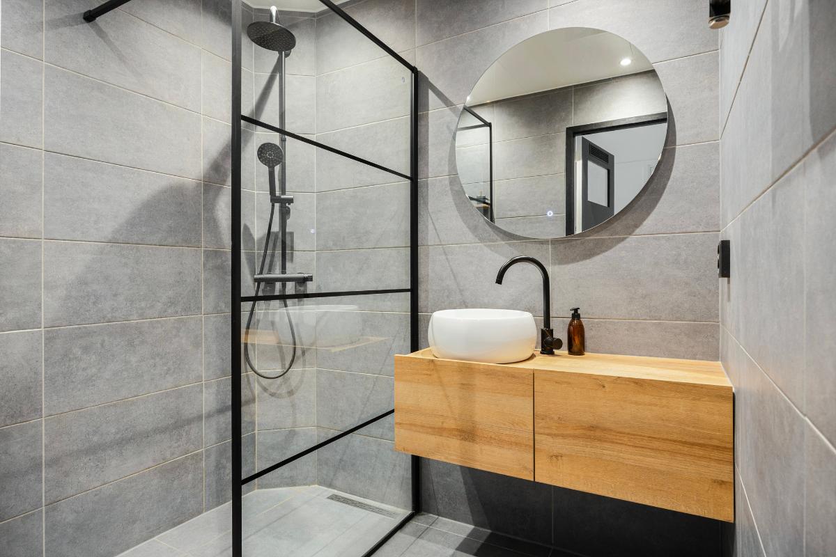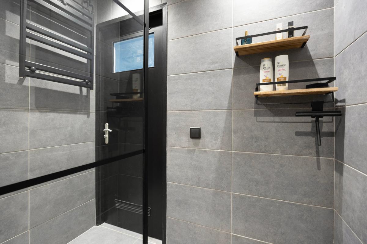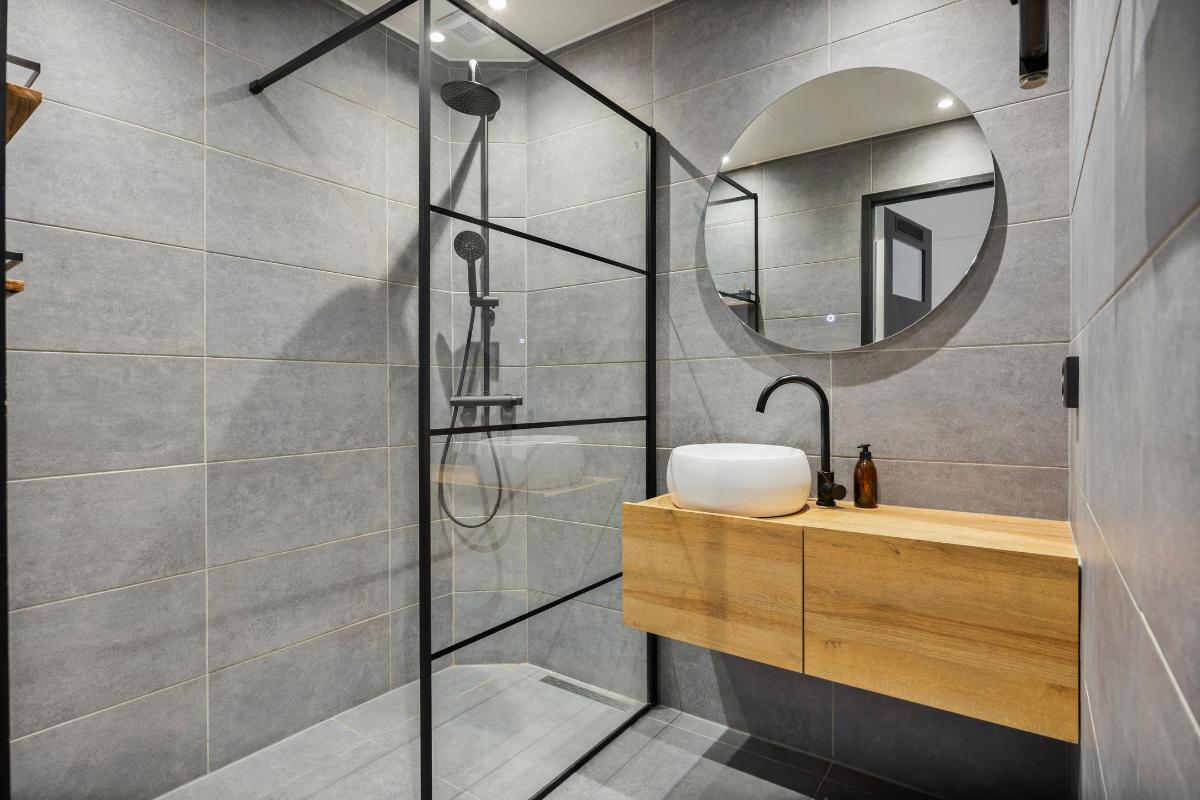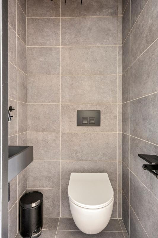 De badkamer en het separate toilet met fonteintje zijn bereikbaar via de hal en zijn, net als de rest van de woning, modern uitgevoerd. De badkamer is voorzien van een douche en een wastafelmeubel.