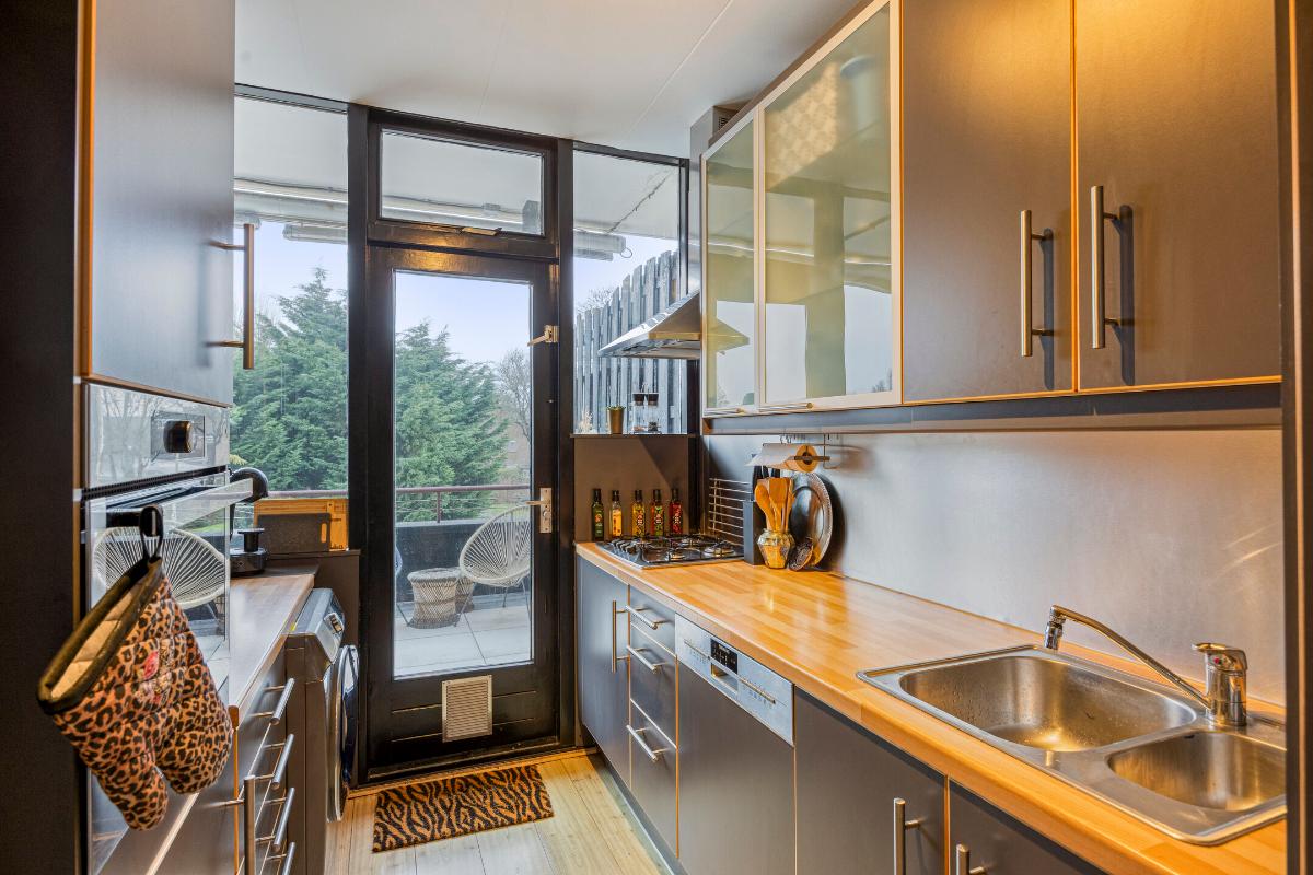 De keuken is gelegen aan de achterzijde en is voorzien van hedendaagse gemakken zoals een koel-/vriescombinatie, vaatwasser, gasfornuis met afzuigkap, combi-oven en een aansluiting voor de wasmachine. Vanuit de keuken heeft u toegang tot het zeer ruime dakterras aan de achterzijde, gelegen op het zuidwesten; een ideale plek om tot in de avond van de zon te genieten.