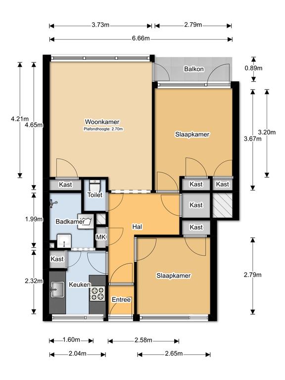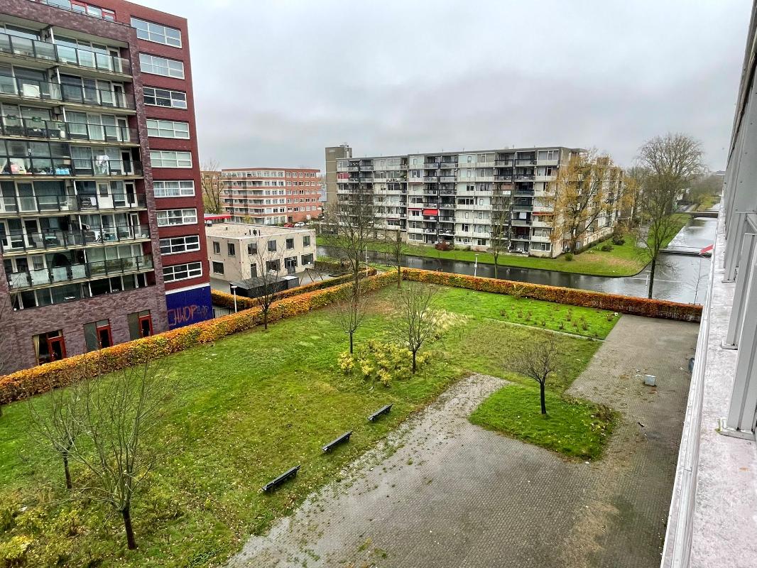 Vijfde verdieping: Via de voordeur stap je het appartement binnen. Direct aan de linkerzijde bevindt zich de keuken. Deze is voorzien van een keukenblok voldoende kastruimte en losse apparatuur. Aansluitend aan de keuken ligt de badkamer. Deze ruimte is voorzien van een inloopdouche en de aansluiting voor de wasmachine. In de hal zit separaat de toiletruimte. Aan de achterzijde van de woning bevindt zich de lichte woonkamer. Dankzij de ramen valt er veel natuurlijk daglicht binnen, waardoor je hier eenvoudig een gezellige en huiselijke sfeer creëert. Deze woonkamer is vergroot door het samenvoegen met een slaapkamer. Uiteraard is dit gemakkelijk weer terug te brengen tot een oorspronkelijke indeling met twee slaapkamers (zie tweede plattegrond). Vanuit de woonkamer en de eventuele slaapkamer heb je toegang tot het balkon op het zuiden met uitzicht op de gezamenlijke tuin. Aan de voorzijde bevindt zich de andere slaapkamer. In het appartement bevinden zich meerdere vaste kasten waardoor je veel opbergruimte hebt.