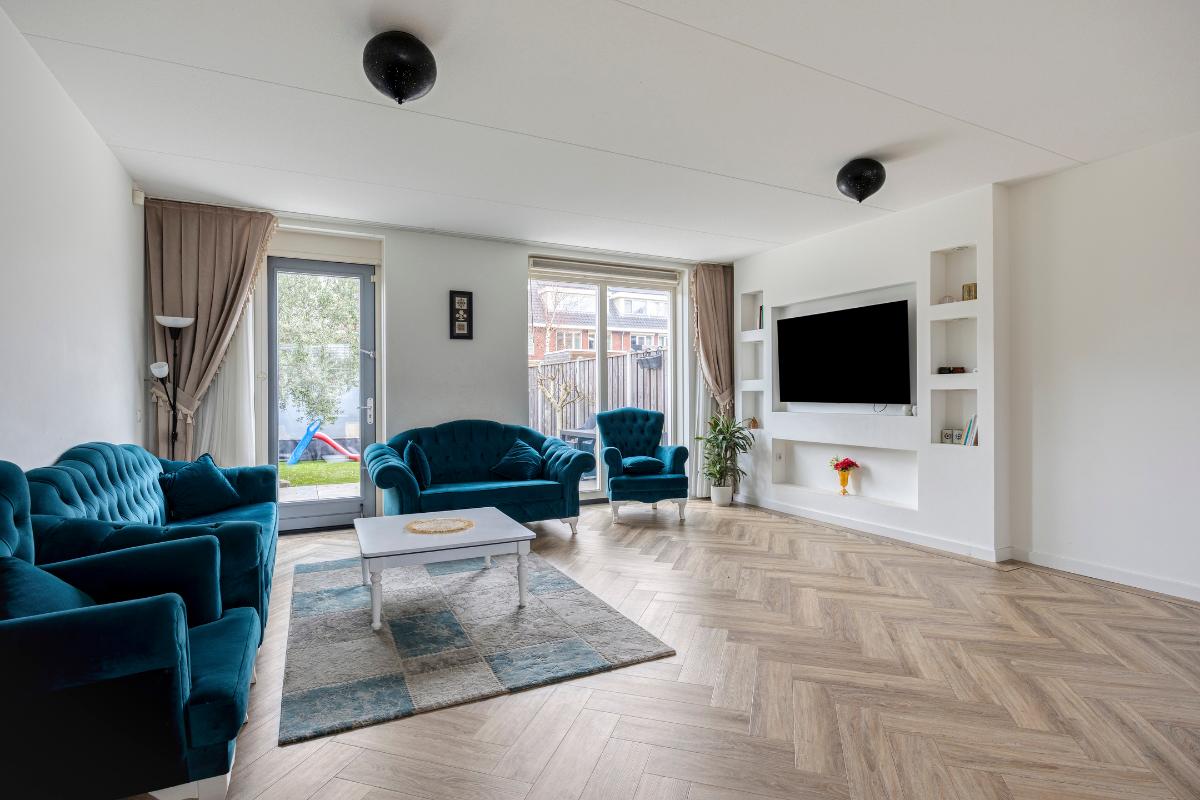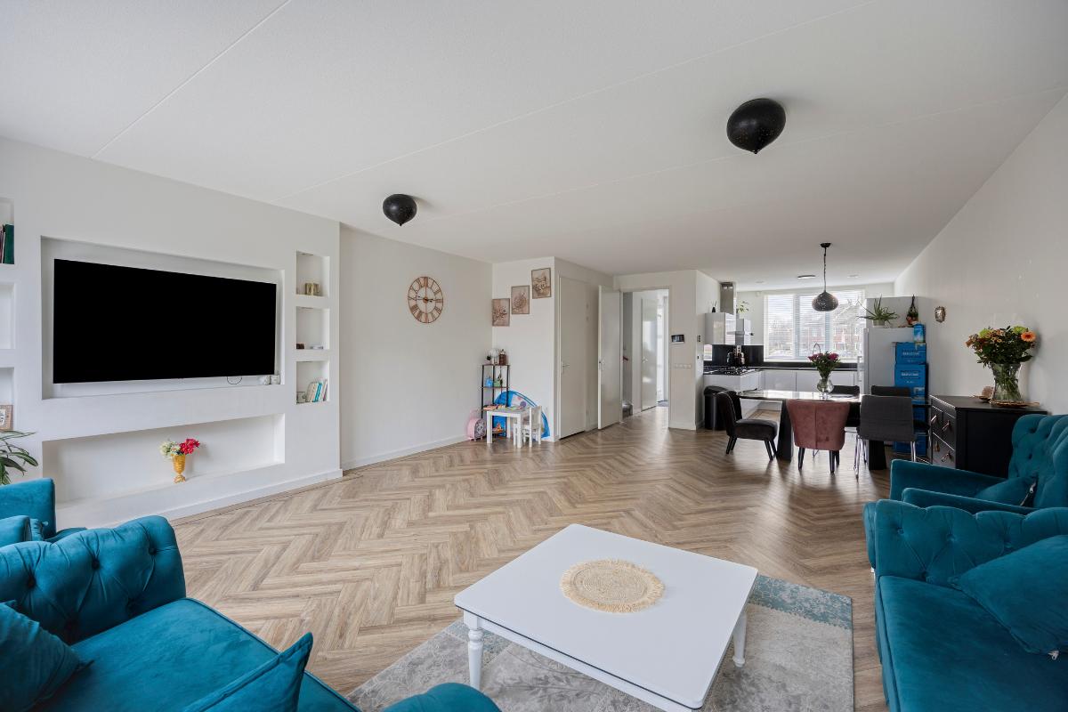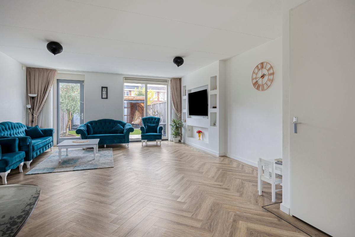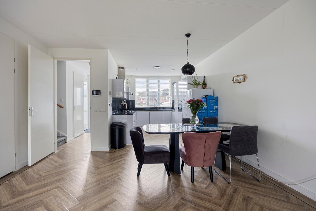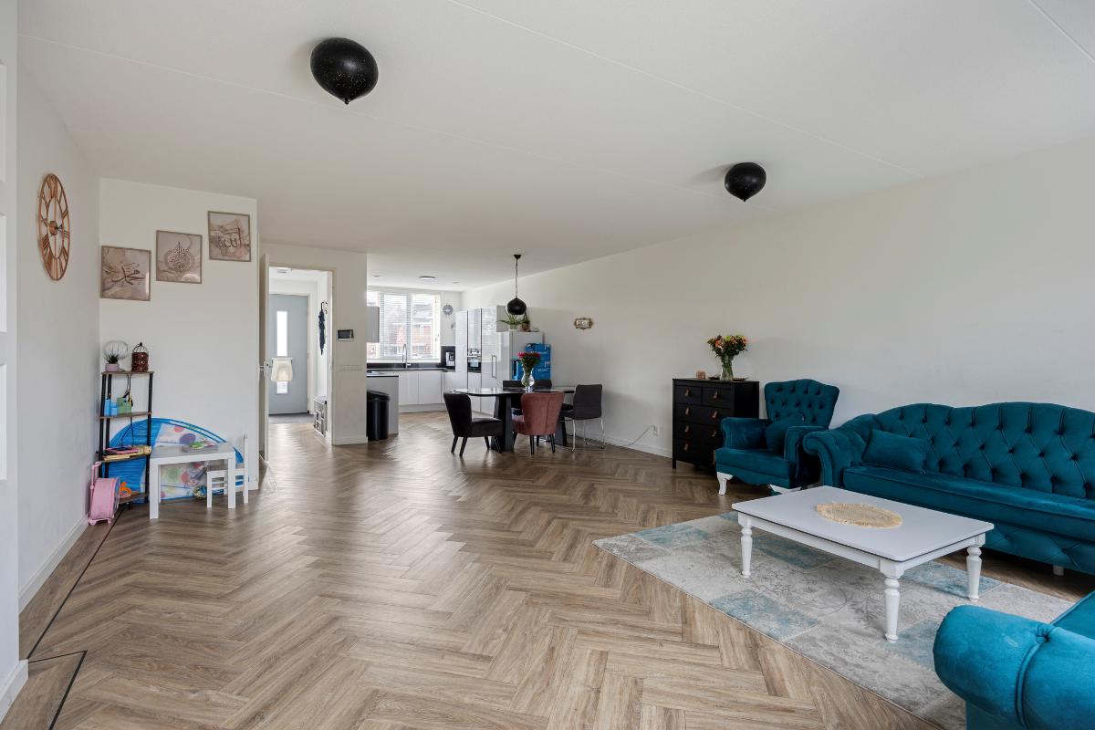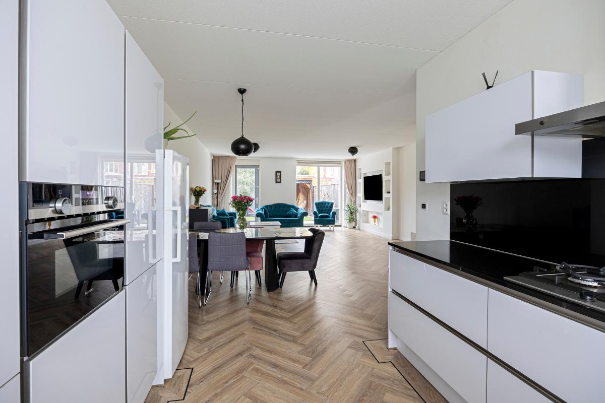 De gehele begane grond is afgewerkt met in visgraat gelegd PVC en voorzien van vloerverwarming. De aanbouw zorgt voor extra leefruimte en een prachtige verbinding met de tuin.