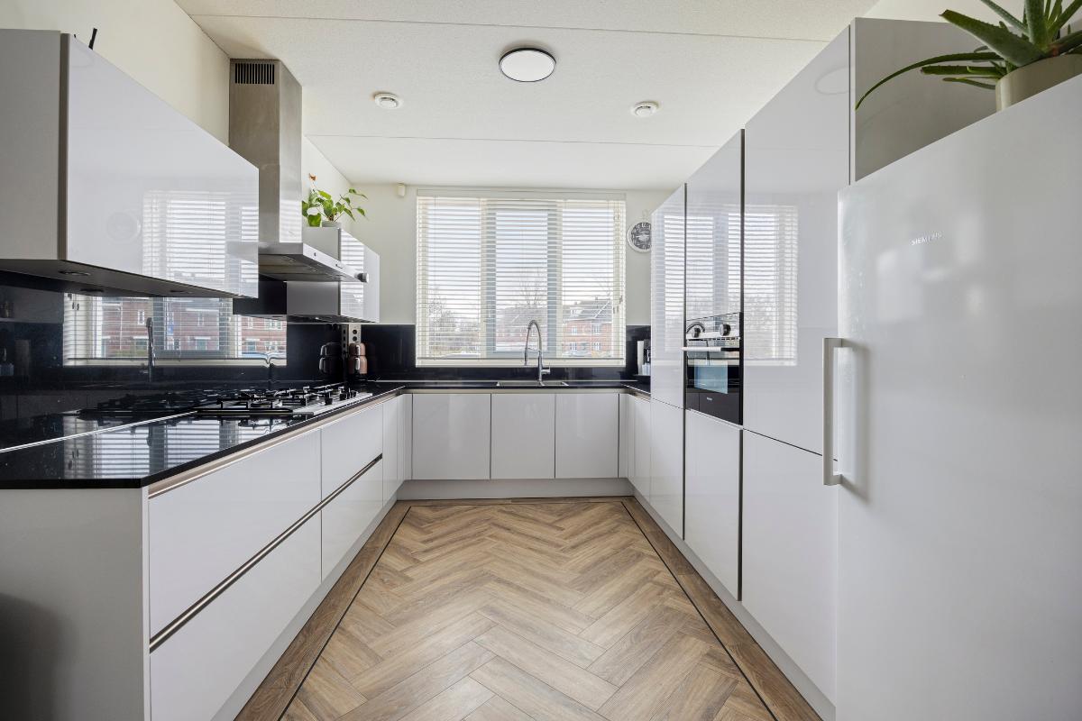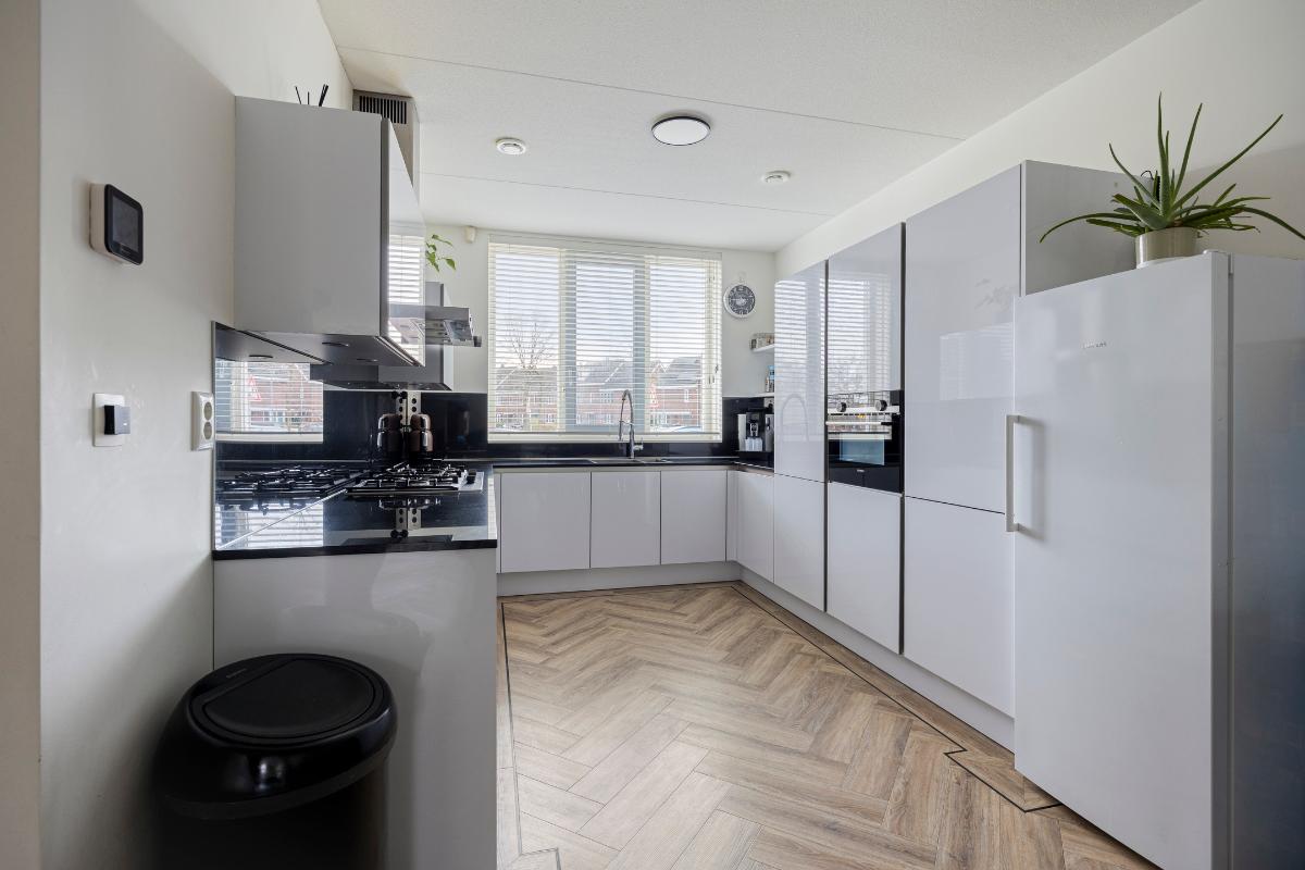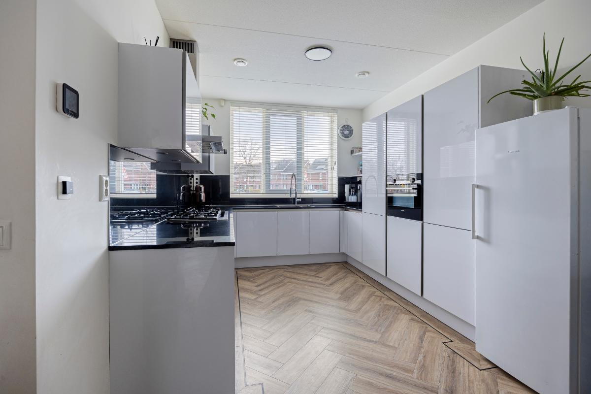 De luxe open keuken is uitgevoerd in wit hoogglans met een ruim werkblad en voorzien van hoogwaardige inbouwapparatuur, waaronder een 5-pits gasfornuis, combioven en een koelkast.