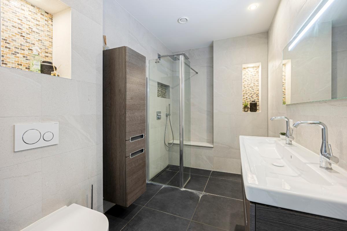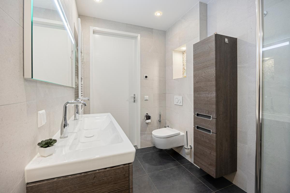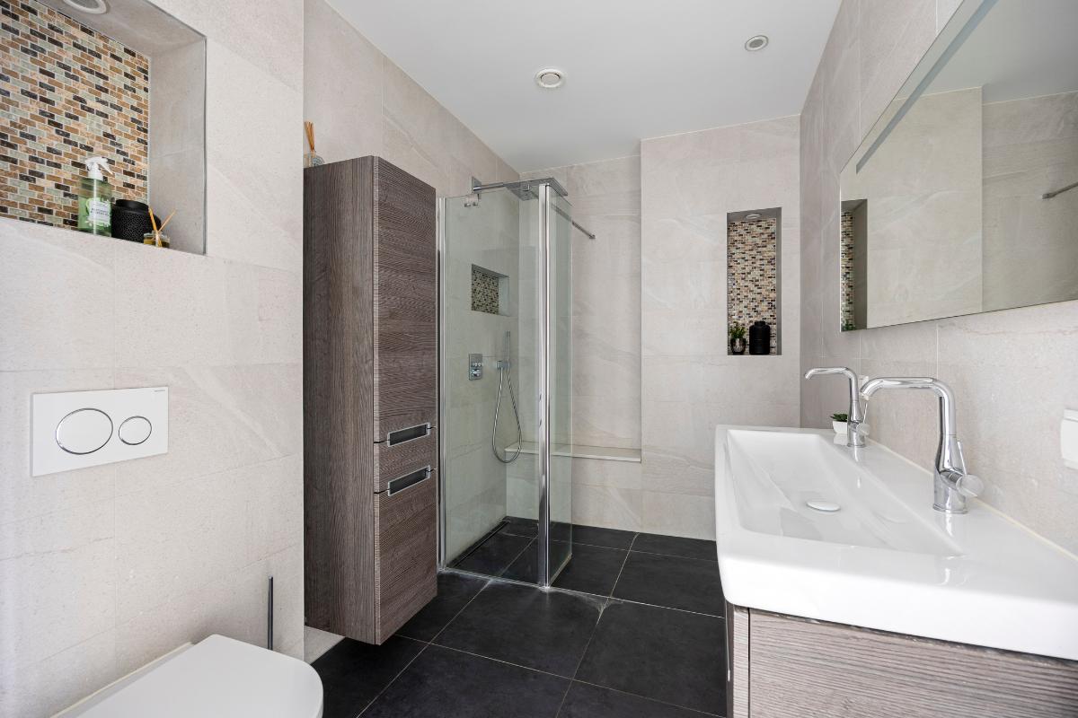 De ruime badkamer is modern uitgevoerd en beschikt over een inloopdouche, wastafel met meubel, spiegel met verlichting en toilet.