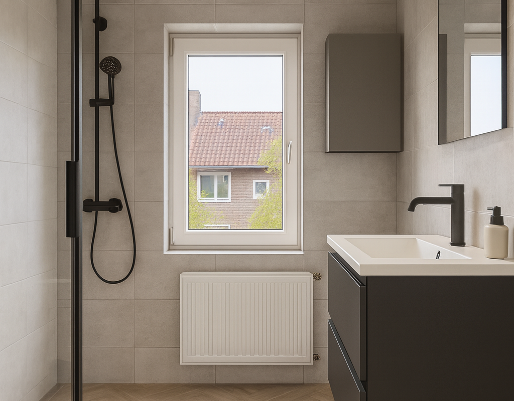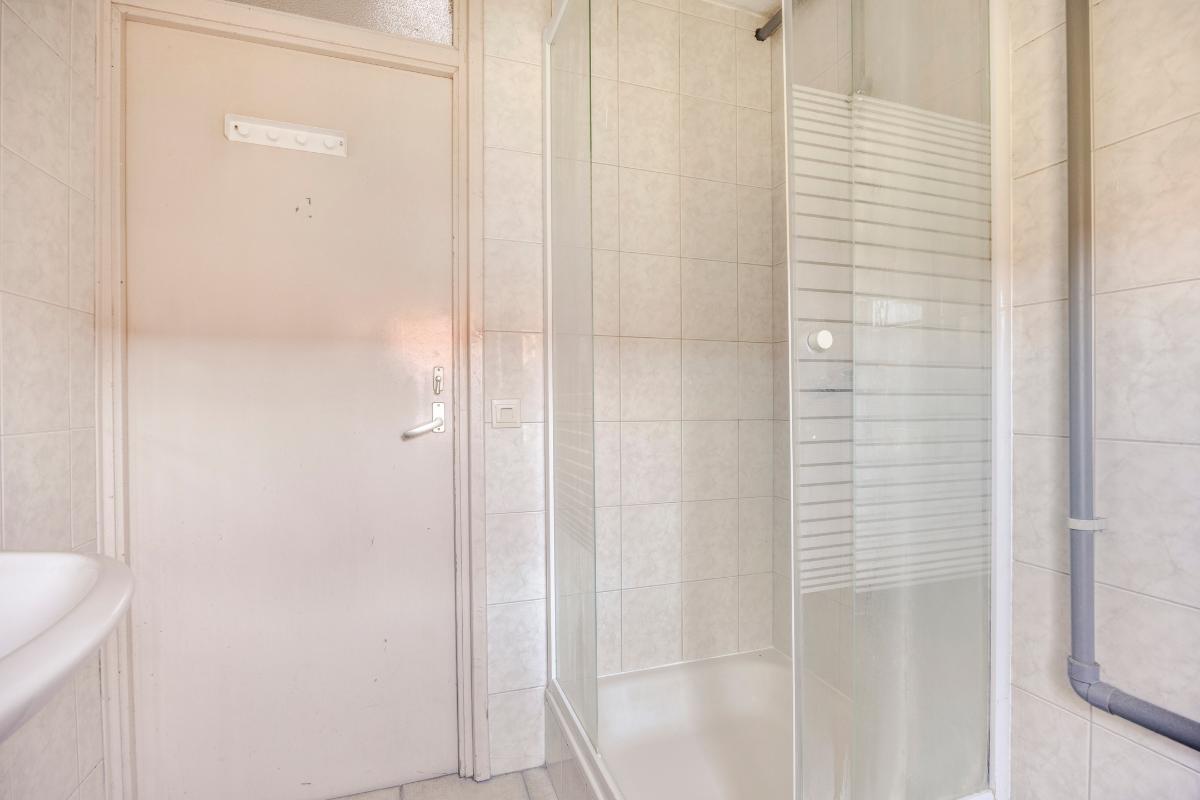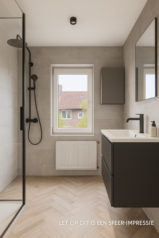 Badkamer De badkamer is ingericht met een tegelvloer, wandbetegeling, een wastafel, douche en de aansluitingen voor wasmachine en droger.