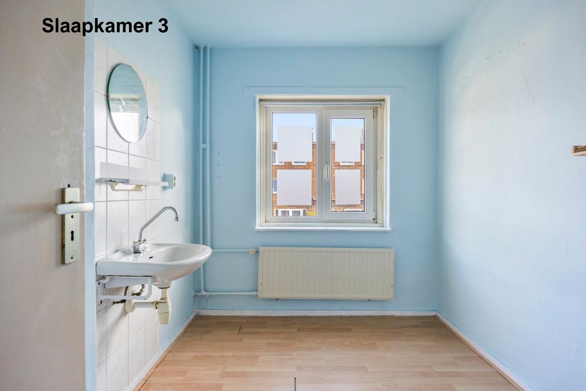 Slaapkamer 3 (achterzijde) Een slaapkamer van goed formaat met wastafel en inbouwkast.