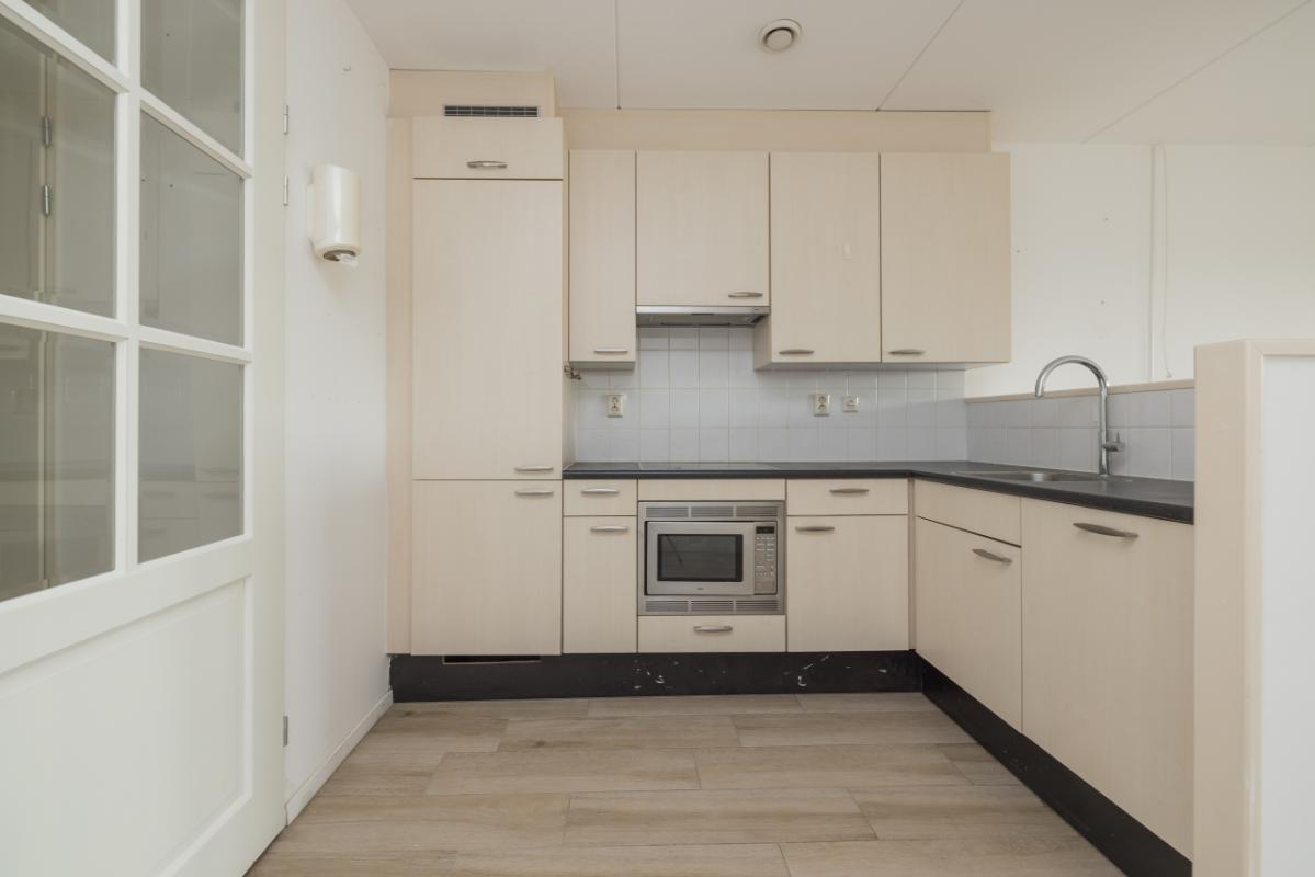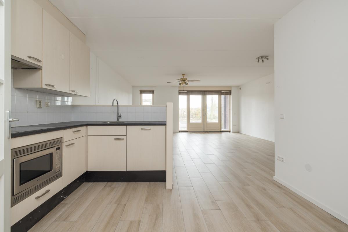 De lichte, ruime woonkamer heeft openslaande deuren naar het terras en een sfeervolle houtlook plavuizenvloer. De open keuken in L-opstelling is voorzien van lichte houtlookkasten, een donker werkblad, kookplaat, afzuigkap, vaatwasser, combi-oven en koel-/vriescombinatie.