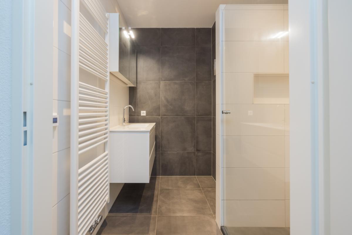 De royale slaapkamer aan de voorzijde biedt directe toegang tot de moderne badkamer in de kleurstelling wit/grijs met inloopdouche, wastafelmeubel, spiegelkast, wasmachineaansluiting en vloerverwarming.