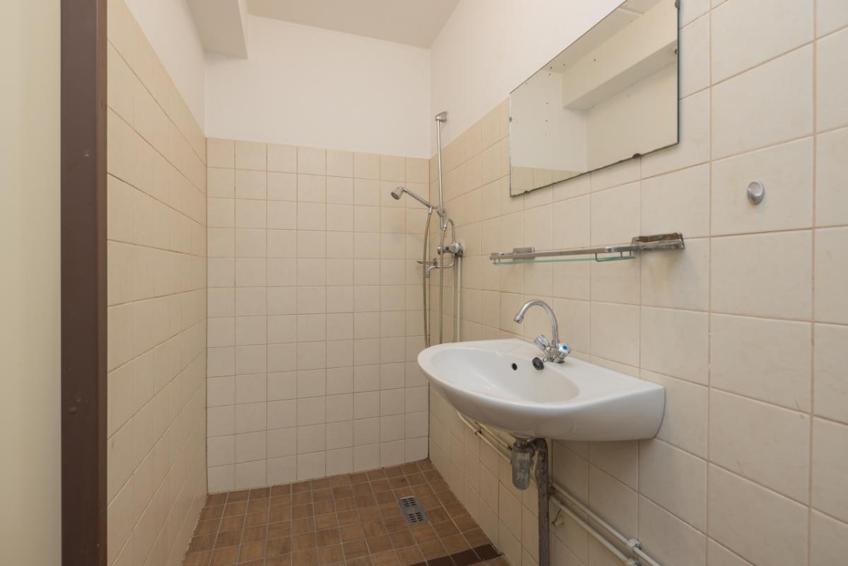 First floor layout: Entrance hall, toilet with hand basin, built-in closet housing the central heating boiler and mechanical ventilation unit. The bathroom has a sink, walk-in shower, and a washing machine connection. The spacious bedroom is located at the front of the apartment.