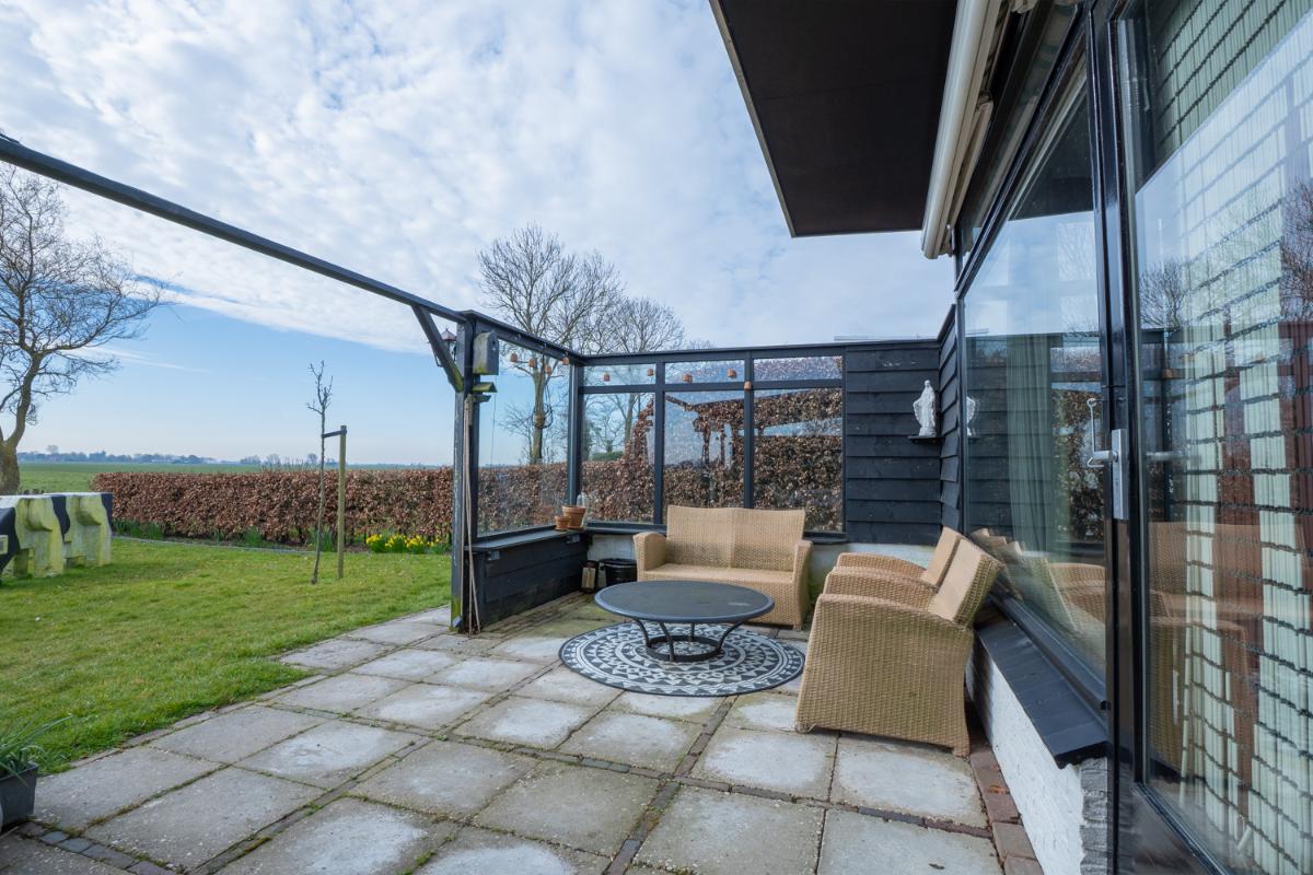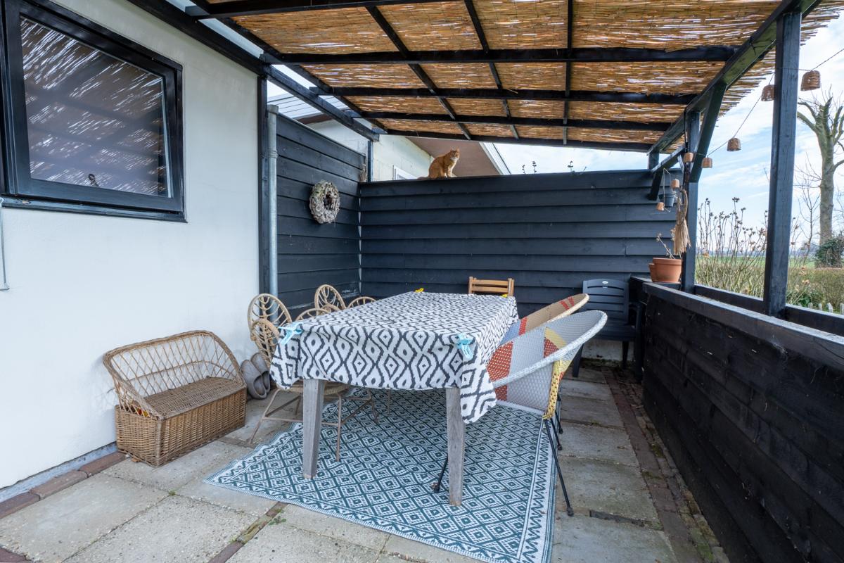 Vanuit de woonkamer stap je op het zonneterras met windscherm en gedeeltelijk overkapte ruimte. Genieten van de volle zon of wanneer het toch te warm wordt is er gedacht aan schaduw.