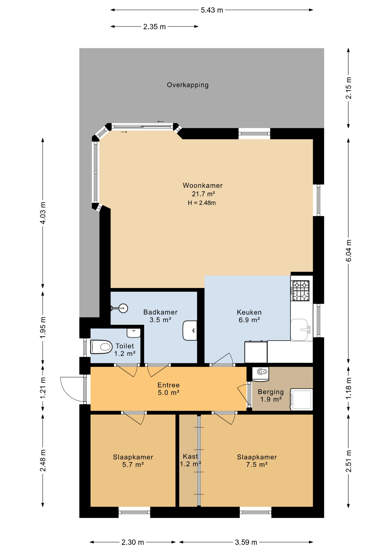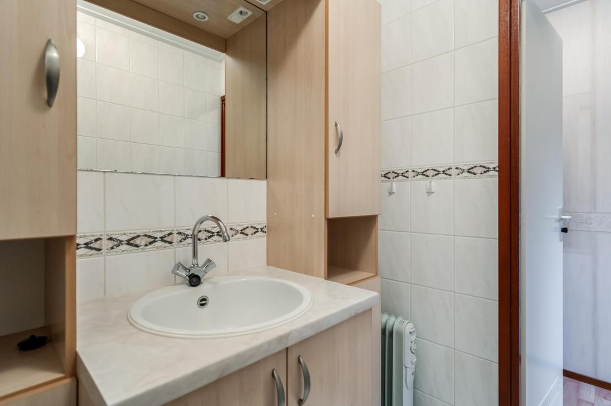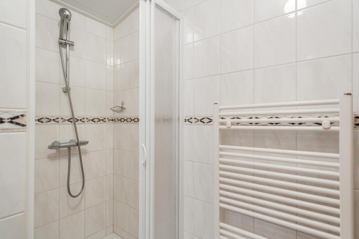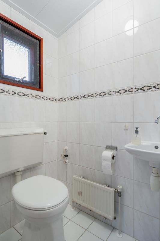 De badkamer is compact en voorzien van een douche en wastafel. Het toilet is apart, wat altijd prettig is. Vanuit de keuken is er bovendien toegang tot een inpandige berging, waar ook de aansluiting voor de wasmachine en de meterkast zich bevinden.