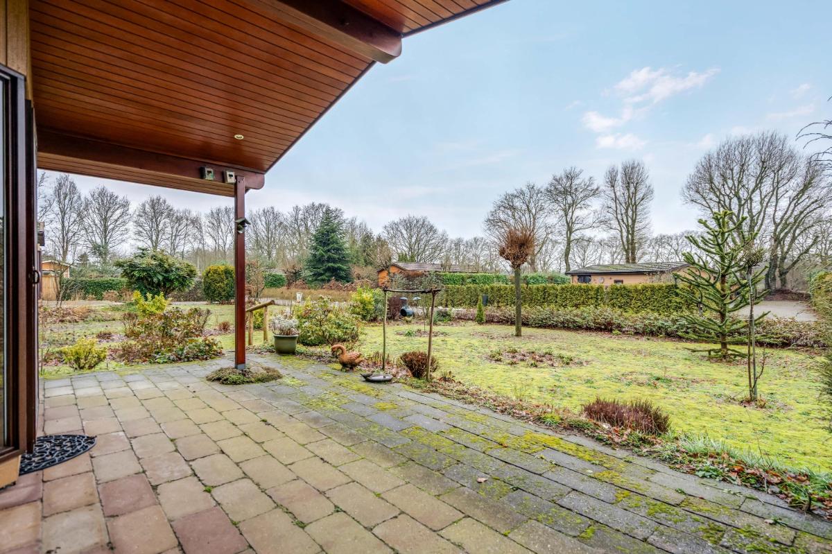 Onder de overkapping aan de woonkamerzijde zit je heerlijk beschut, of het nu regent of de zon schijnt. Het is de perfecte plek om ’s ochtends een kop koffie te drinken of ’s avonds rustig te ontspannen. De tuin zelf is speels aangelegd met gras, bomen en struiken, en biedt volop ruimte om te genieten van het buitenleven. Helemaal achterin staat een vrijstaande houten berging, ideaal voor het opbergen van fietsen, tuingereedschap of tuinmeubilair. Aan de achterzijde van het perceel is ruimte om de auto op eigen terrein te parkeren.