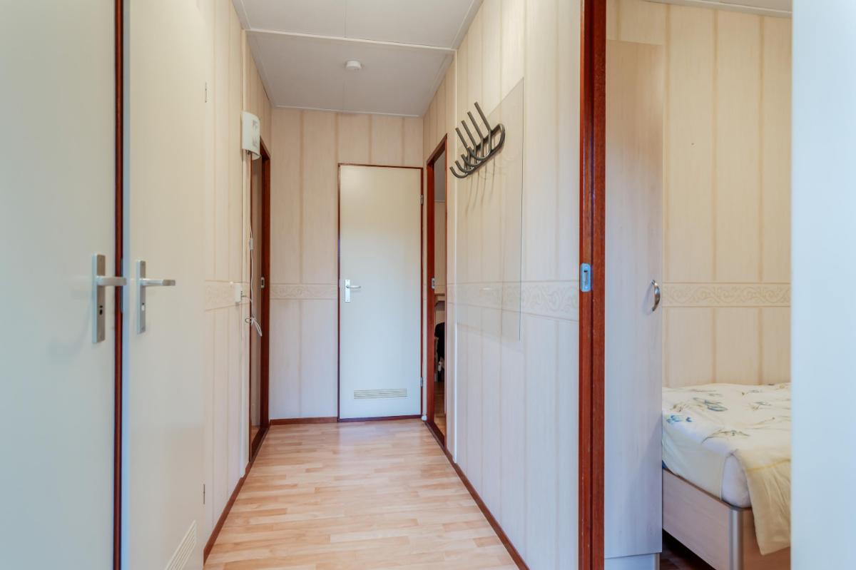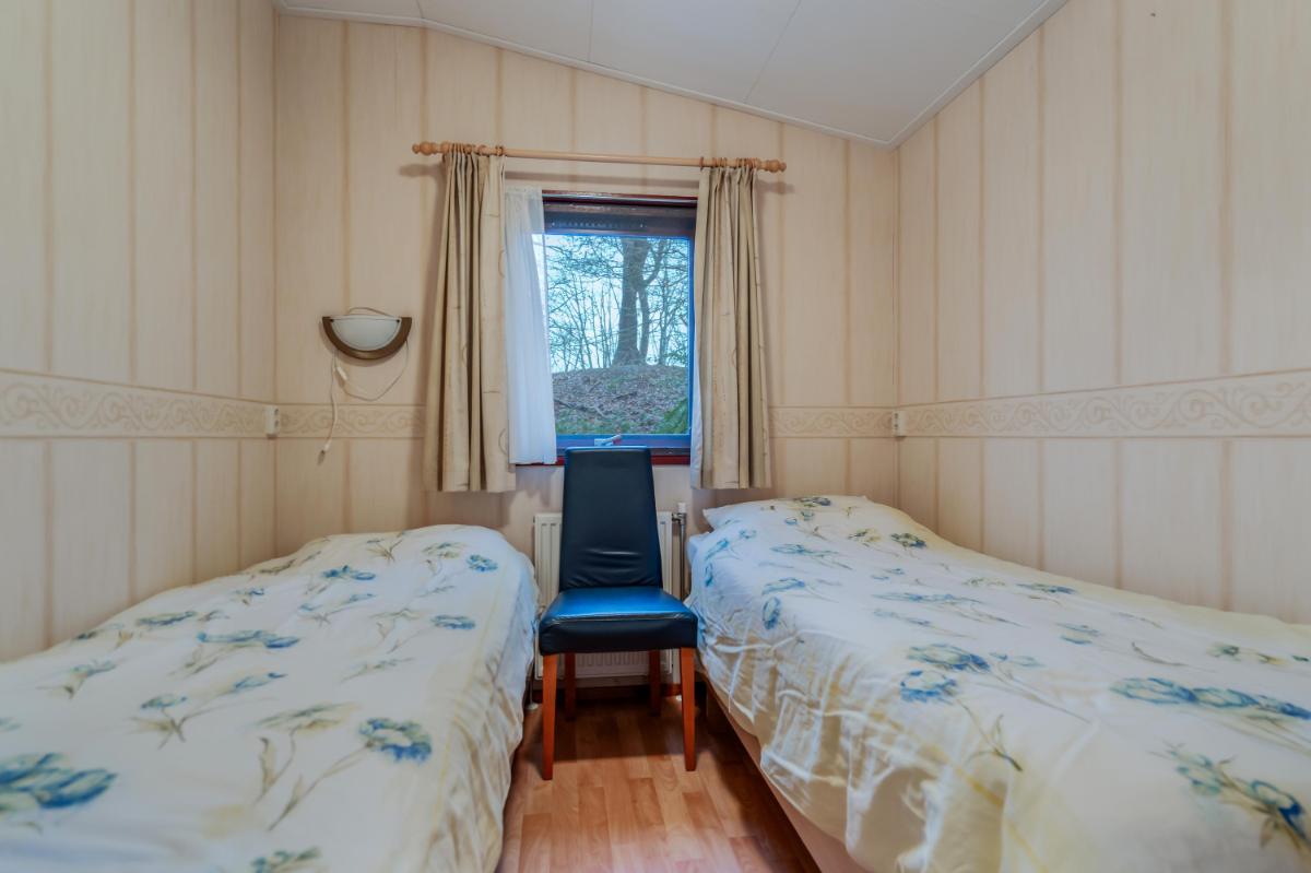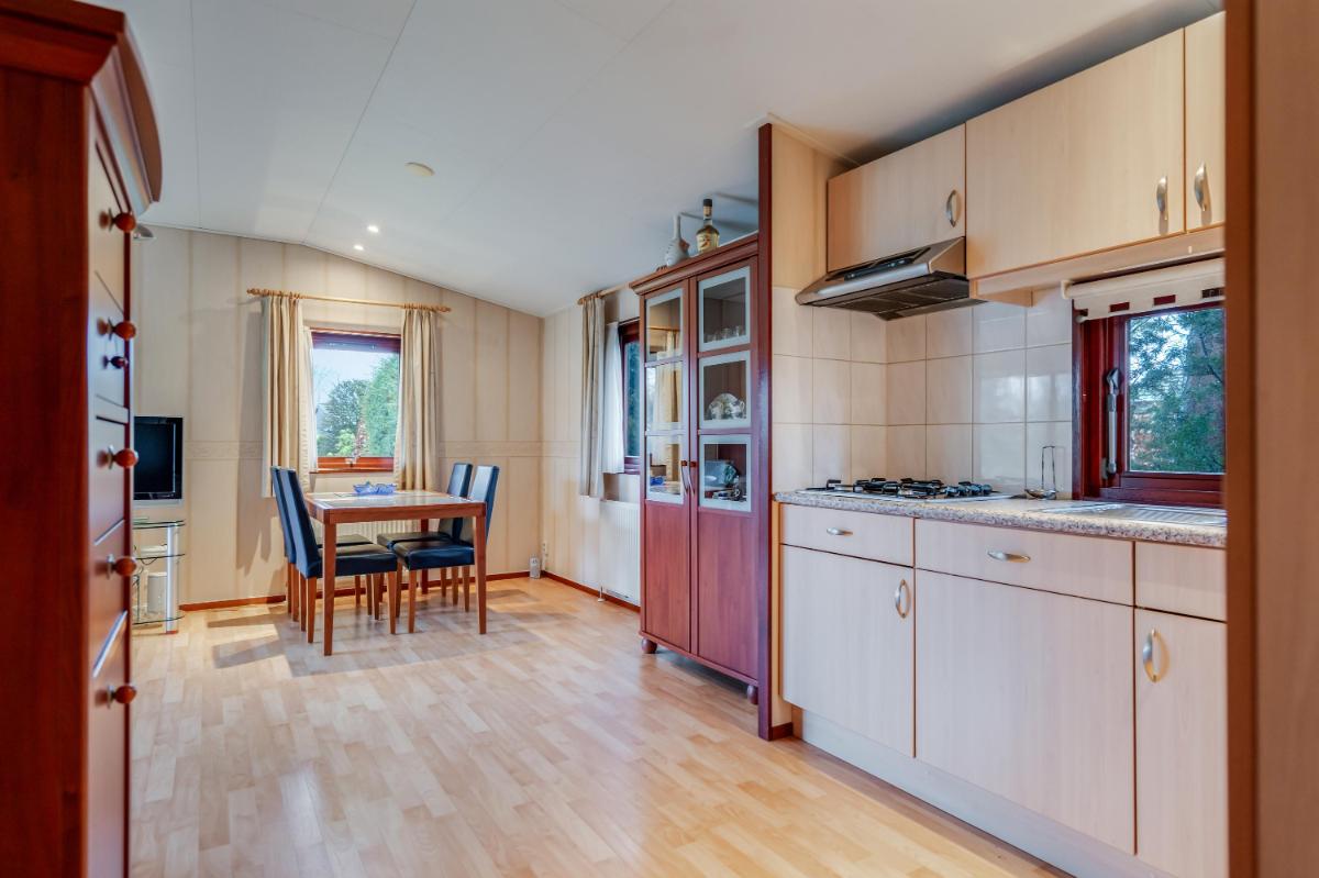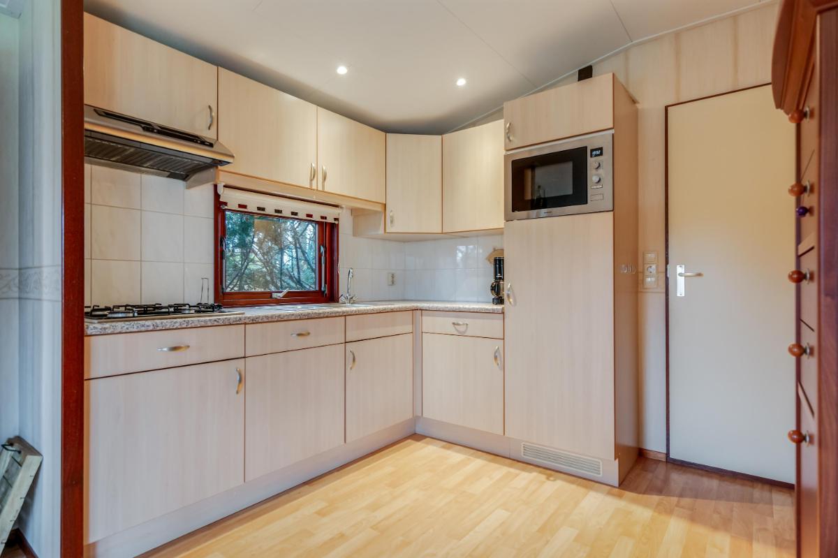 De keuken is apart en voorzien van een basic keukenblok met gaskookplaat en spoelbak. Er is voldoende ruimte voor een eethoek en het raam boven het aanrecht zorgt voor extra daglicht. Beide slaapkamers bevinden zich aan de andere zijde van het chalet. Ze zijn functioneel in te richten en krijgen voldoende licht door de ramen. Tussen de kamers in zit een vaste kast voor extra bergruimte.