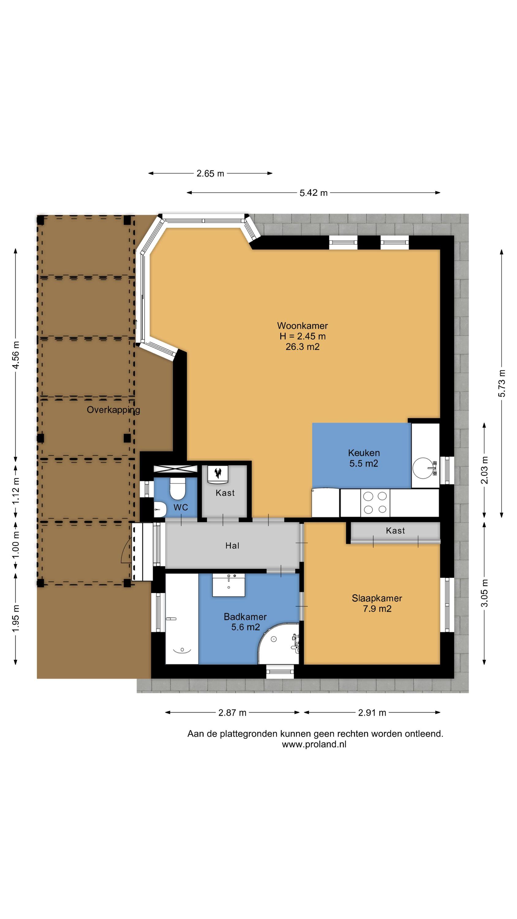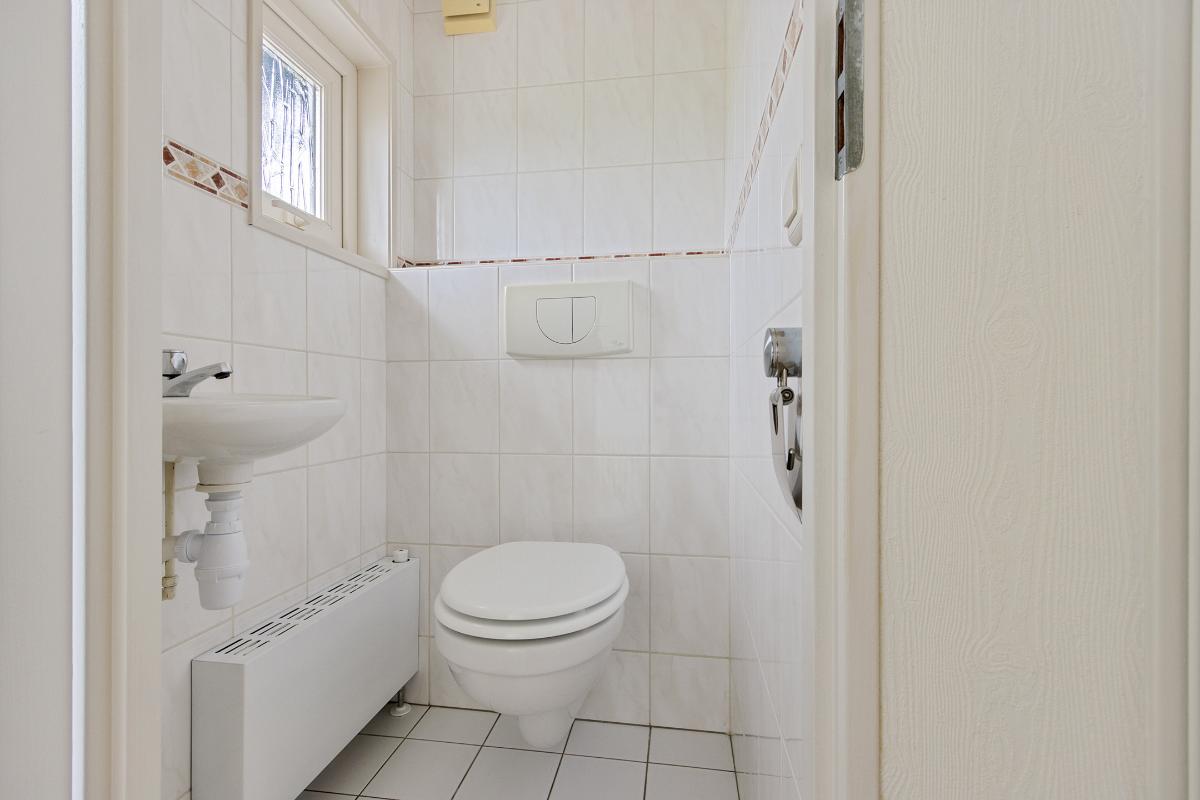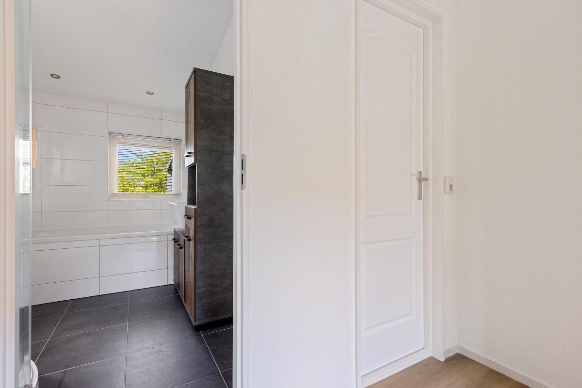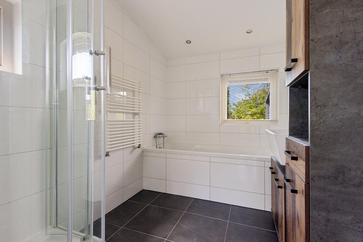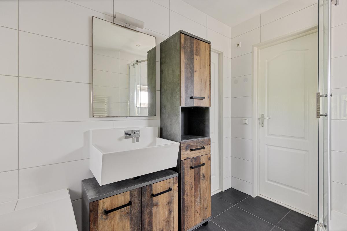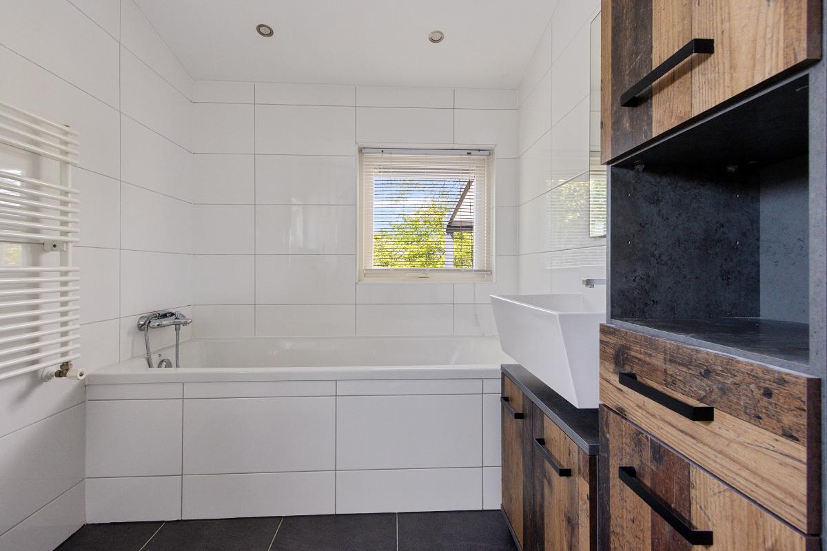 • Begane grond Bij binnenkomst via de hal valt direct de overzichtelijke en comfortabele indeling op. Aan de rechterzijde ligt de moderne badkamer van 5,6 m², uitgerust met zowel een ligbad als een aparte douche, een strak wastafelmeubel en neutrale wand- en vloertegels. Het toilet is slim separaat geplaatst – praktisch en comfortabel. Rechtdoor bevindt zich de gezellige slaapkamer van 7,9 m², voorzien van een rustige pvc-vloer. Grote ramen zorgen voor een natuurlijke lichtinval en uitzicht op het omliggende groen. Aan de linkerkant van de hal leidt de doorgang naar de royale woonkamer van 26,3 m², waar de laminaatvloer in warme houtlook direct opvalt en bijdraagt aan de warme, natuurlijke uitstraling. Een speelse erker en schuifpui zorgen voor overvloedig daglicht en bieden prachtig zicht op de vijver en tuin. De sfeer is licht, ruim en uitnodigend. De halfopen keuken (5,5 m²) is functioneel en modern, met onder andere een gaskookplaat, afzuigkap, koelkast en vaatwasser. De houten accenten sluiten mooi aan bij de rest van het interieur.