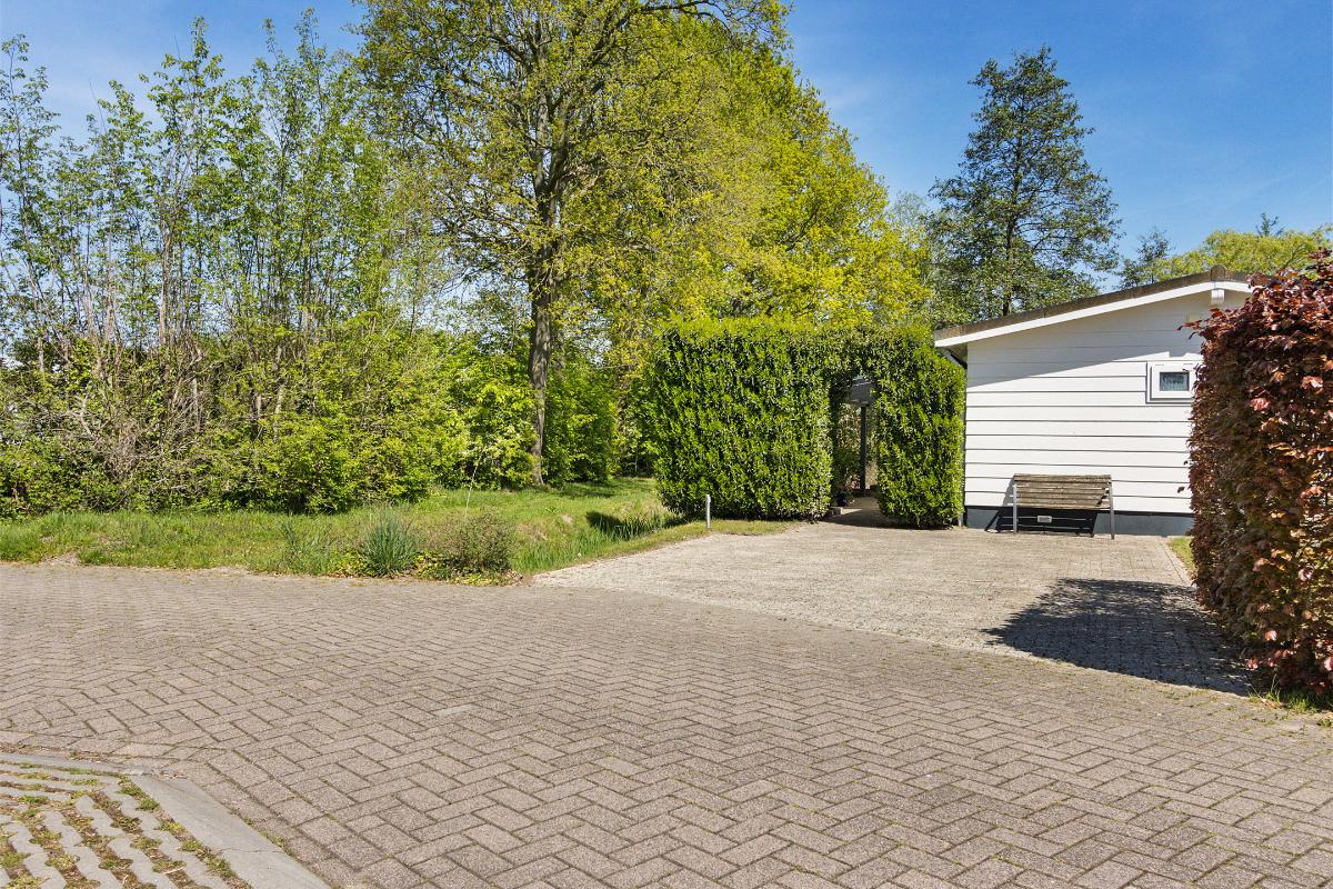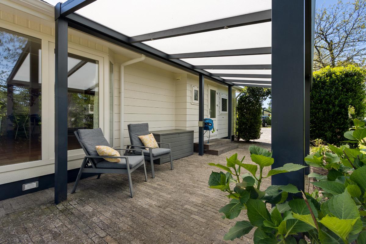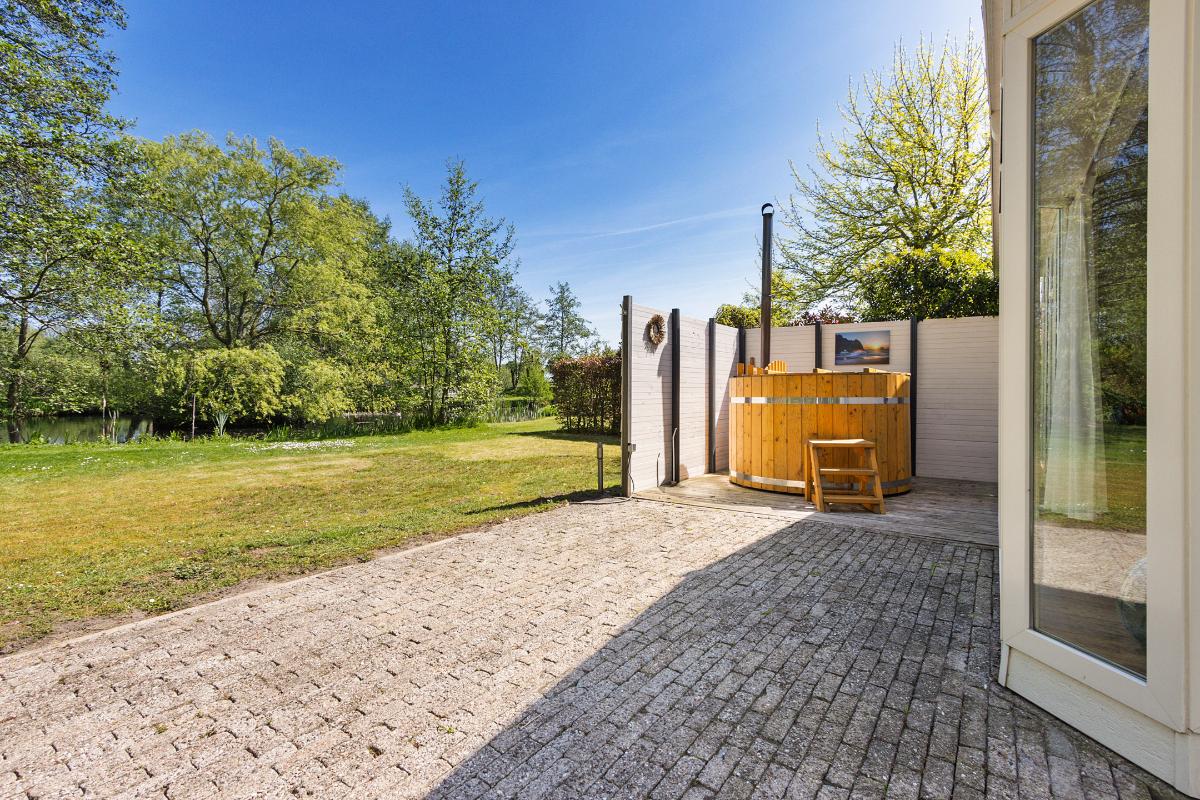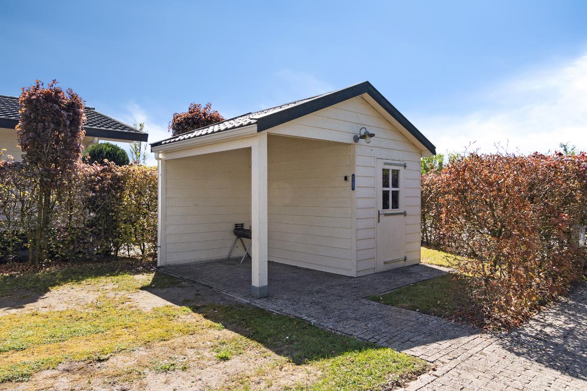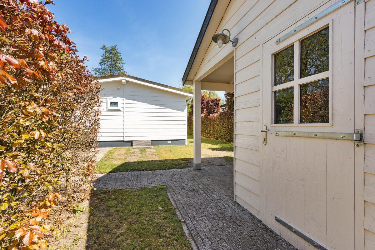 • Buiten De tuin rondom is fraai aangelegd, met veel gras, volwassen begroeiing en meerdere zitplekken, waaronder een ruim overdekt terras – perfect om lange zomeravonden door te brengen. De ligging aan de vijver geeft een extra gevoel van vrijheid en openheid. Aan de zijkant van het perceel staat een vrijstaande houten berging van circa 6 m², voorzien van elektra. Hier kun je met gemak fietsen, tuingereedschap of buitenmeubilair kwijt. Aangrenzend aan de berging bevindt zich een tweede overkapping voor extra beschutting en gemak.