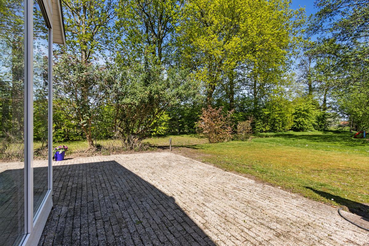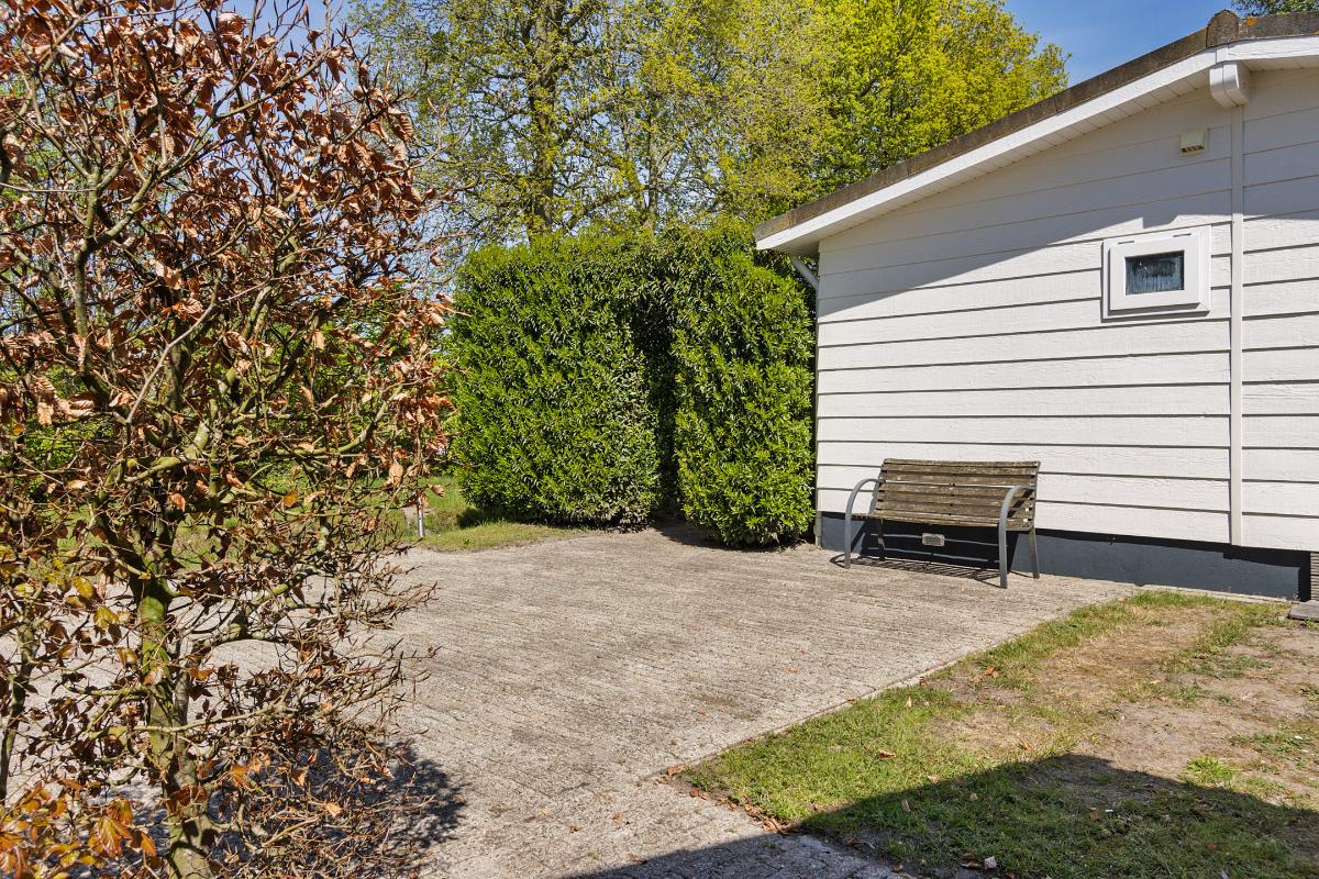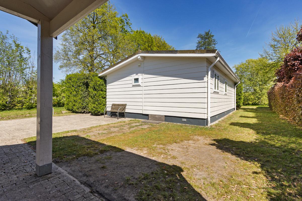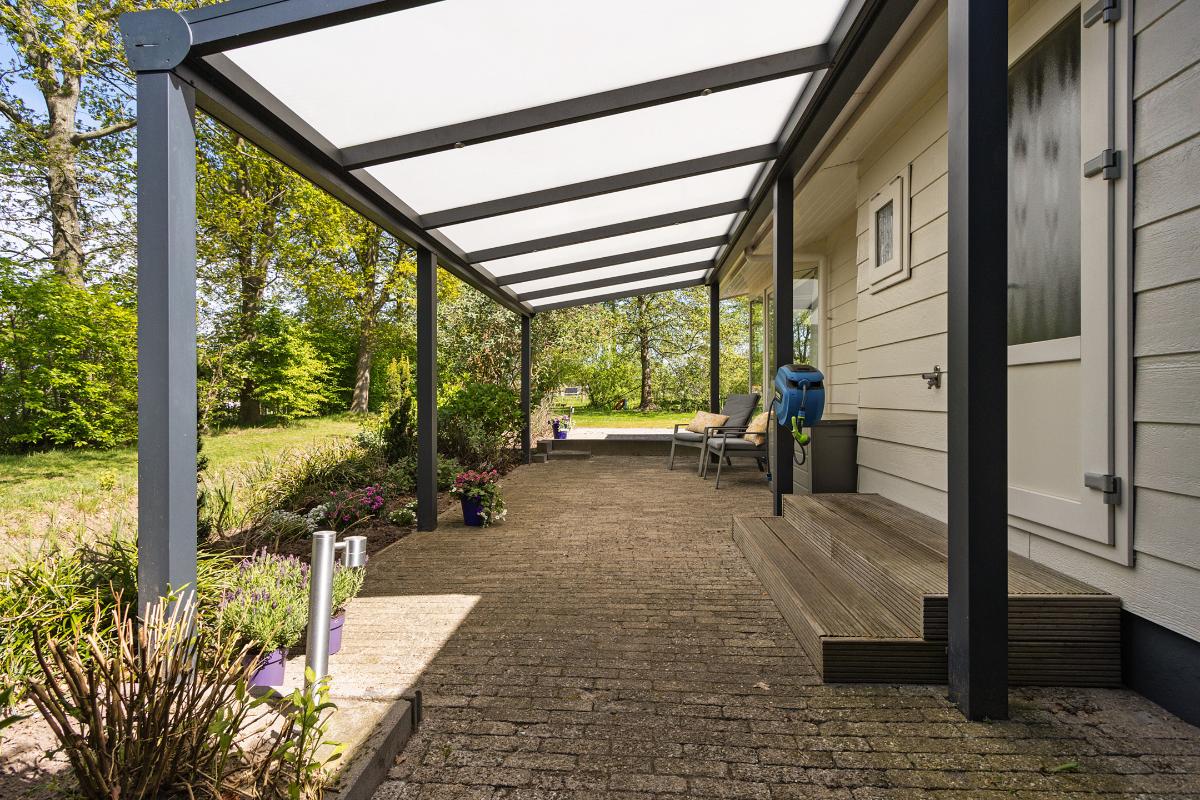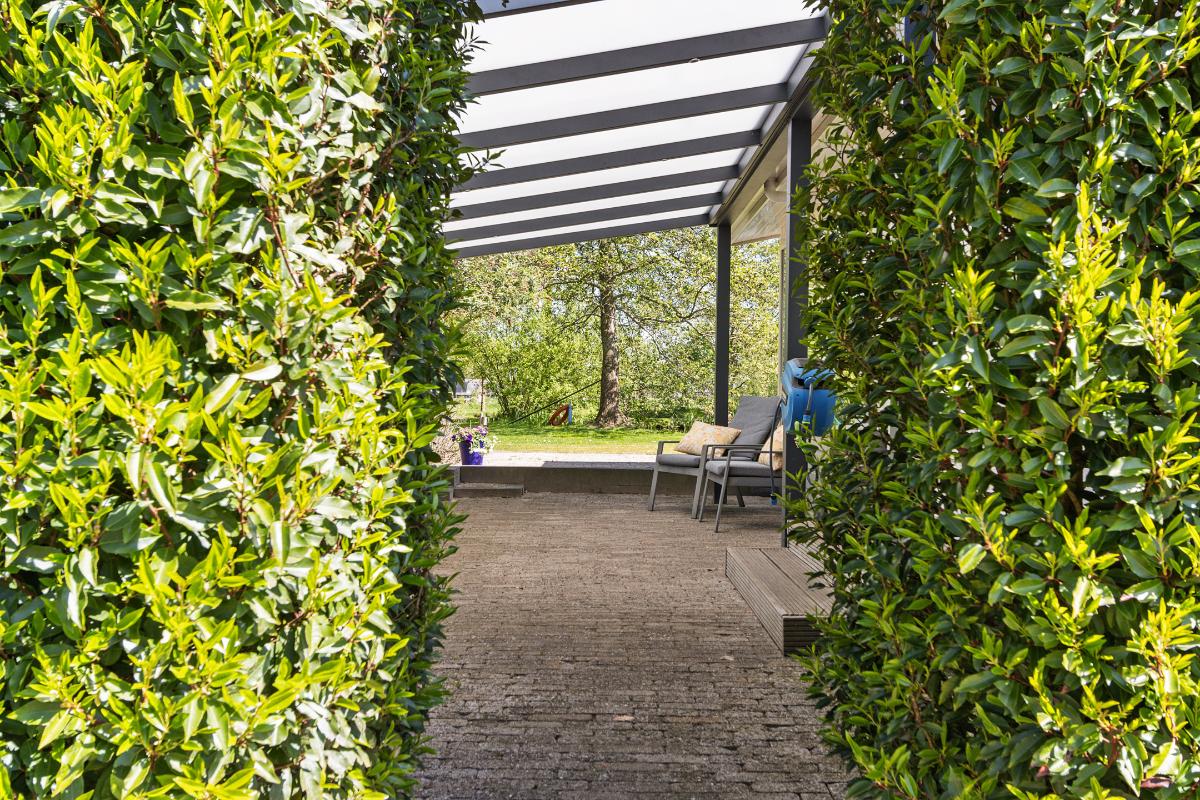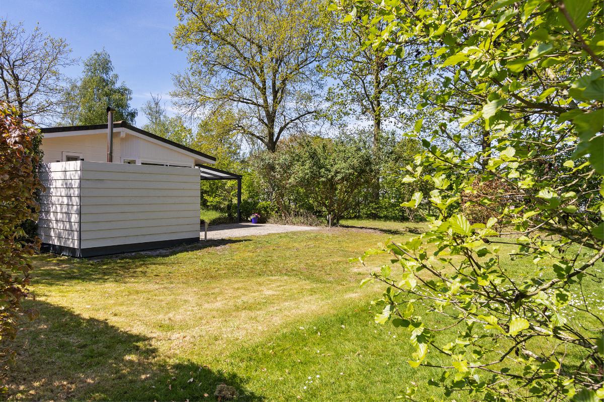 • Buiten De tuin rondom is fraai aangelegd, met veel gras, volwassen begroeiing en meerdere zitplekken, waaronder een ruim overdekt terras – perfect om lange zomeravonden door te brengen. De ligging aan de vijver geeft een extra gevoel van vrijheid en openheid. Aan de zijkant van het perceel staat een vrijstaande houten berging van circa 6 m², voorzien van elektra. Hier kun je met gemak fietsen, tuingereedschap of buitenmeubilair kwijt. Aangrenzend aan de berging bevindt zich een tweede overkapping voor extra beschutting en gemak.
