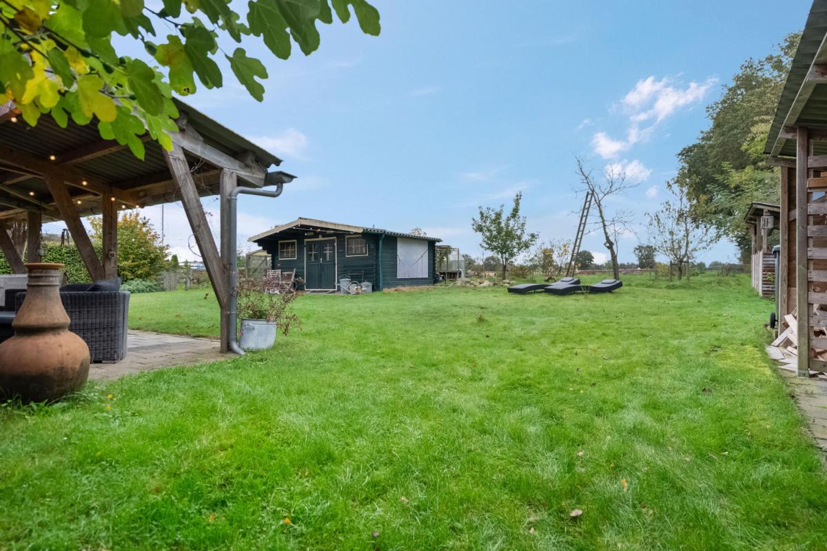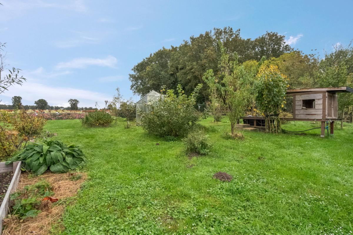 Een tuin om van te dromen Rondom de woning strekt zich een prachtig aangelegde tuin uit – een biologische pluktuin en moestuin op het zonnige zuid-zuidwesten. Een levend schilderij, vol fruitbomen, kruiden, bessenstruiken en vaste planten. Alles groeit hier in harmonie met de natuur. Verder vind je hier: • Een sfeervolle vijver met natuurlijke beplanting • Een houthok (4 units, 12–16 m³) • Een vierbaks compostsysteem • Een dompelbad voor zomerse verkoeling • Een grote overkapping langs de schuur • Een tuinhuis met werkbank • Een broeikas en droogmolen • Een speelhuisje voor kinderen • En toegang tot het achterliggende bosgebied met uitzicht over velden vol dahlia’s in bloei De tuinverlichting werkt op een schemerschakelaar, en de schuur is aangesloten op water, elektra en afvoer. Een buitenruimte met karakter, comfort en rust – waar elk seizoen zijn eigen charme heeft.