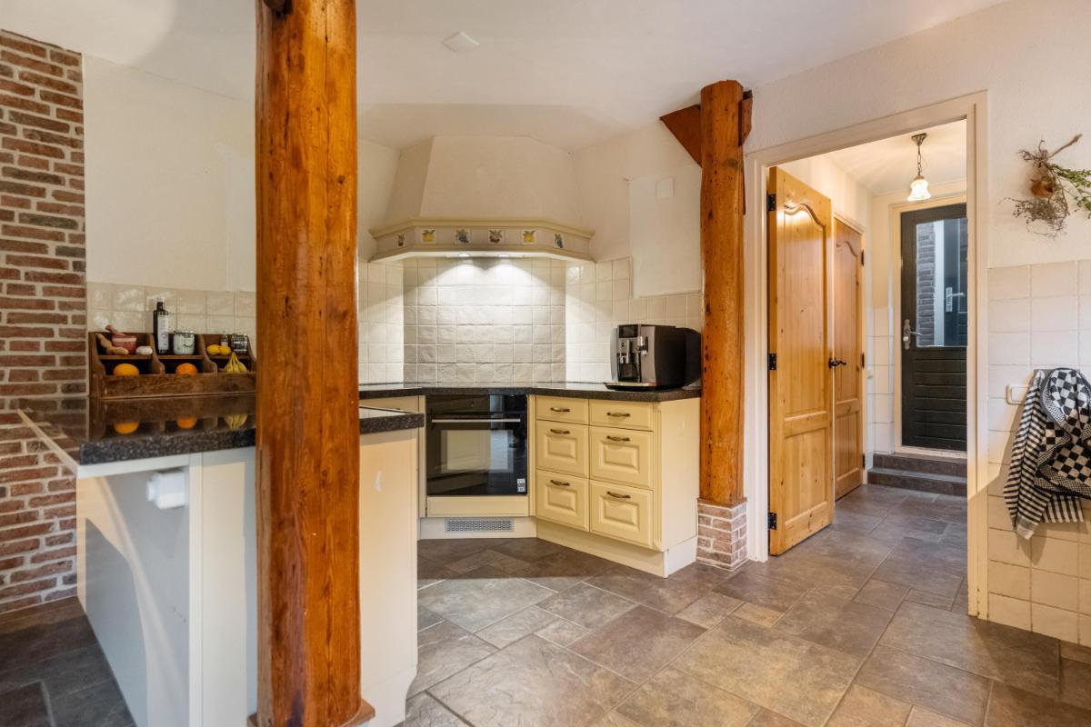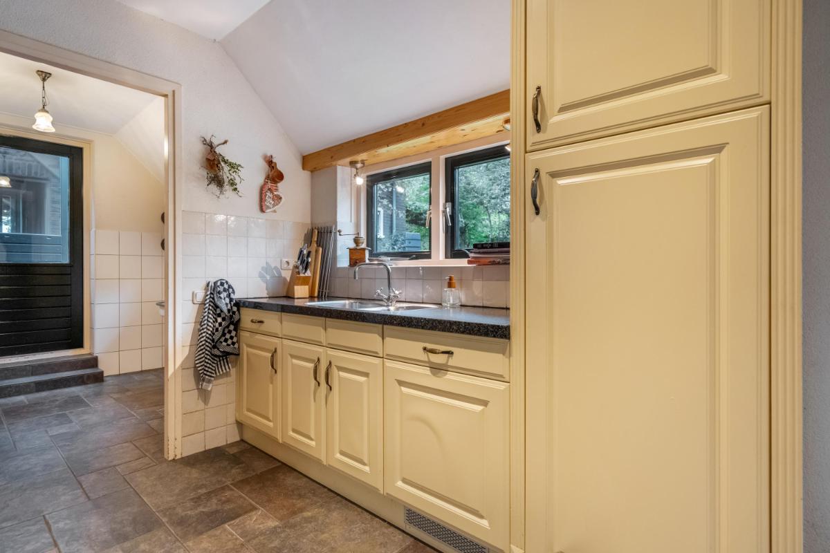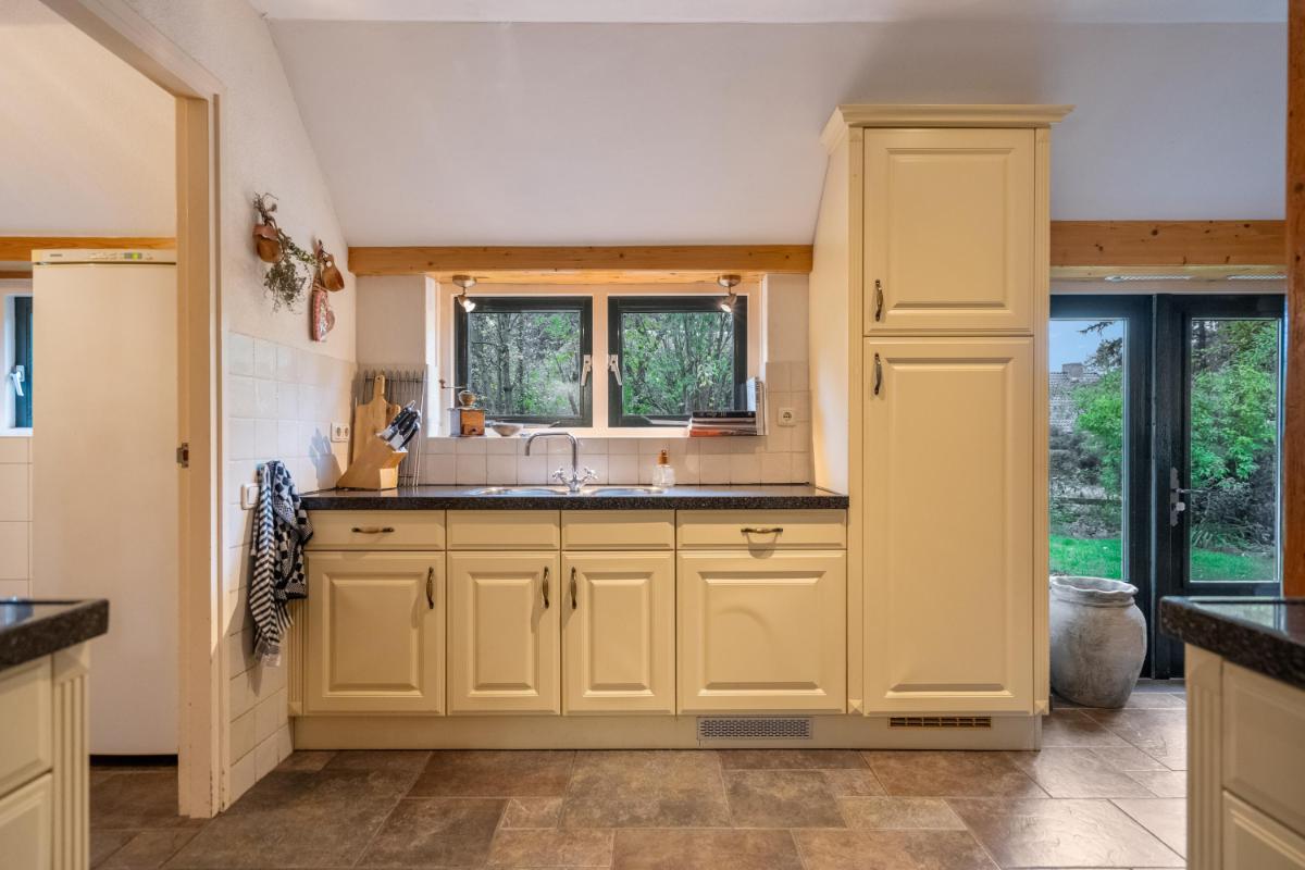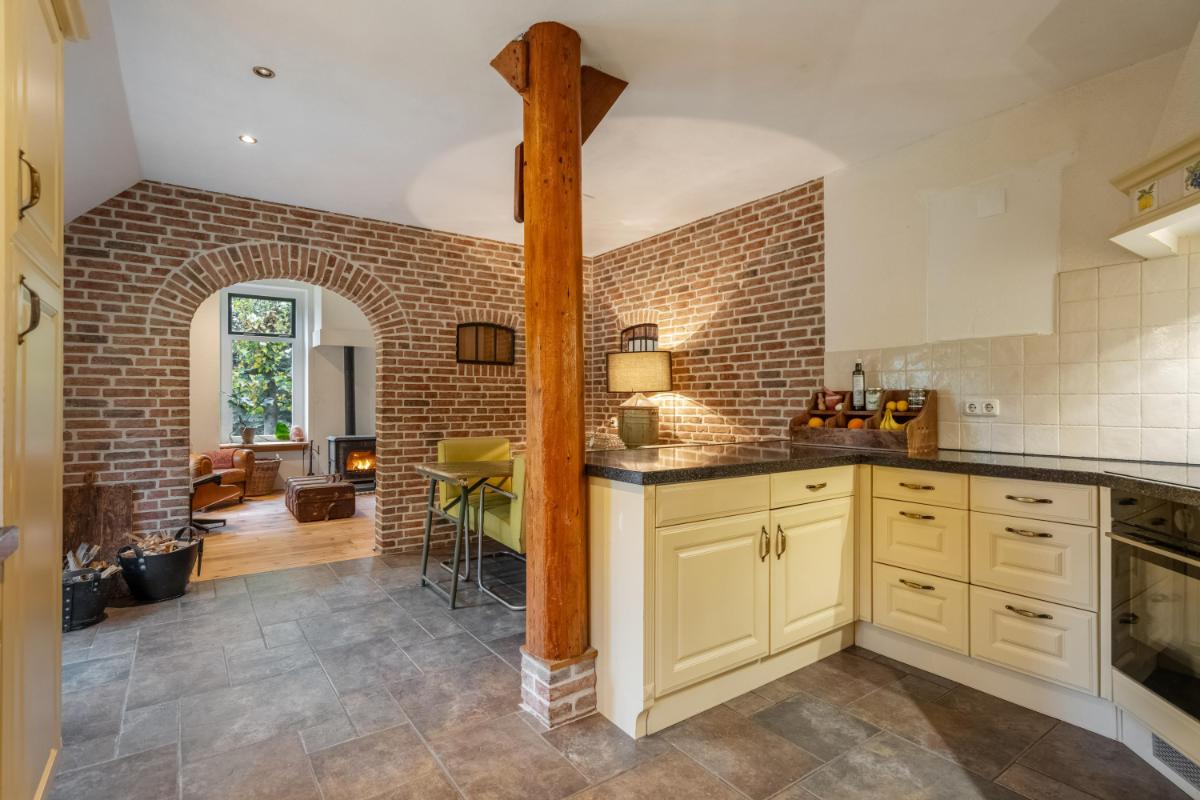Wonen met licht, lucht en levensruimte De oprit biedt plaats aan meerdere auto’s en leidt naar de charmante entree. De hal is ruim opgezet met garderobe, meterkast, kelderkast en een modern toilet met fontein. Vanuit hier stap je door naar de lichte woonkamer (ca. 30 m²), waar grote ramen een panoramisch uitzicht bieden over het groen van de tuin. De sfeer is warm en uitnodigend – de ideale plek voor lange avonden bij de haard, met het zachte licht van de ondergaande zon door de ramen. De woonkeuken vormt het kloppende hart van het huis. Een moderne, gezellige ruimte met inbouwapparatuur (grotendeels vernieuwd in 2024), ruim werkblad en een logische indeling. Hier kook je niet alleen, hier leef je. De vloer is, net als in de hal, badkamer, bijkeuken, keuken en slaapkamer, voorzien van vloerverwarming – afzonderlijk regelbaar per ruimte voor optimaal comfort.