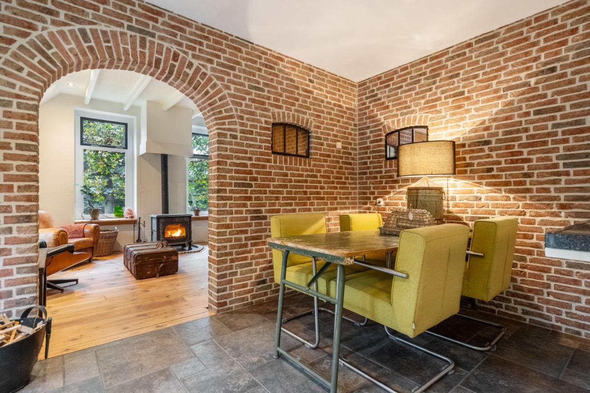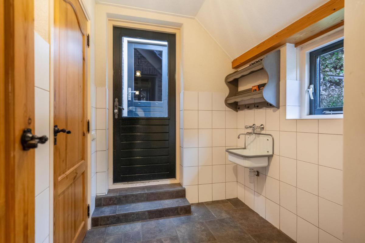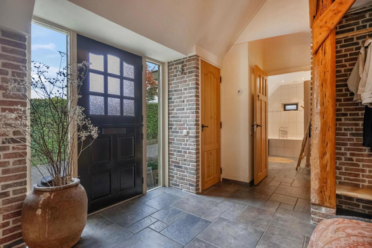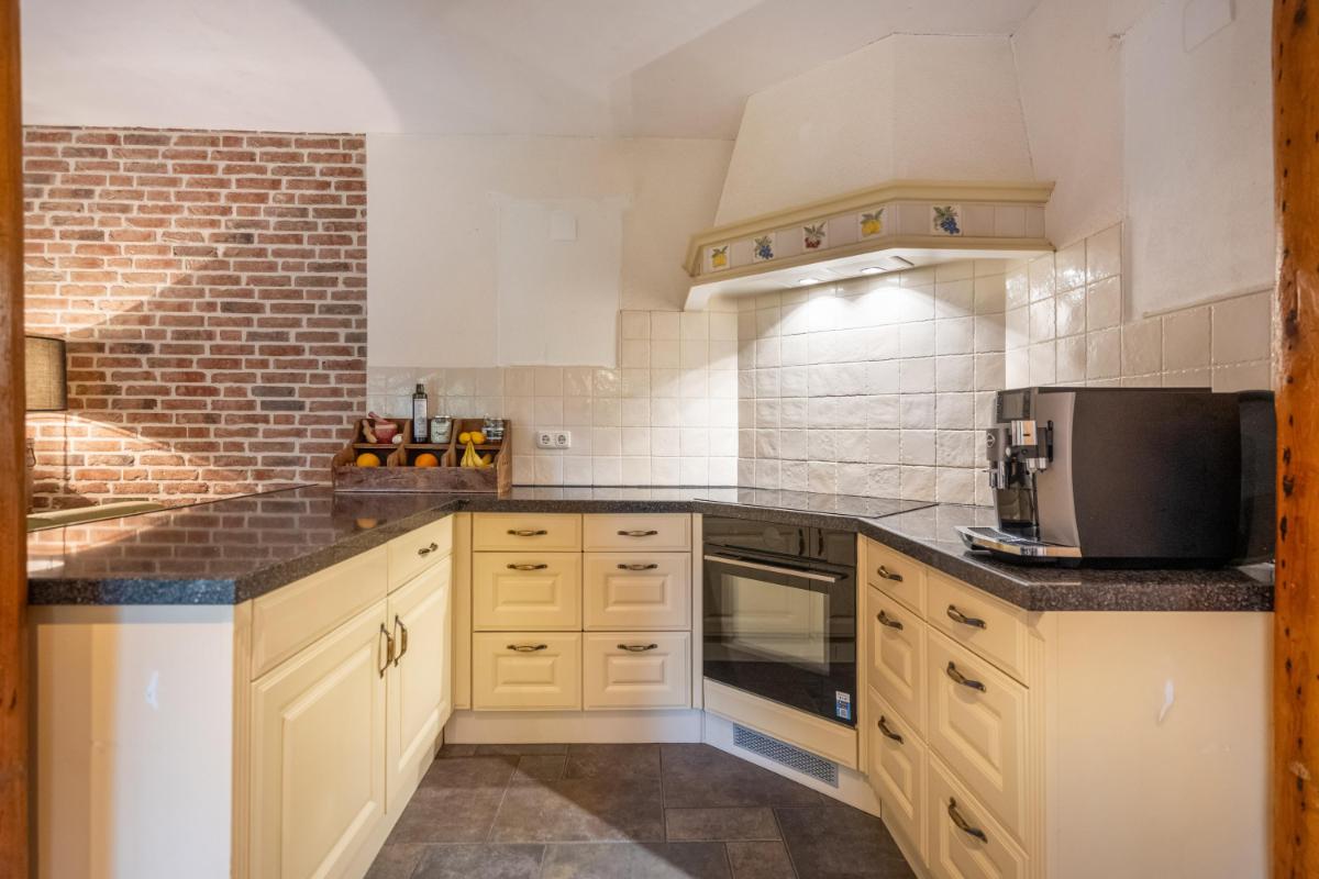 Wonen met licht, lucht en levensruimte De oprit biedt plaats aan meerdere auto’s en leidt naar de charmante entree. De hal is ruim opgezet met garderobe, meterkast, kelderkast en een modern toilet met fontein. Vanuit hier stap je door naar de lichte woonkamer (ca. 30 m²), waar grote ramen een panoramisch uitzicht bieden over het groen van de tuin. De sfeer is warm en uitnodigend – de ideale plek voor lange avonden bij de haard, met het zachte licht van de ondergaande zon door de ramen. De woonkeuken vormt het kloppende hart van het huis. Een moderne, gezellige ruimte met inbouwapparatuur (grotendeels vernieuwd in 2024), ruim werkblad en een logische indeling. Hier kook je niet alleen, hier leef je. De vloer is, net als in de hal, badkamer, bijkeuken, keuken en slaapkamer, voorzien van vloerverwarming – afzonderlijk regelbaar per ruimte voor optimaal comfort.