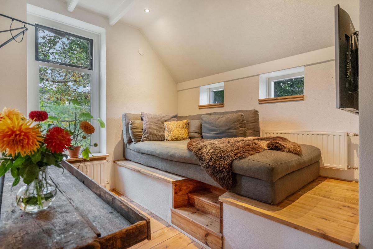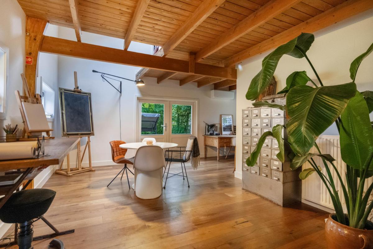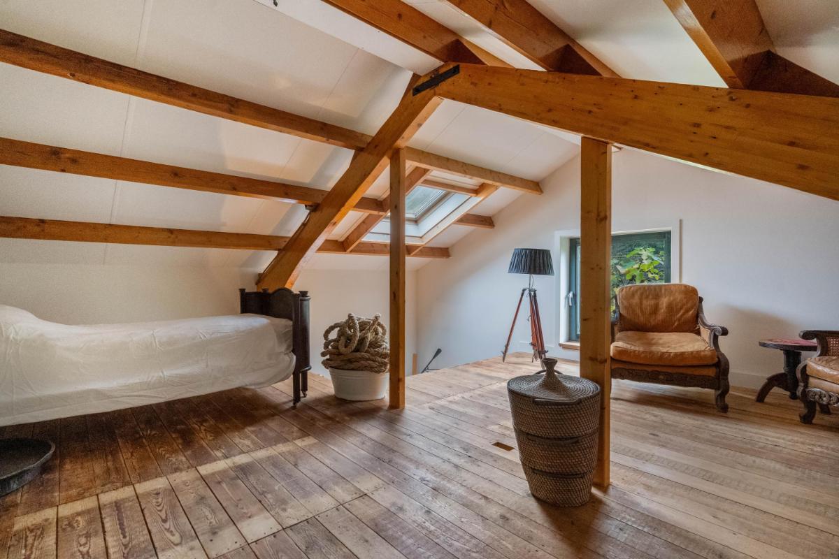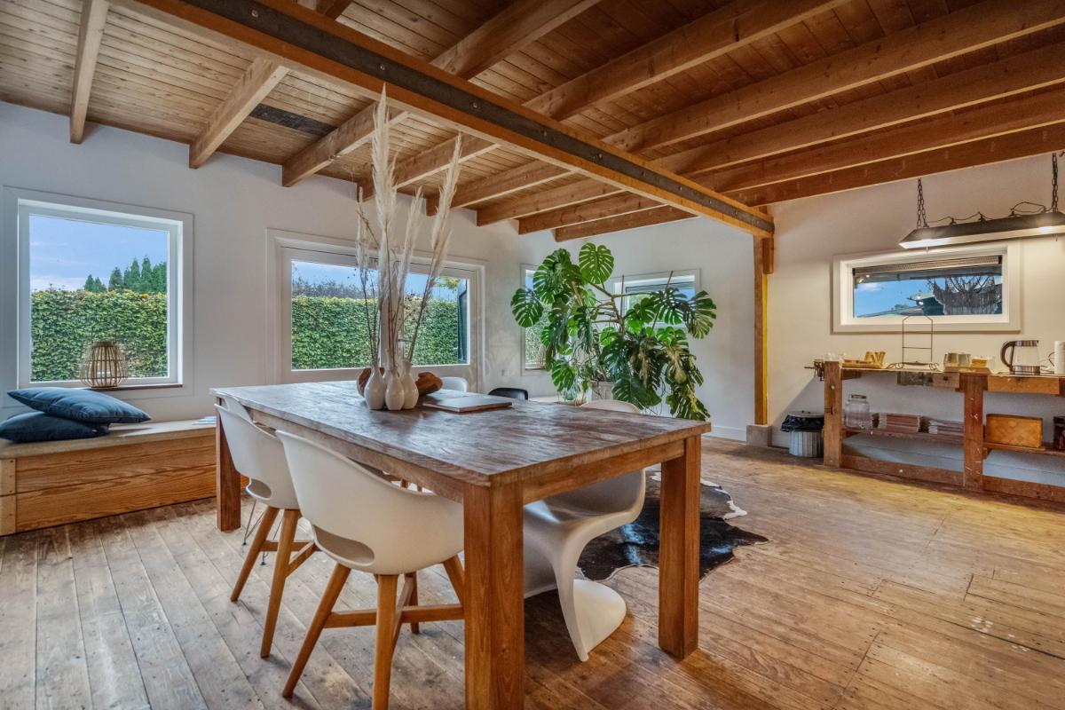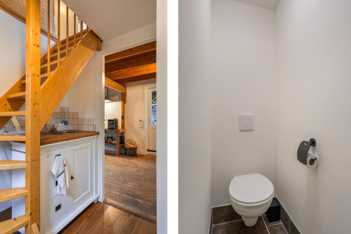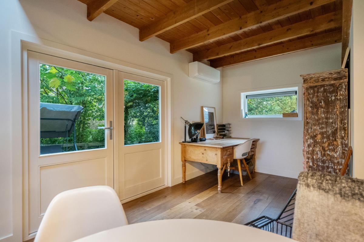 Het bijgebouw, multifunctioneel en eigentijds Een groot pluspunt van deze woonboerderij is het vrijstaande bijgebouw (ca. 60 m²), in 2025 volledig gerenoveerd met oog voor detail en kwaliteit. Het gebouw bestaat uit twee zelfstandige delen, elk met eigen voorzieningen. Het ene deel heeft een volwaardige badkamer met douche en toilet – ideaal voor gasten of mantelzorg. Het andere deel beschikt over een pantry en apart toilet, perfect als kantoor, salon of atelier. Beide delen zijn uitstekend geïsoleerd en voorzien van daglichttoetreding én een eigen airco-unit voor zowel verwarming als koeling. De afwerking is strak, modern en duurzaam – een bijgebouw dat net zo comfortabel aanvoelt als de hoofdwoning. De extra slaapkamers zijn bovendien voorzien van knieschot-opbergruimte, wat de functionaliteit vergroot. Een ideale combinatie van wonen, werken en gastvrijheid, met maximale vrijheid.