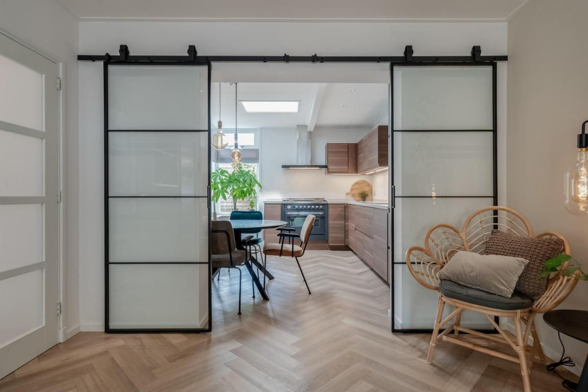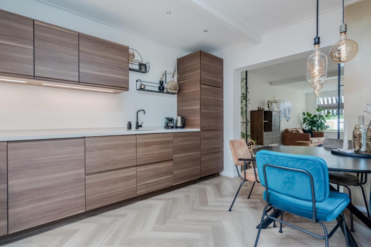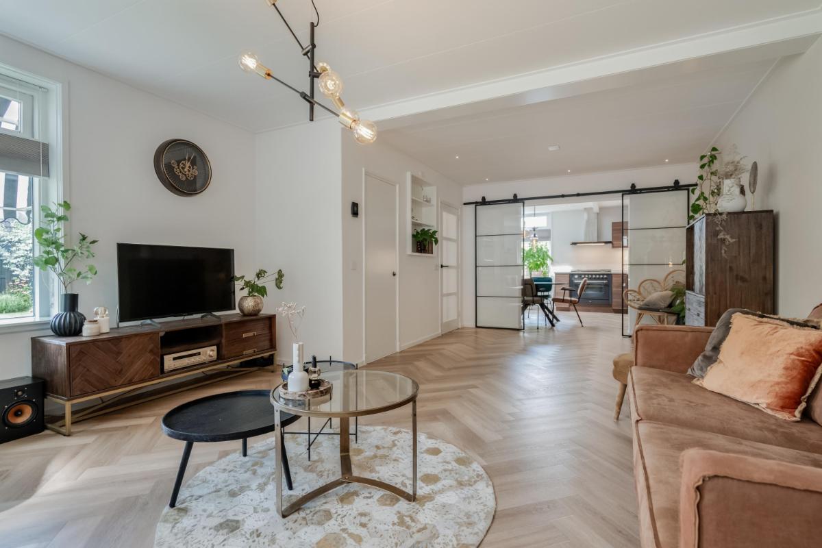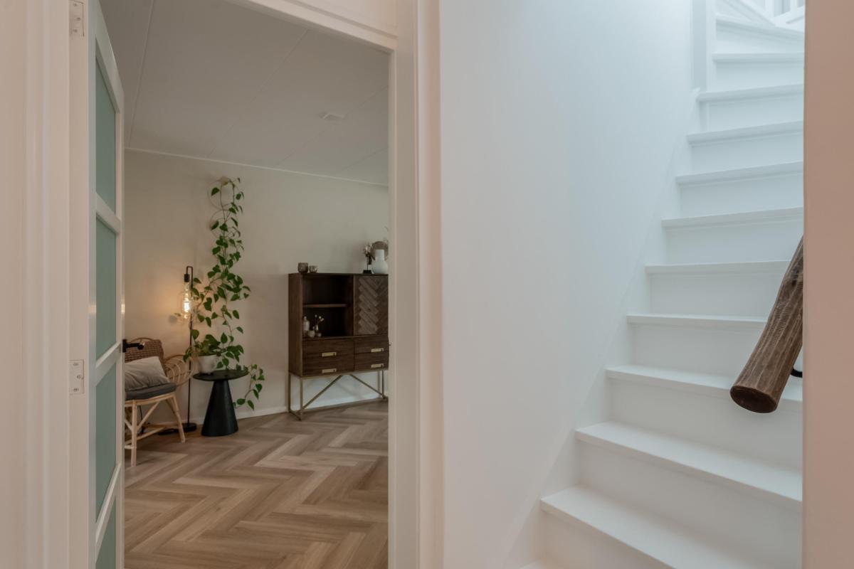 Begane grond Je stapt binnen in een ruime hal met trapopgang, meterkast en toegang tot de woonkamer. De lichte woonkamer van ca. 32 m² is strak afgewerkt en voorzien van vloerverwarming en een sfeervolle pvc visgraatvloer. De open keuken is praktisch ingericht en staat in directe verbinding met de bijkeuken. Aan de achterzijde bevindt zich een moderne badkamer met inloopdouche en wastafel én een separaat toilet!
