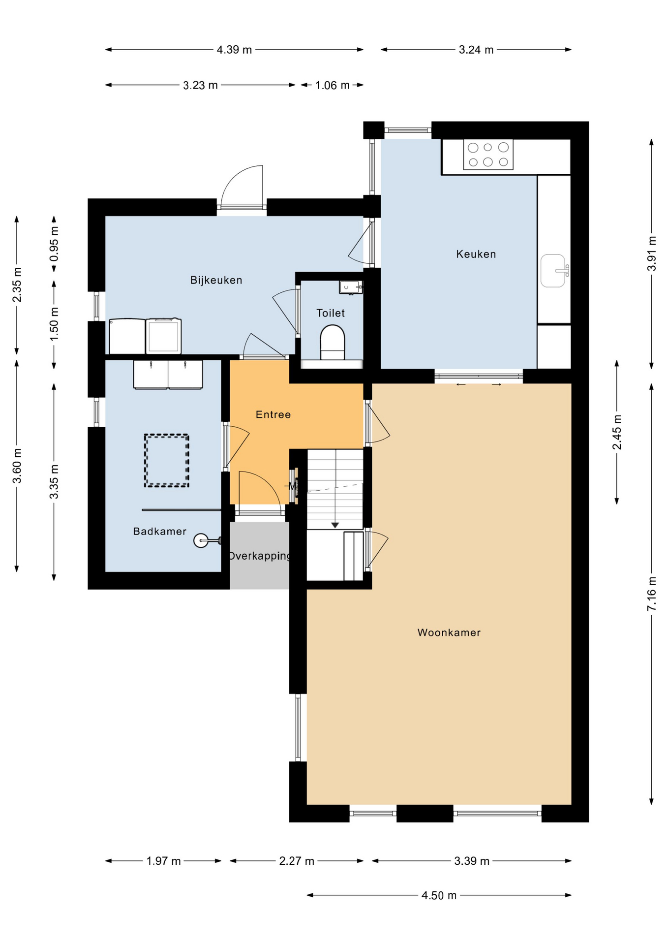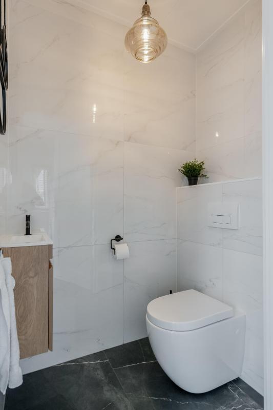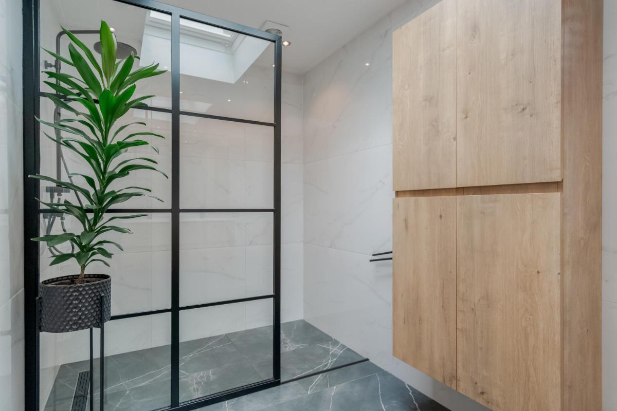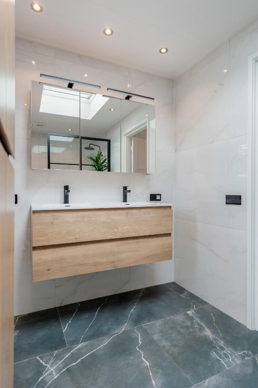 Begane grond Je stapt binnen in een ruime hal met trapopgang, meterkast en toegang tot de woonkamer. De lichte woonkamer van ca. 32 m² is strak afgewerkt en voorzien van vloerverwarming en een sfeervolle pvc visgraatvloer. De open keuken is praktisch ingericht en staat in directe verbinding met de bijkeuken. Aan de achterzijde bevindt zich een moderne badkamer met inloopdouche en wastafel én een separaat toilet!