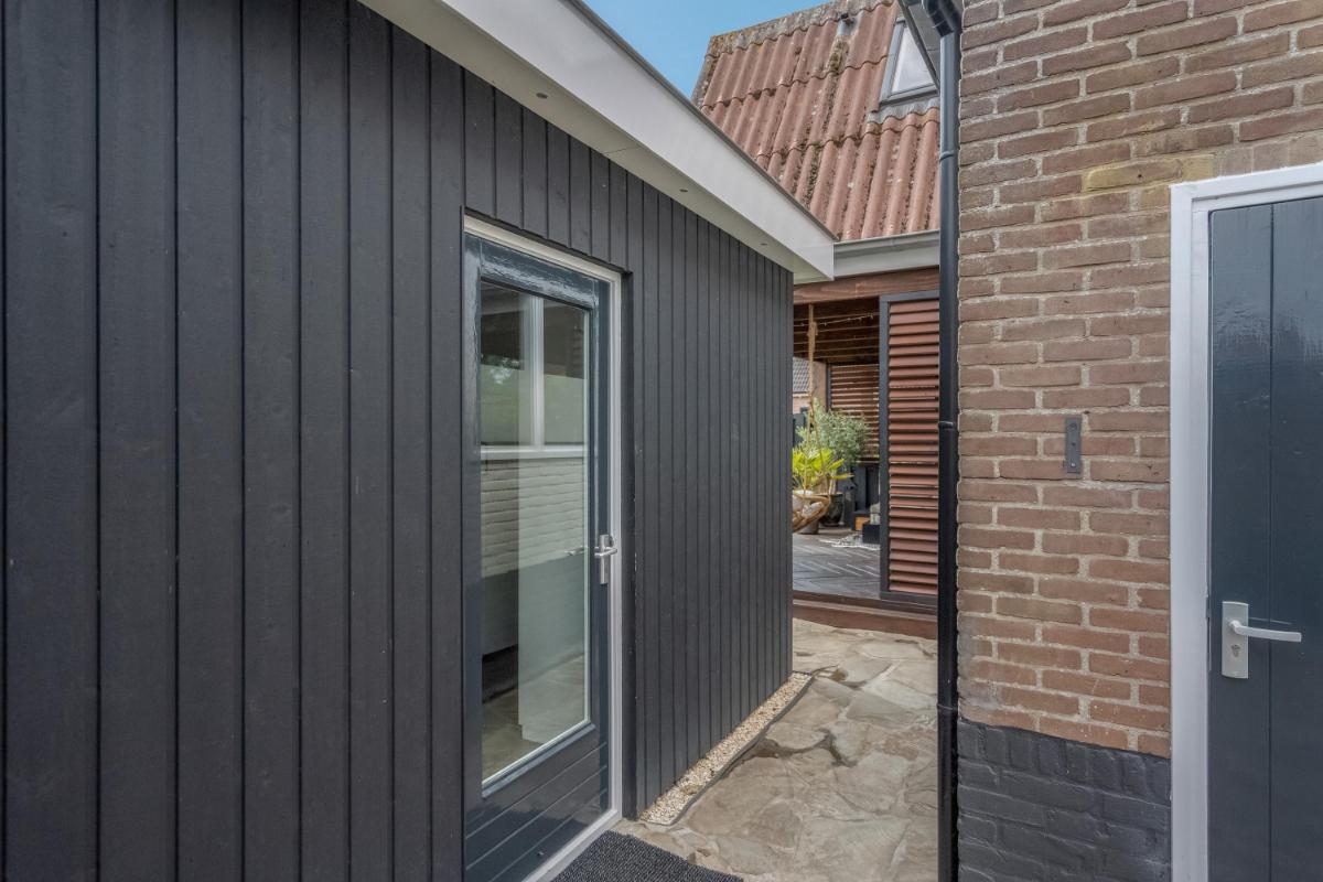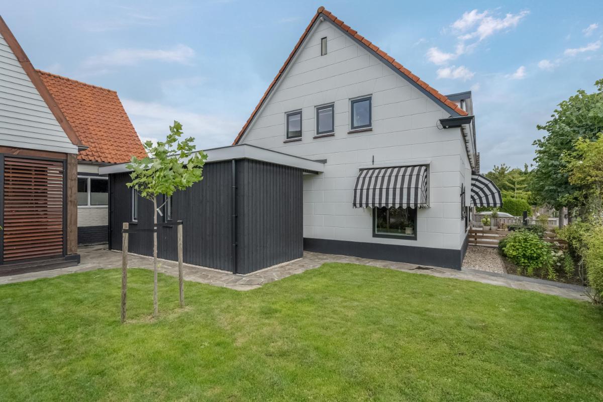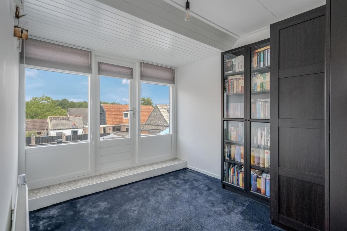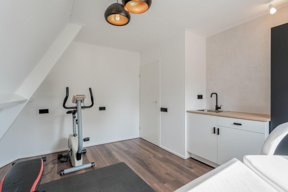 Garage & bergingen Wat een ruimte! Achter op het perceel staat een zeer royale stenen garage van ca. 92 m², voorzien van krachtstroom, elektra, water en openslaande deuren. De verdieping van ca. 73 m² is ingericht met o.a. twee extra kamers die prima dienst kunnen doen als werk- of logeerkamer. Daarnaast zijn er twee aparte bergingen aanwezig. Kortom: opslag, klusruimte of een hobby aan huis? Hier kan het allemaal.