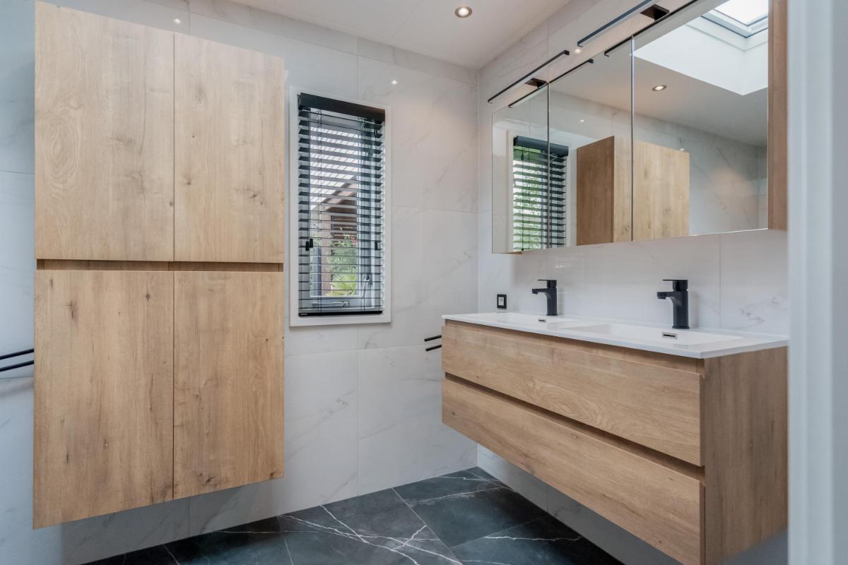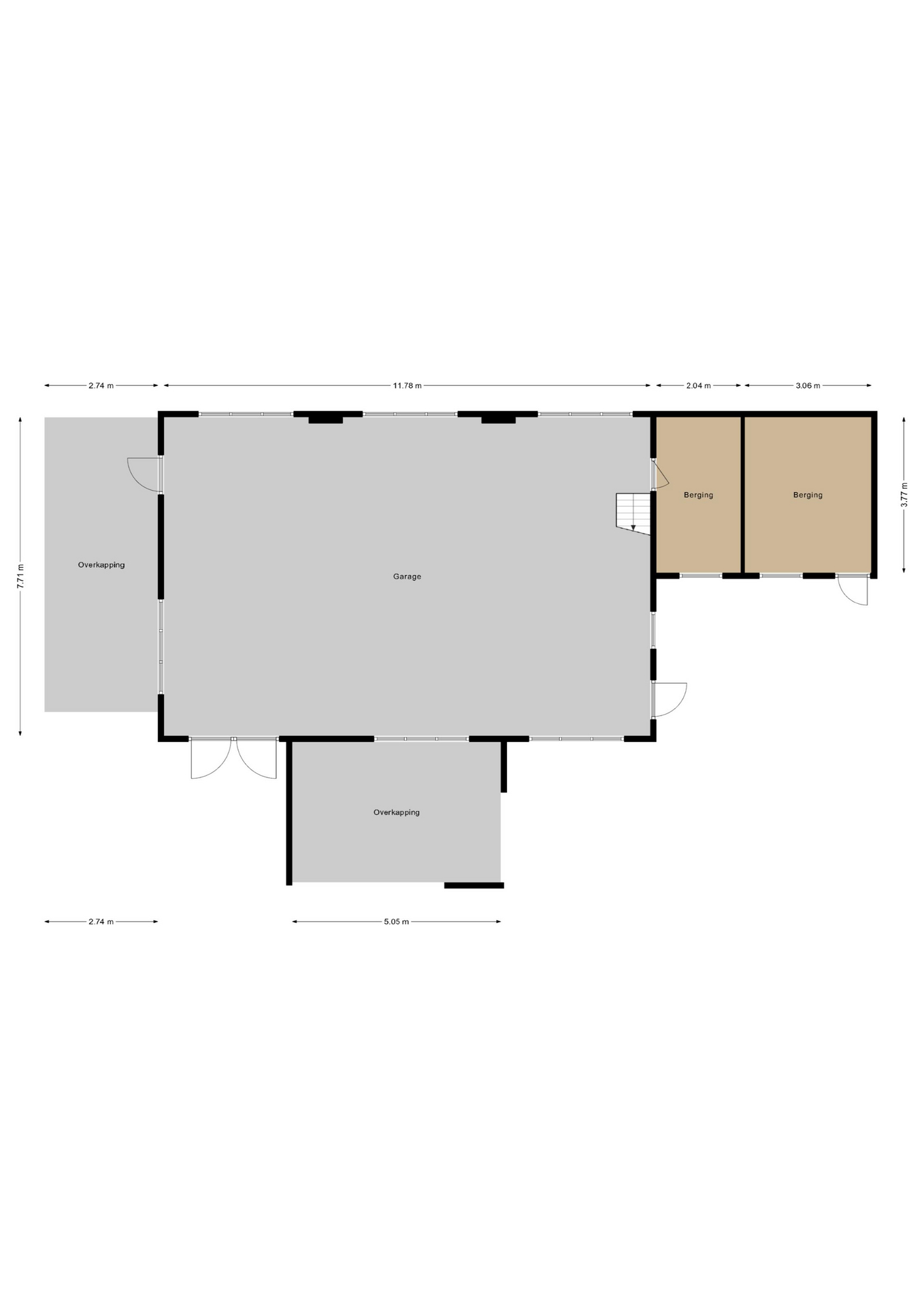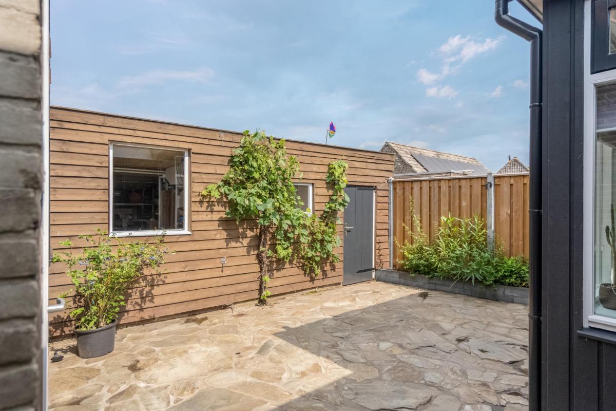 Garage & bergingen Wat een ruimte! Achter op het perceel staat een zeer royale stenen garage van ca. 92 m², voorzien van krachtstroom, elektra, water en openslaande deuren. De verdieping van ca. 73 m² is ingericht met o.a. twee extra kamers die prima dienst kunnen doen als werk- of logeerkamer. Daarnaast zijn er twee aparte bergingen aanwezig. Kortom: opslag, klusruimte of een hobby aan huis? Hier kan het allemaal.