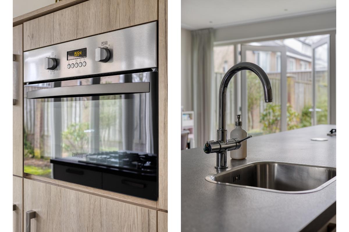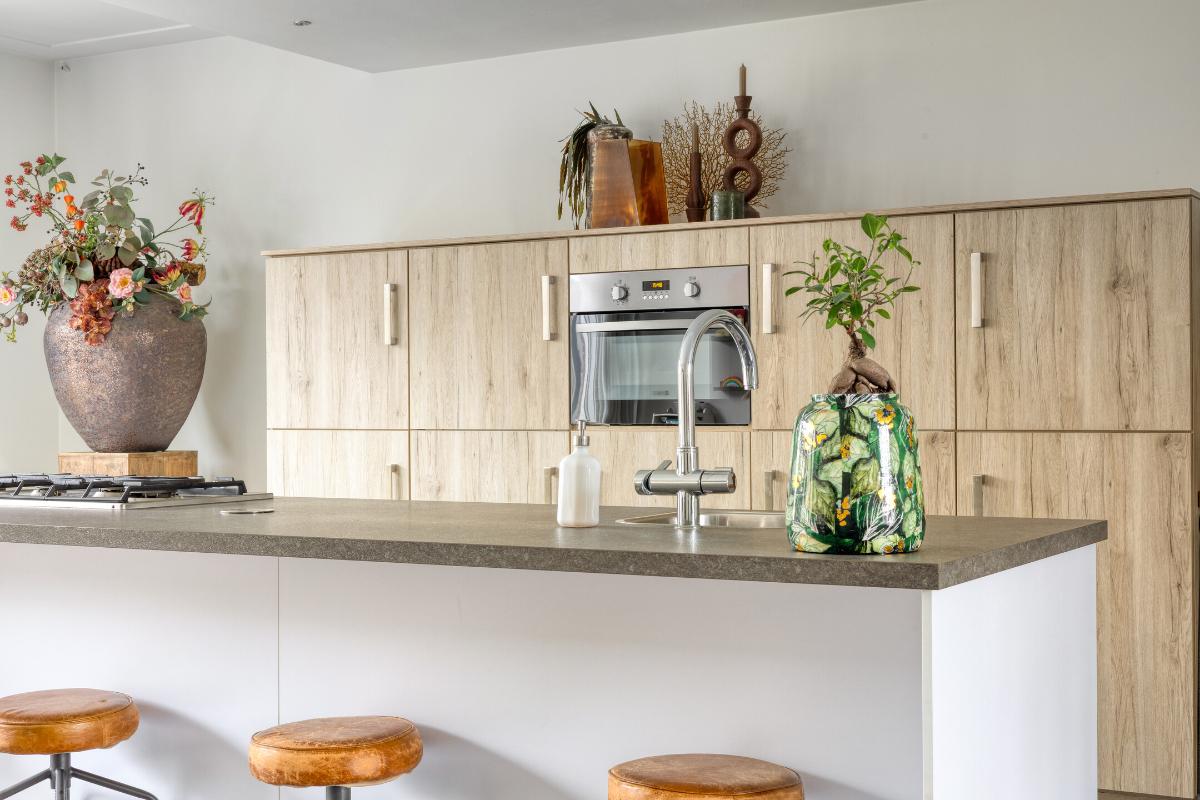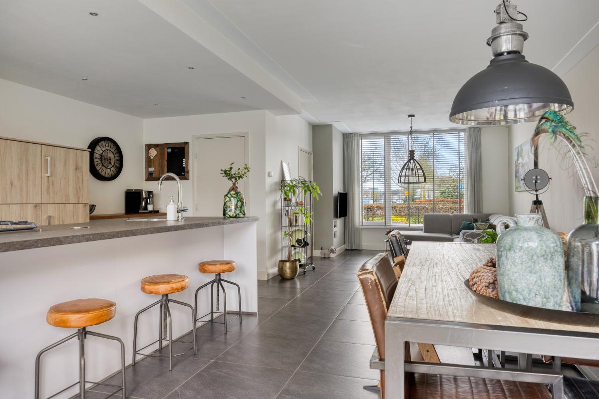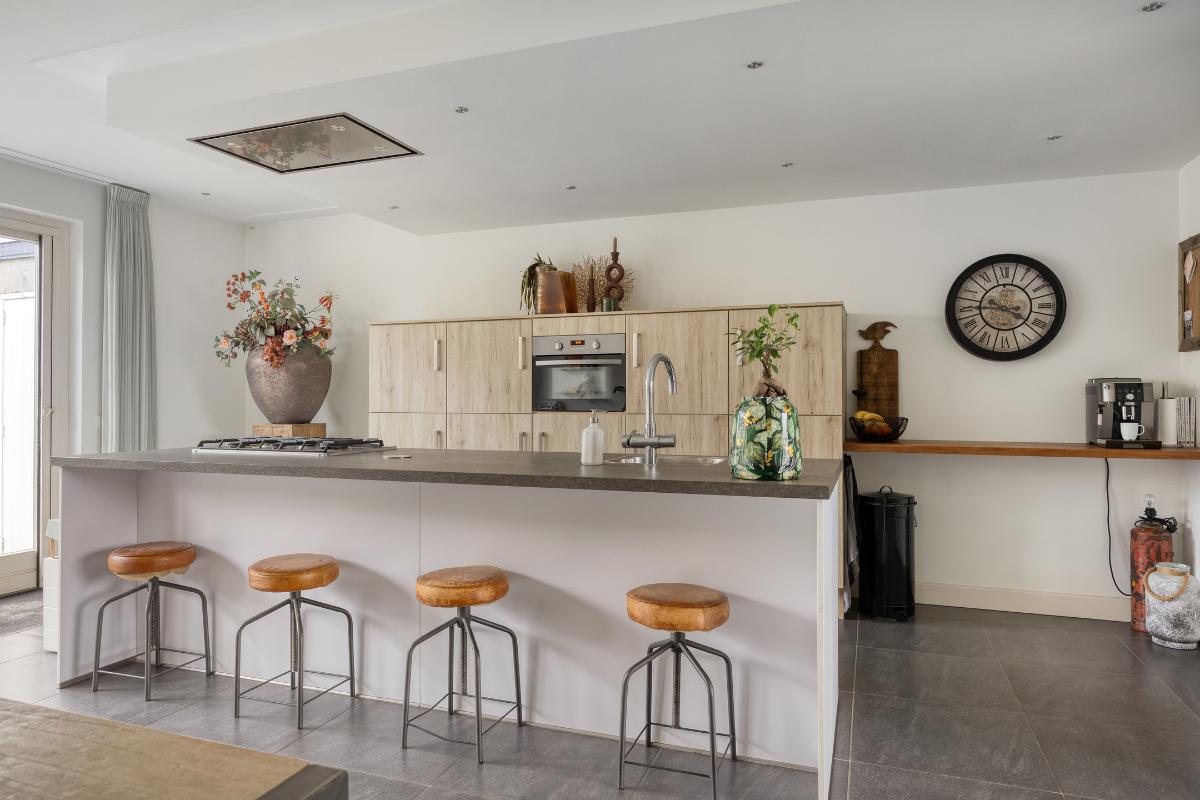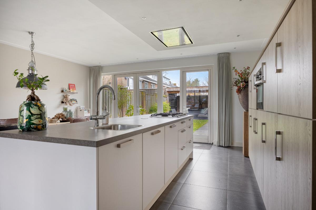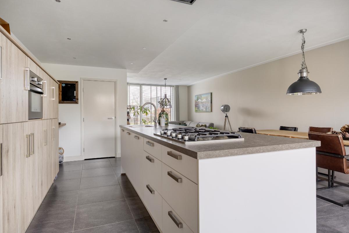 De woonkamer is royaal uitgebouwd en vormt samen met de open keuken één grote, lichte leefruimte. De keuken is een echte eyecatcher en voorzien van een gigantisch kookeiland met barretje, spoelbak met kokend water kraan, 5-pits gasfornuis met plafondafzuiging. Ook beschikt de keuken over een grote kastenwand met enorm veel bergruimte en inbouwapparatuur, waaronder een combi-oven, koelkast en diepvries.