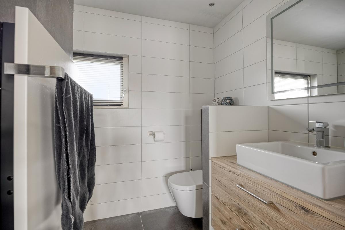 De moderne badkamer is compleet uitgevoerd met een inloopdouche, wastafelmeubel, wandcloset en designradiator.